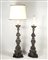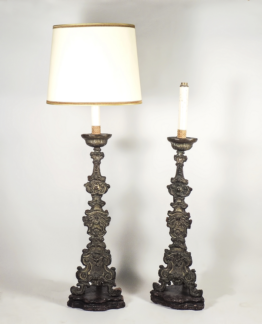COPPIA DI TORCIERE IN LEGNO LACCATO RIVESTITE IN TOLE SBALZATA metà del XVIII secolo fusto sagomato a vaso con motivi rocaille, predisposte per l'applicazione elettrica, corredate di paralumi h cm 106