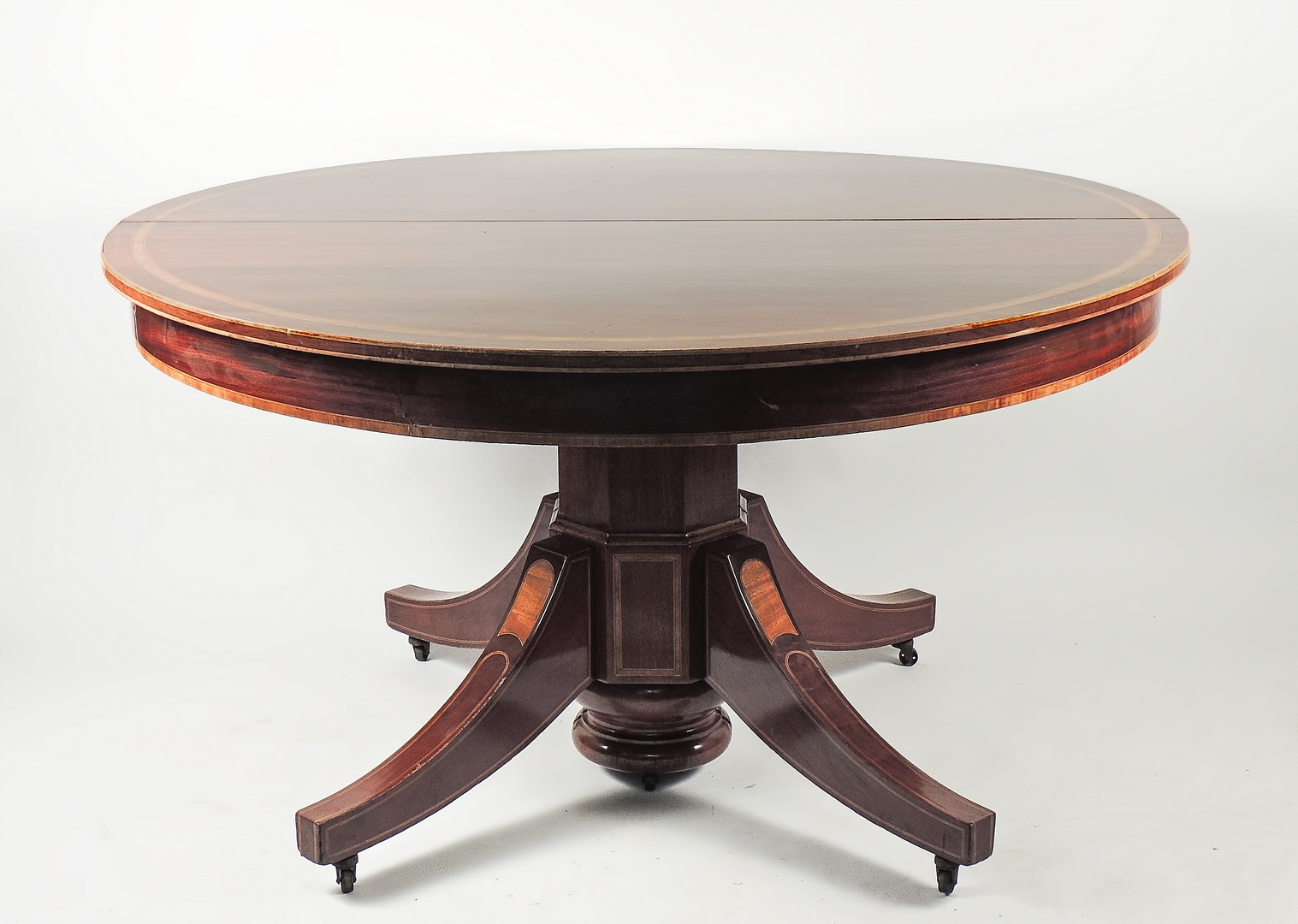 GRANDE TAVOLO DA PRANZO IN MOGANO Inghilterra, inizio del XX secolo piano circolareintarsiato con filettature, fusto a colonna ottagonale, gambe mosse, corredato da due prolunghe originali in mogano con filettature h cm 75 diam, cm 137; misura massima del piano cm 137x287
