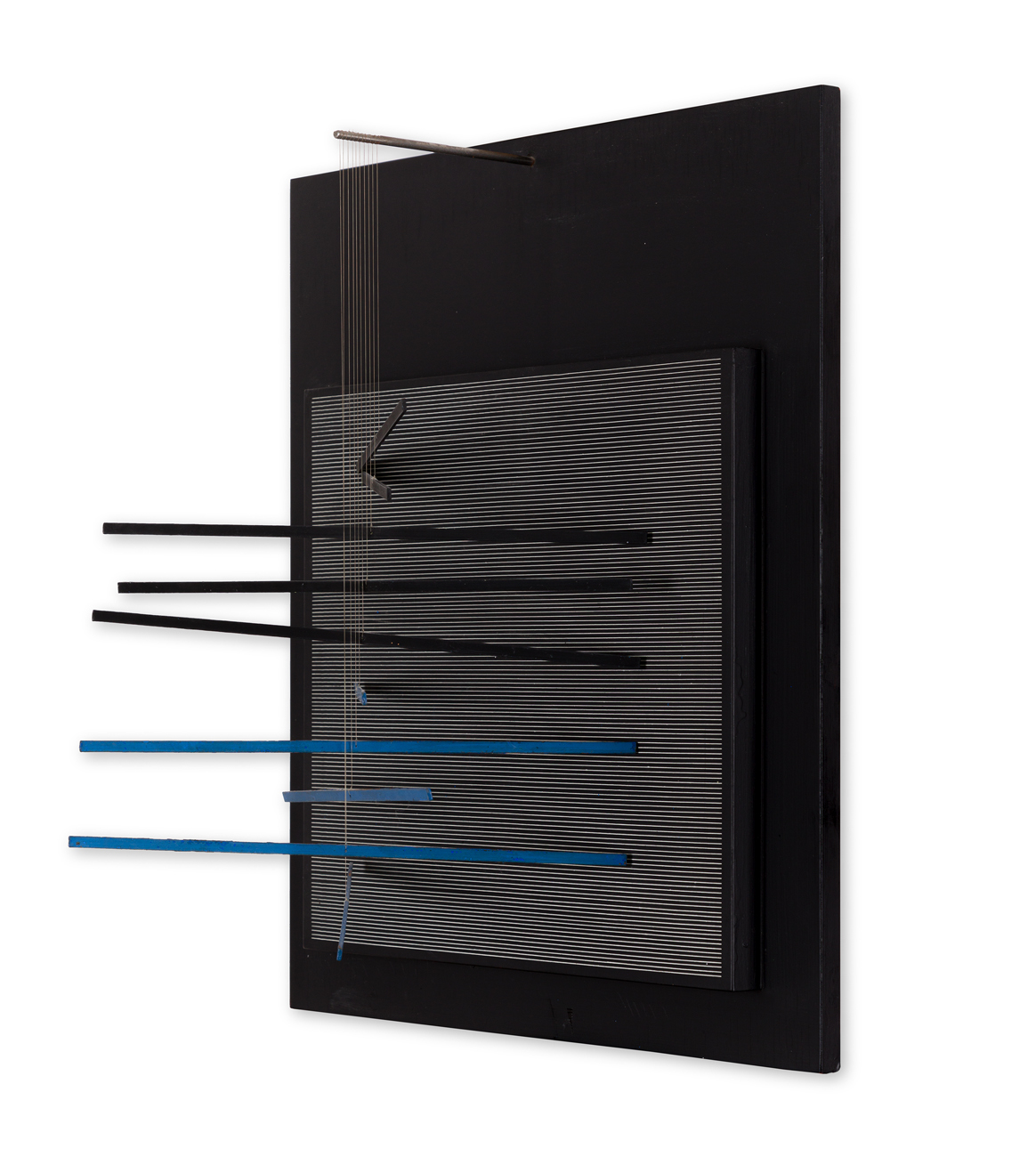 Serigrafia su legno con filo di nylon e aste in metallo verniciato