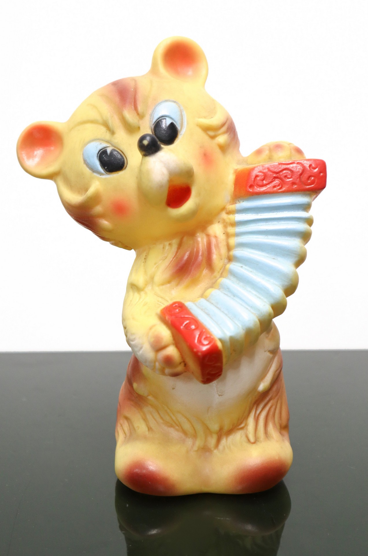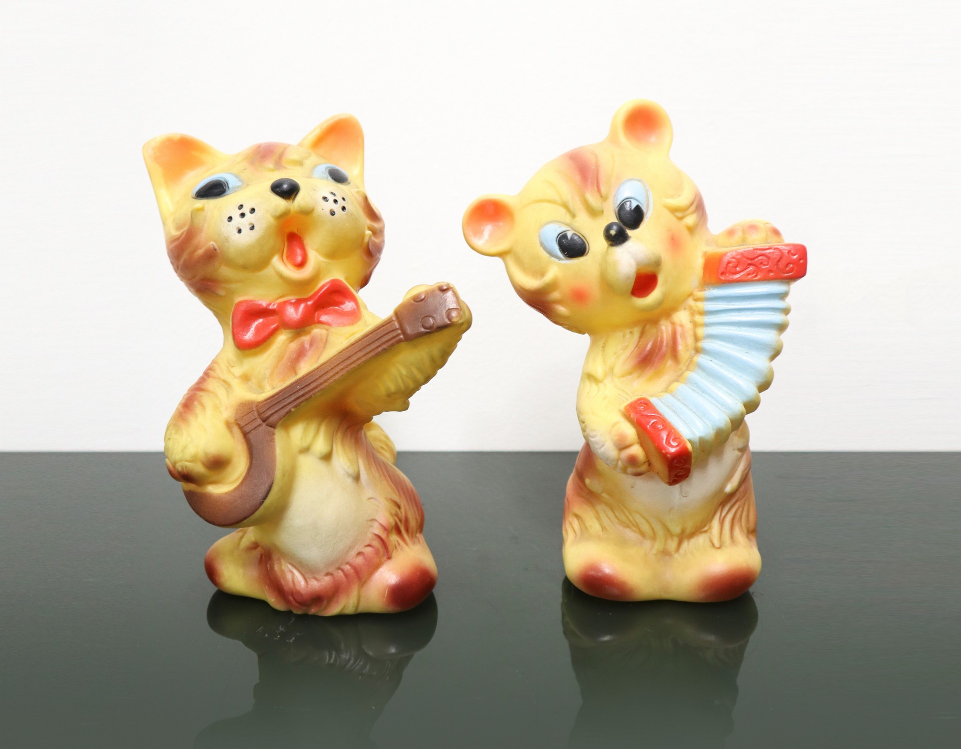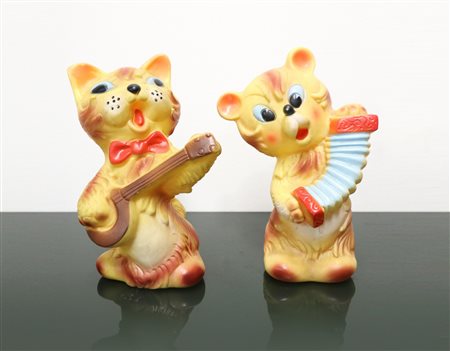 Ledra Gomma/ Ledra Plastic - Gatto e Orso musicanti, 1960 Coppia pupazzi in gomma con sonaglio, orso con fisarmonica e gatto con chitarra.Coppia pupazzi in gomma con sonaglio, orso con fisarmonica e gatto con chitarra.