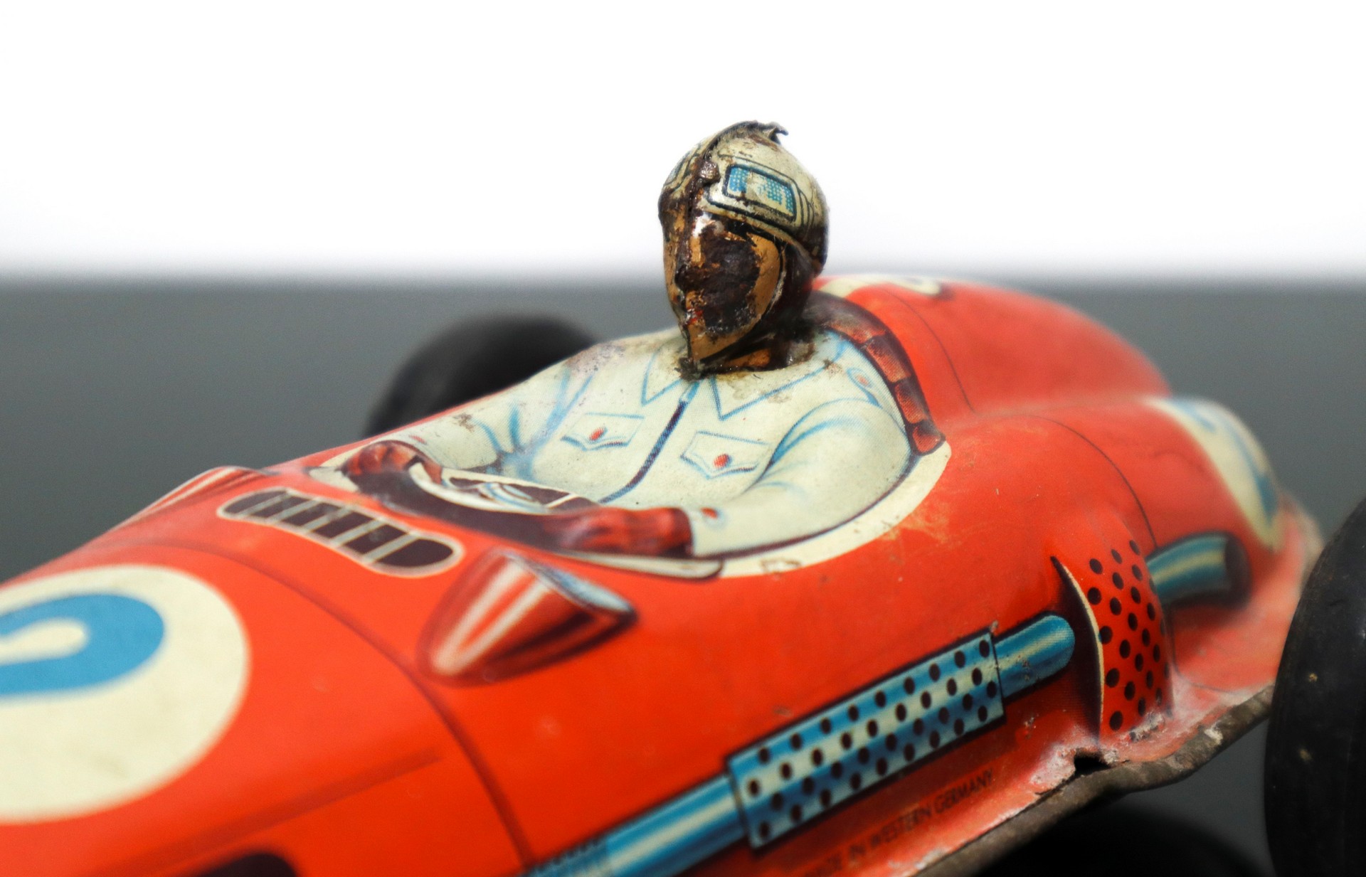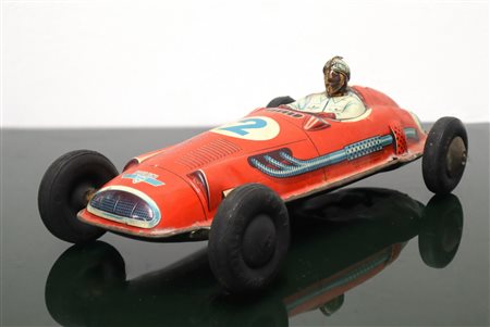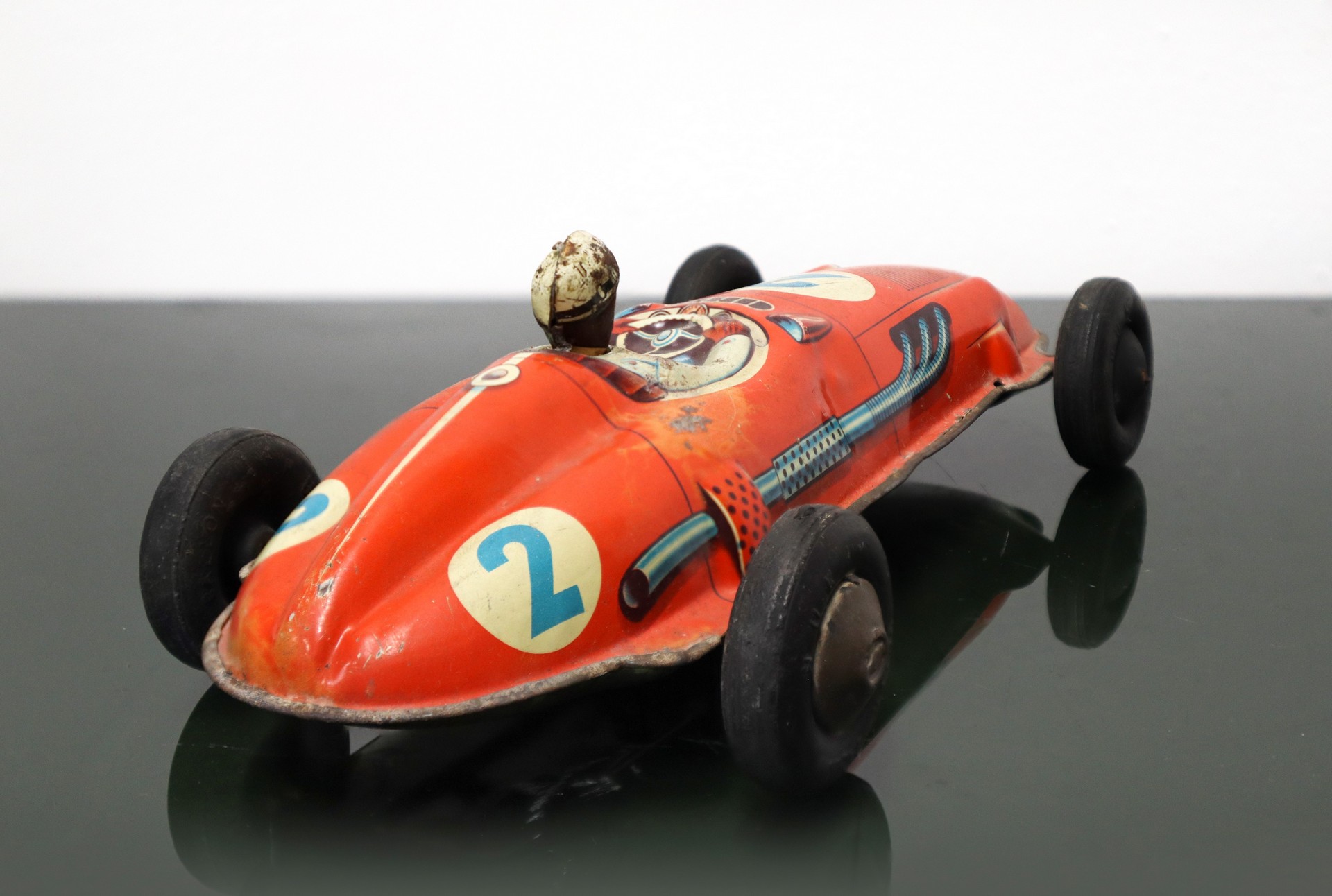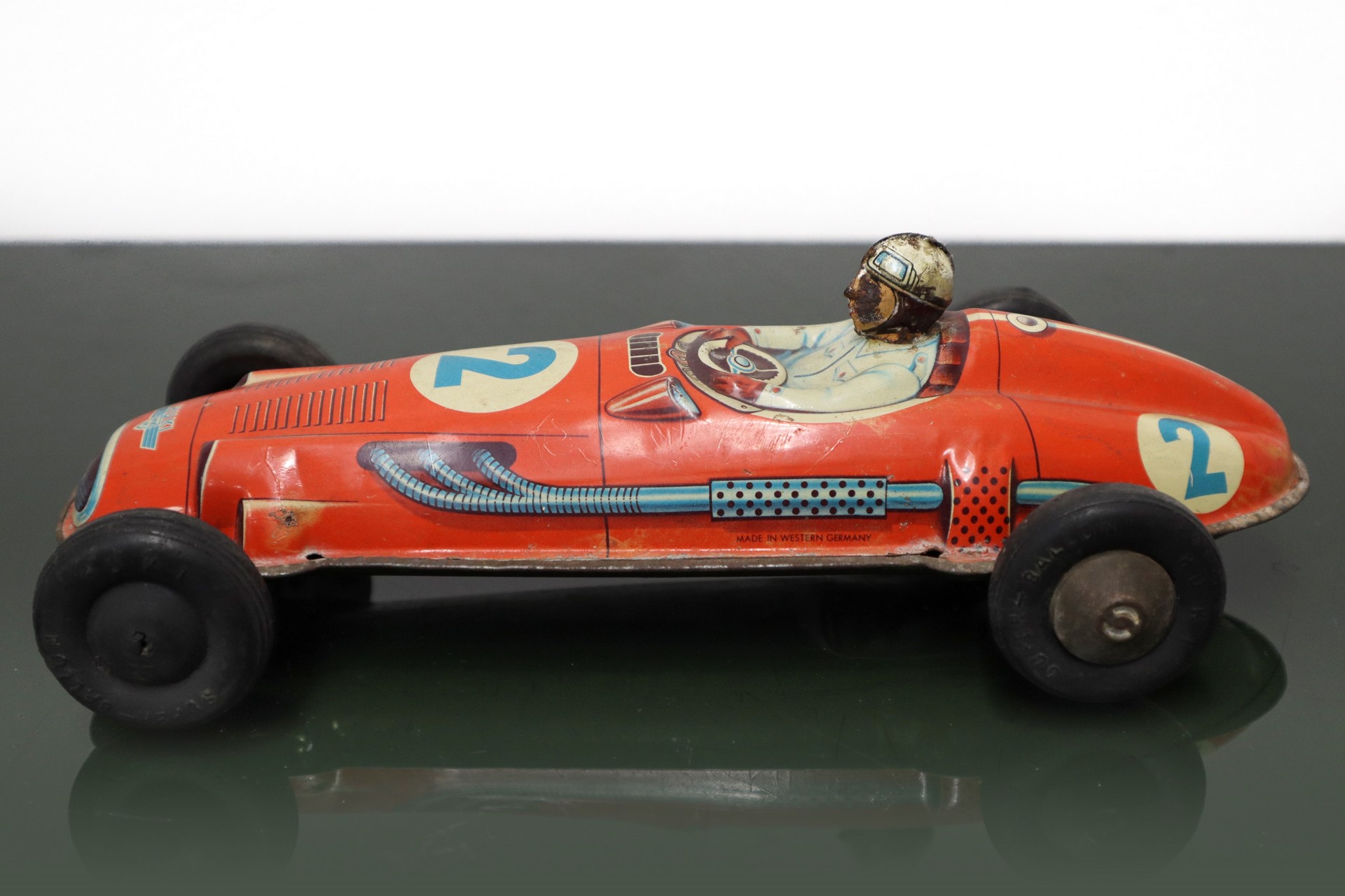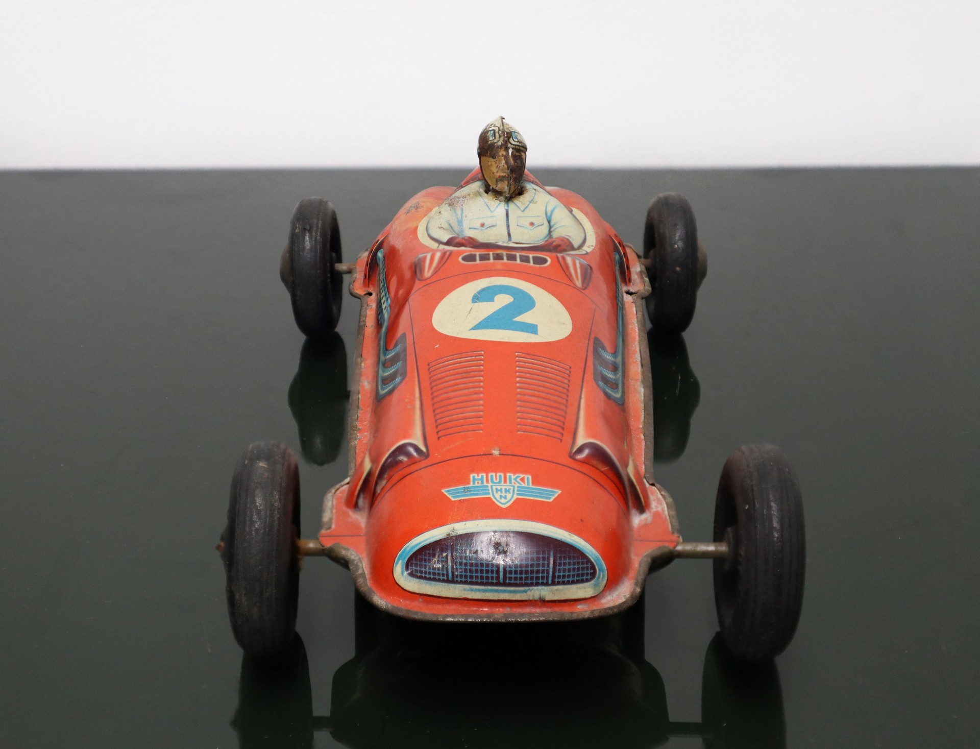 Huki - Auto da corsa , 1950 cm 23 x 10 Auto in latta, numerata 2, Made in Germany, presenti segni di ruggineAuto in latta, numerata 2, Made in Germany, presenti segni di ruggine