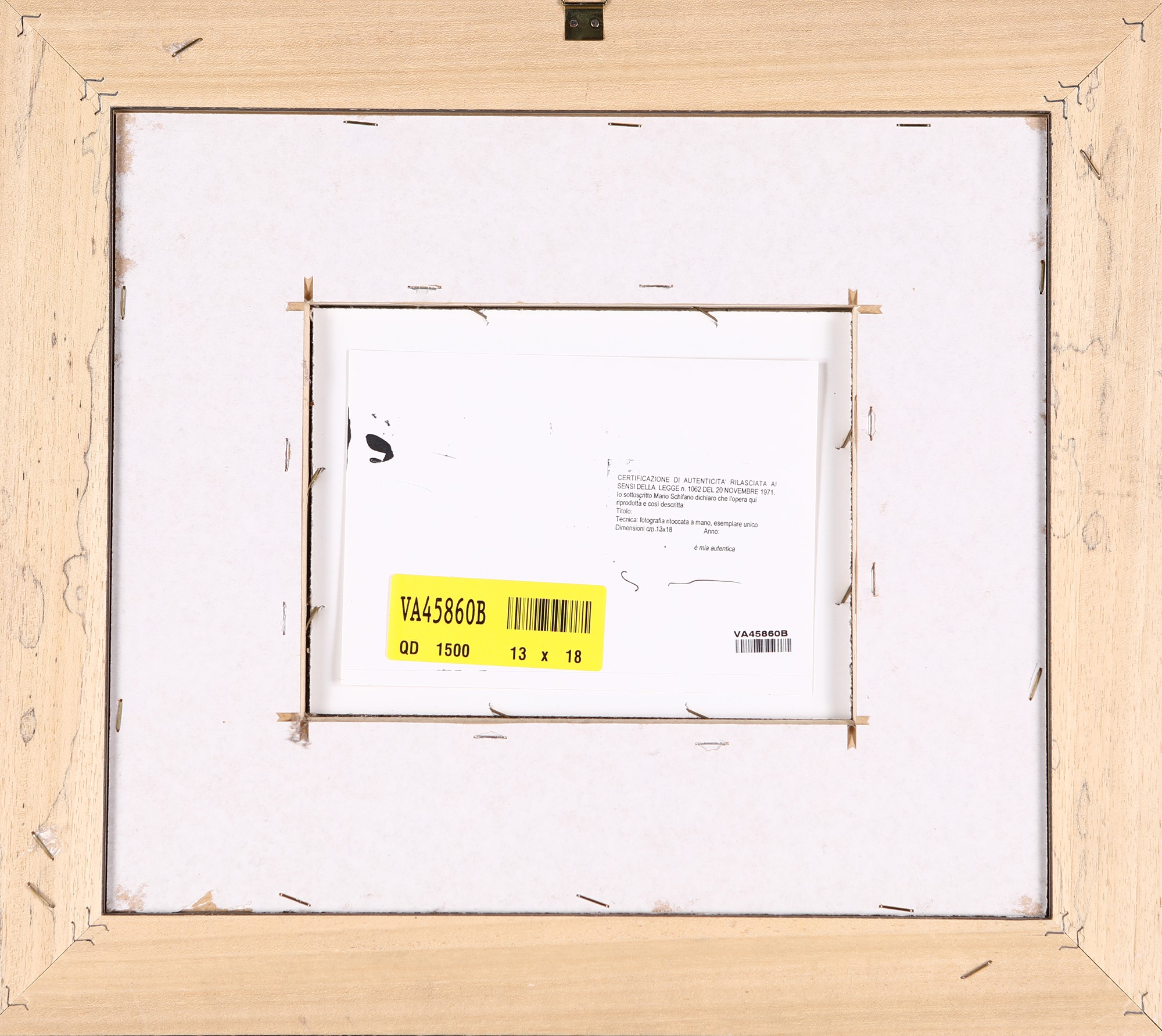 Certificato di autenticità rilasciato nel 2007 dalla Fondazione Mario Schifano