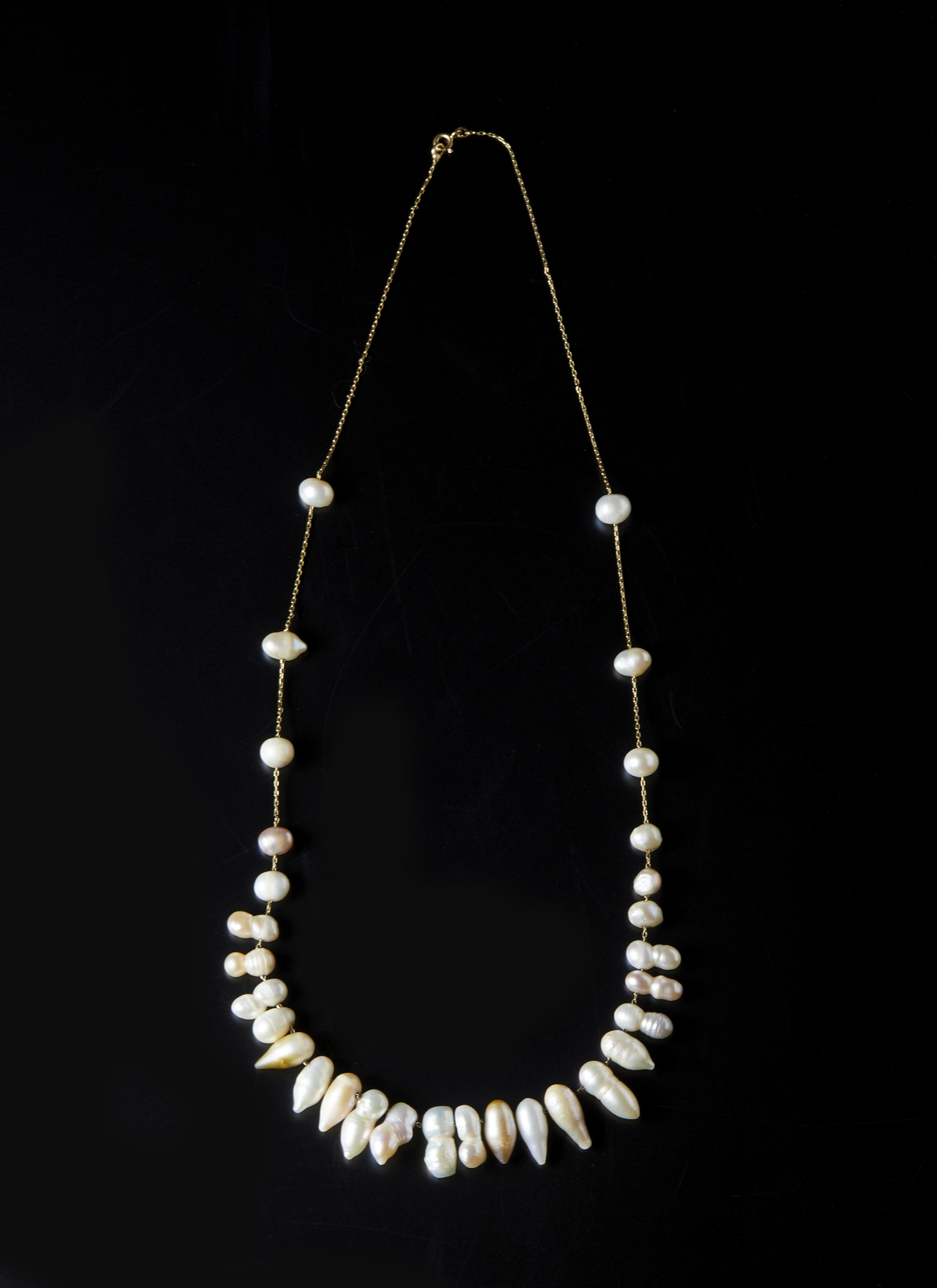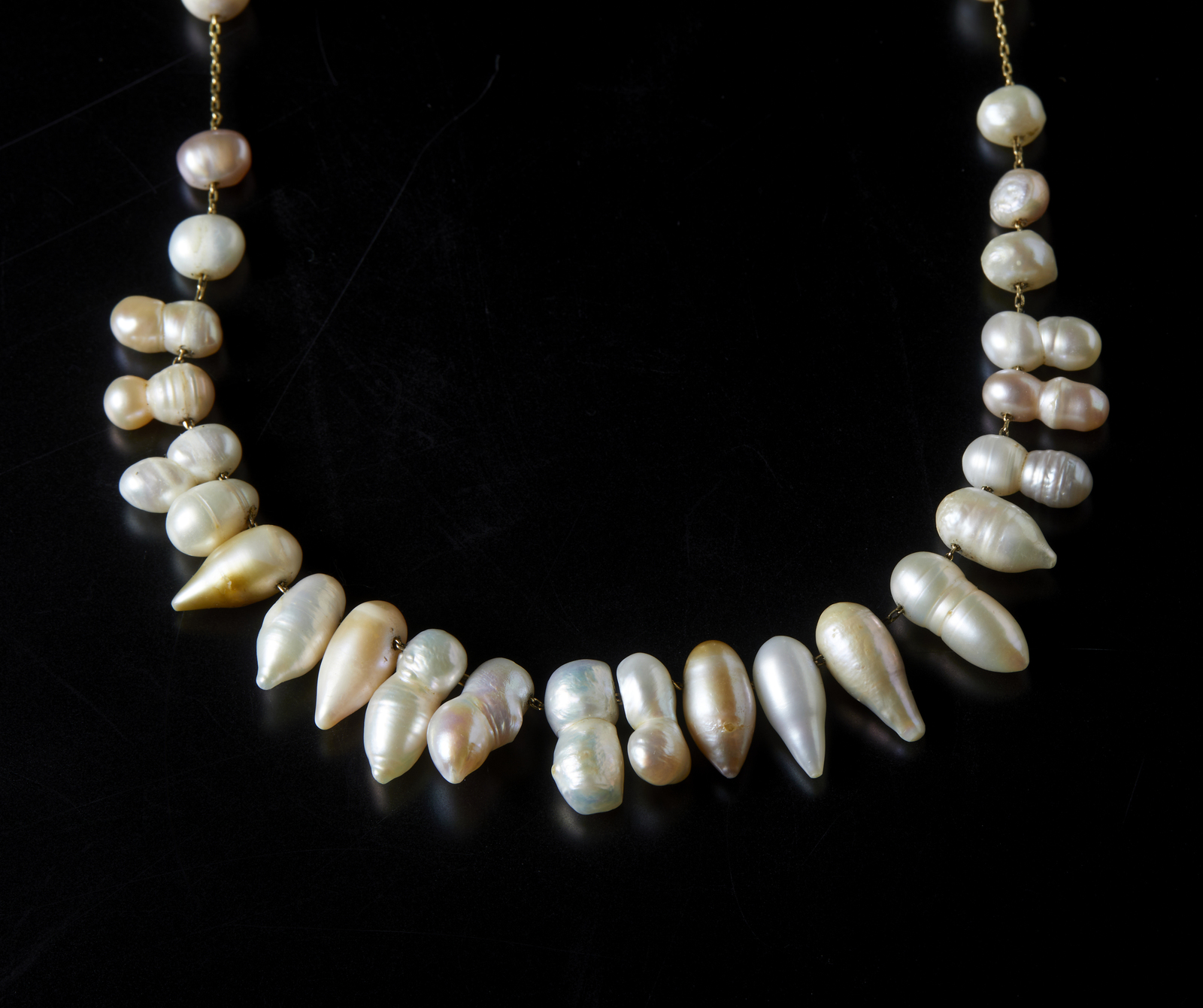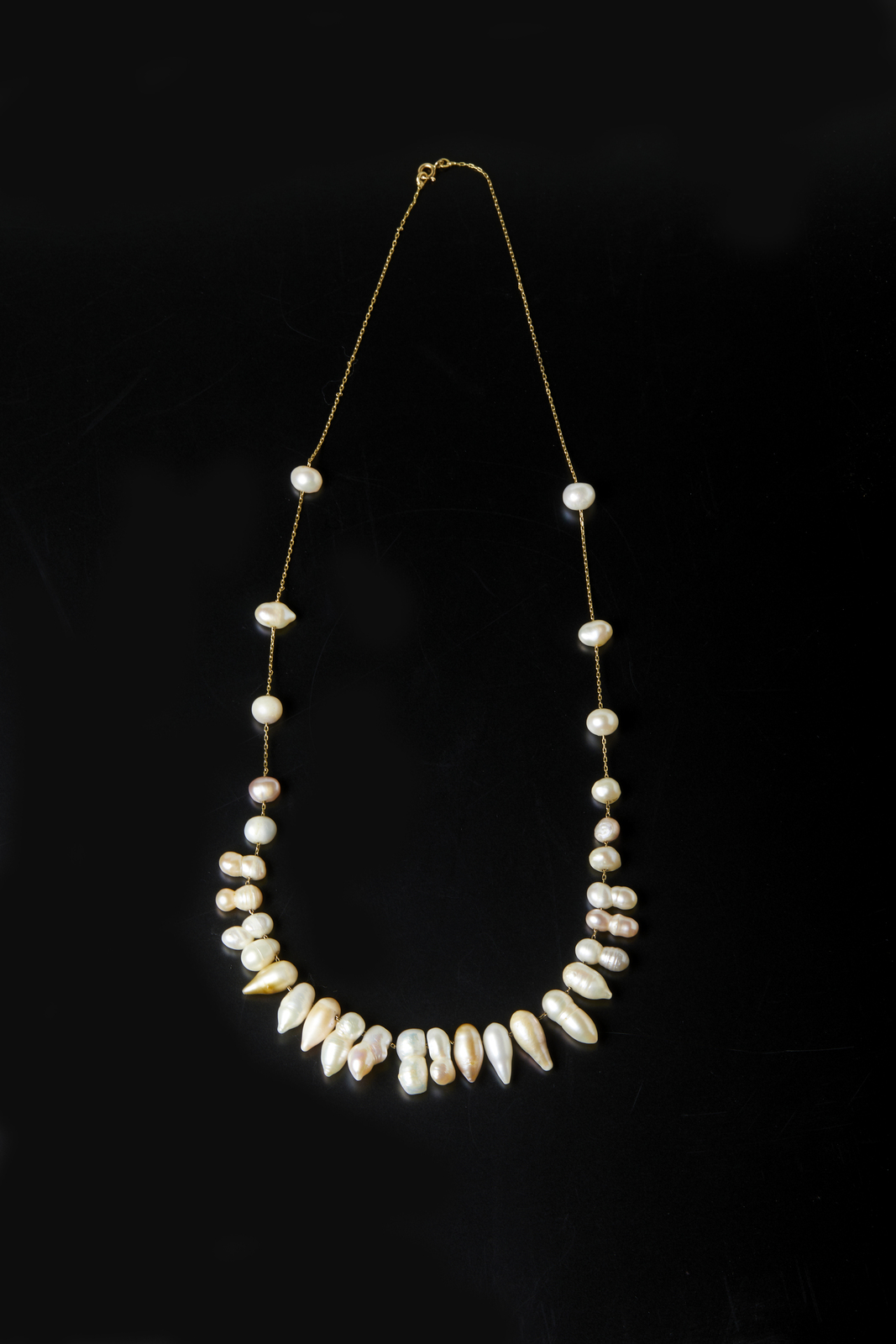 . Catenina in oro giallo 750/1000 con e perle coltivate scaramazze. . Cm 60,00. Peso lordo: 30,60 grammi