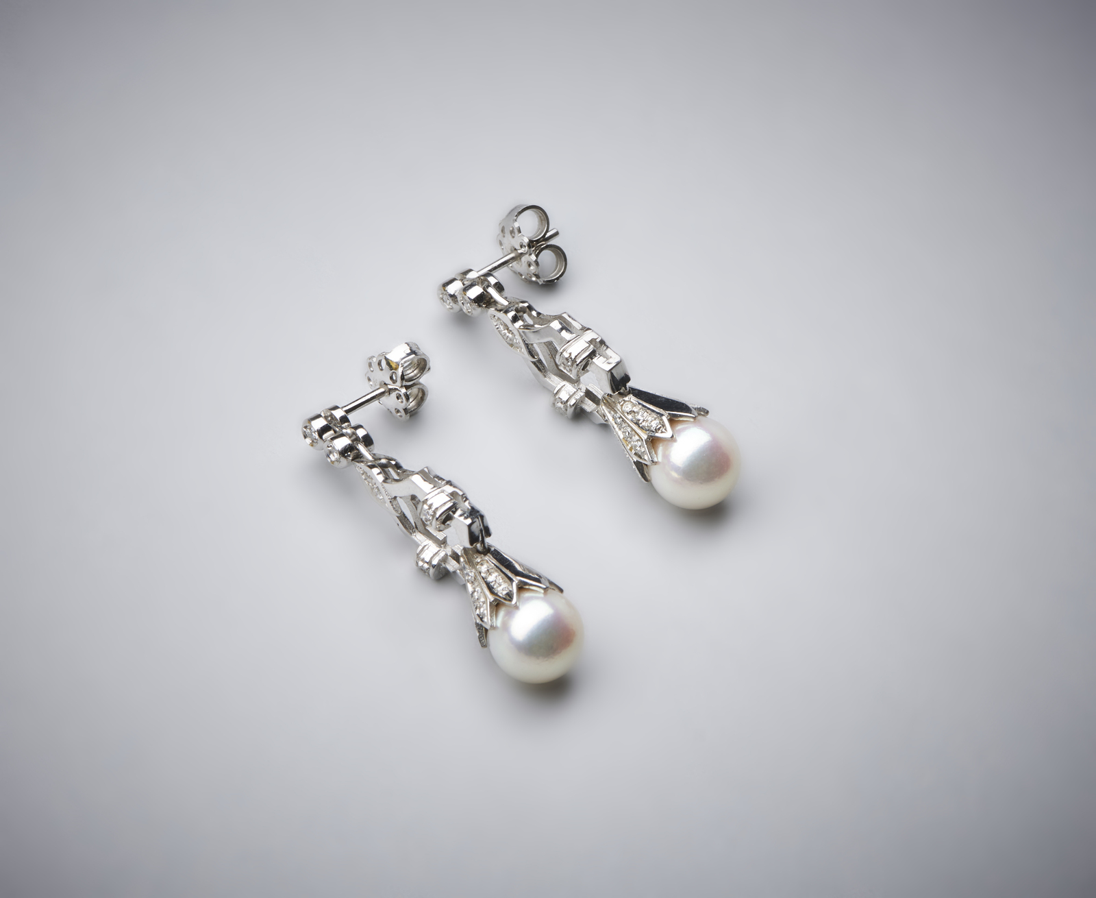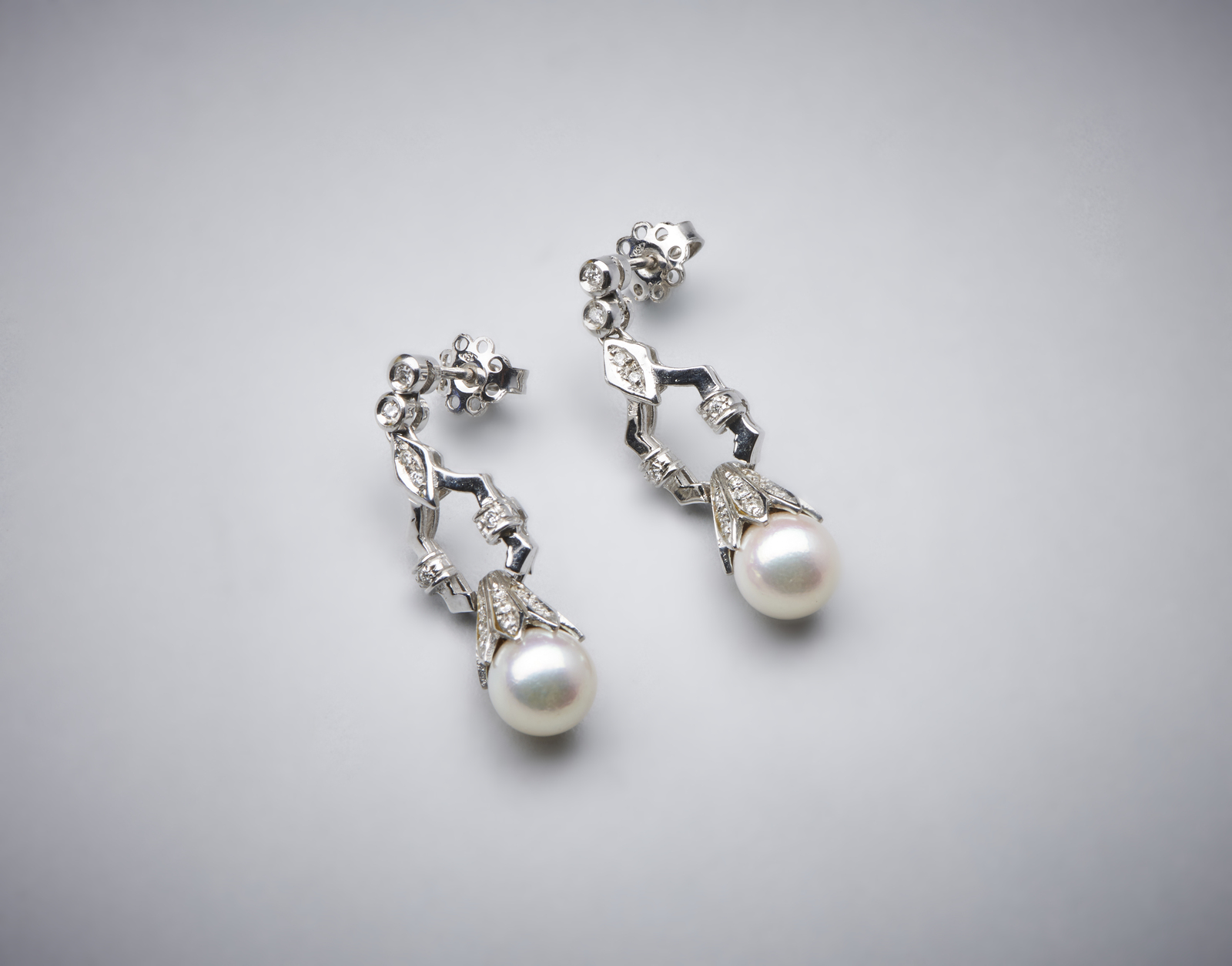 . Orecchini pendenti in oro bianco 750/1000 con coppia di perle sferiche bianche coltivate di mm 8,50 e piccoli diamanti bianchi di taglio misto di 0,80 ct. circa. . . Peso lordo 9,52 gr.