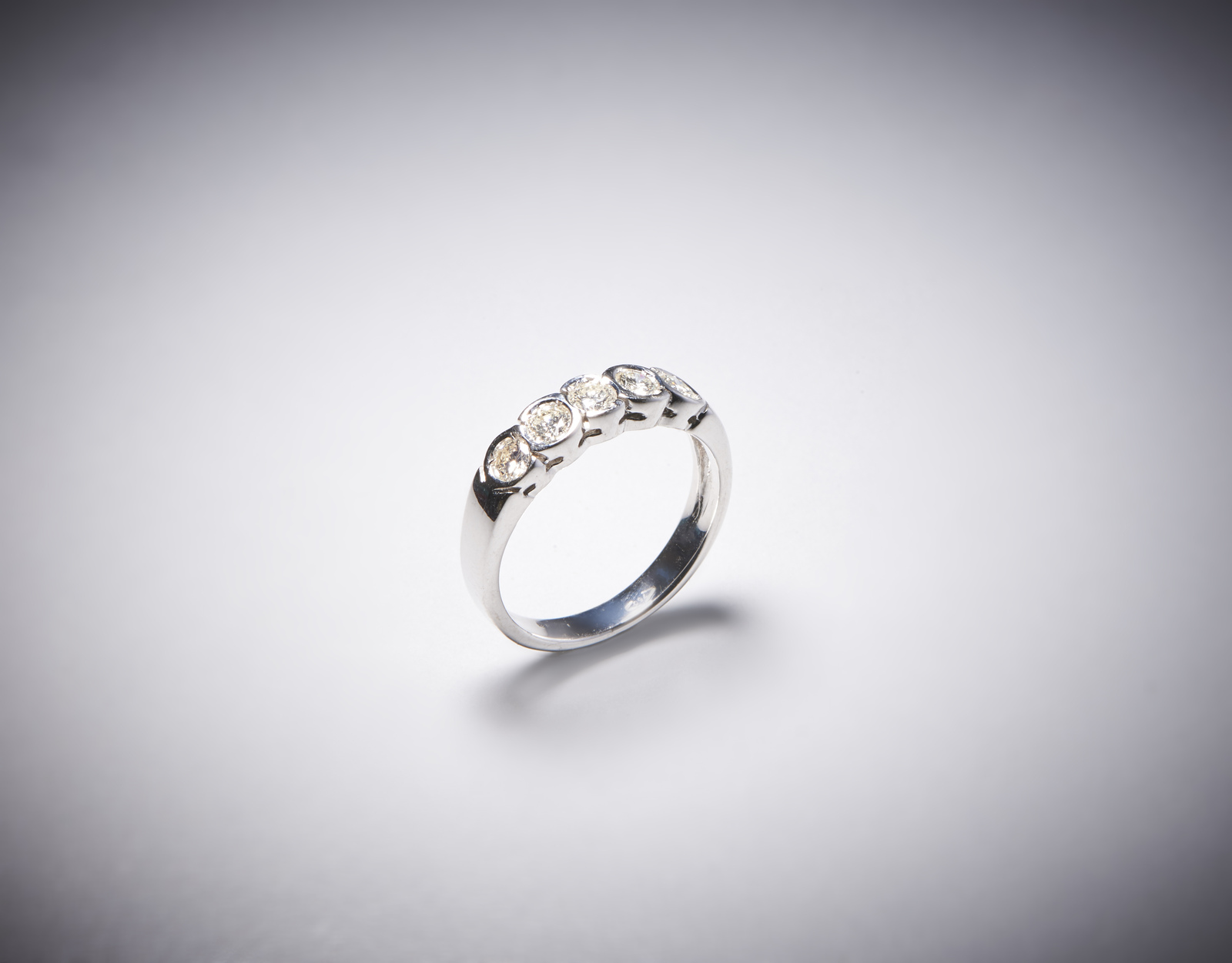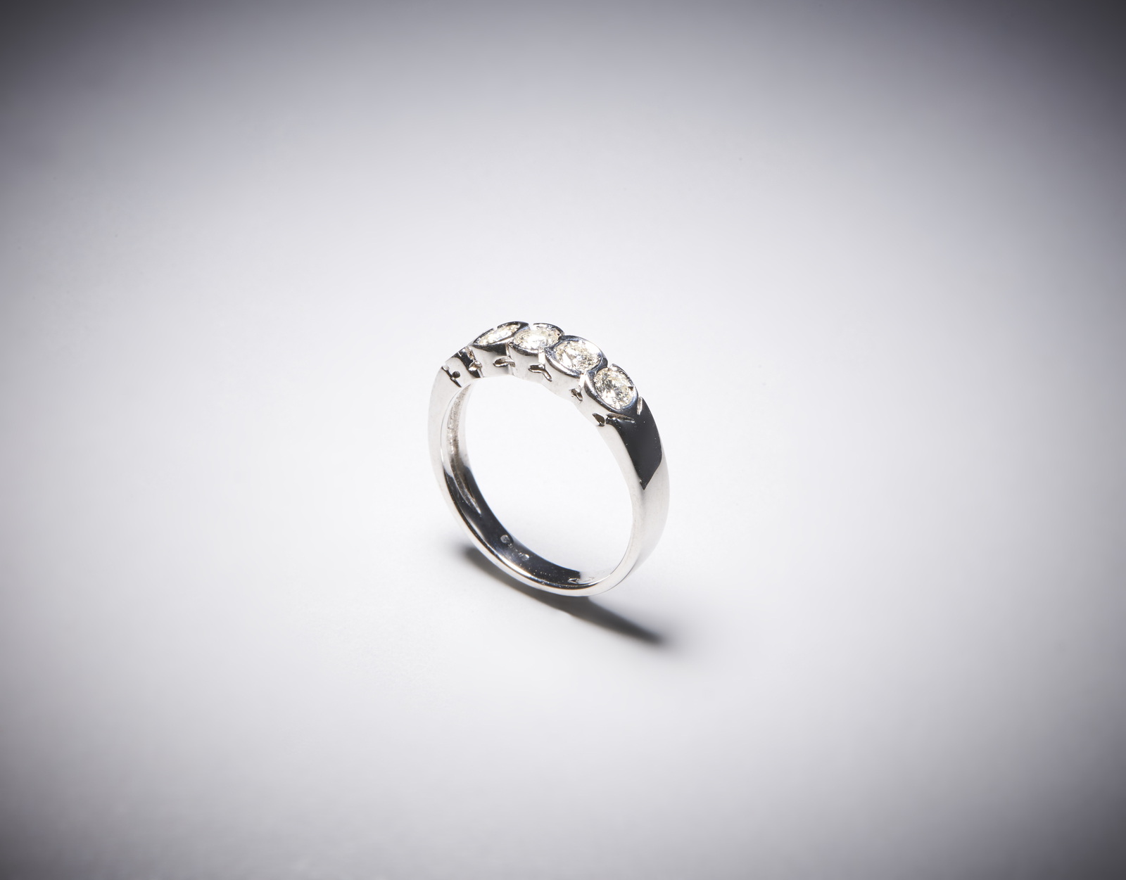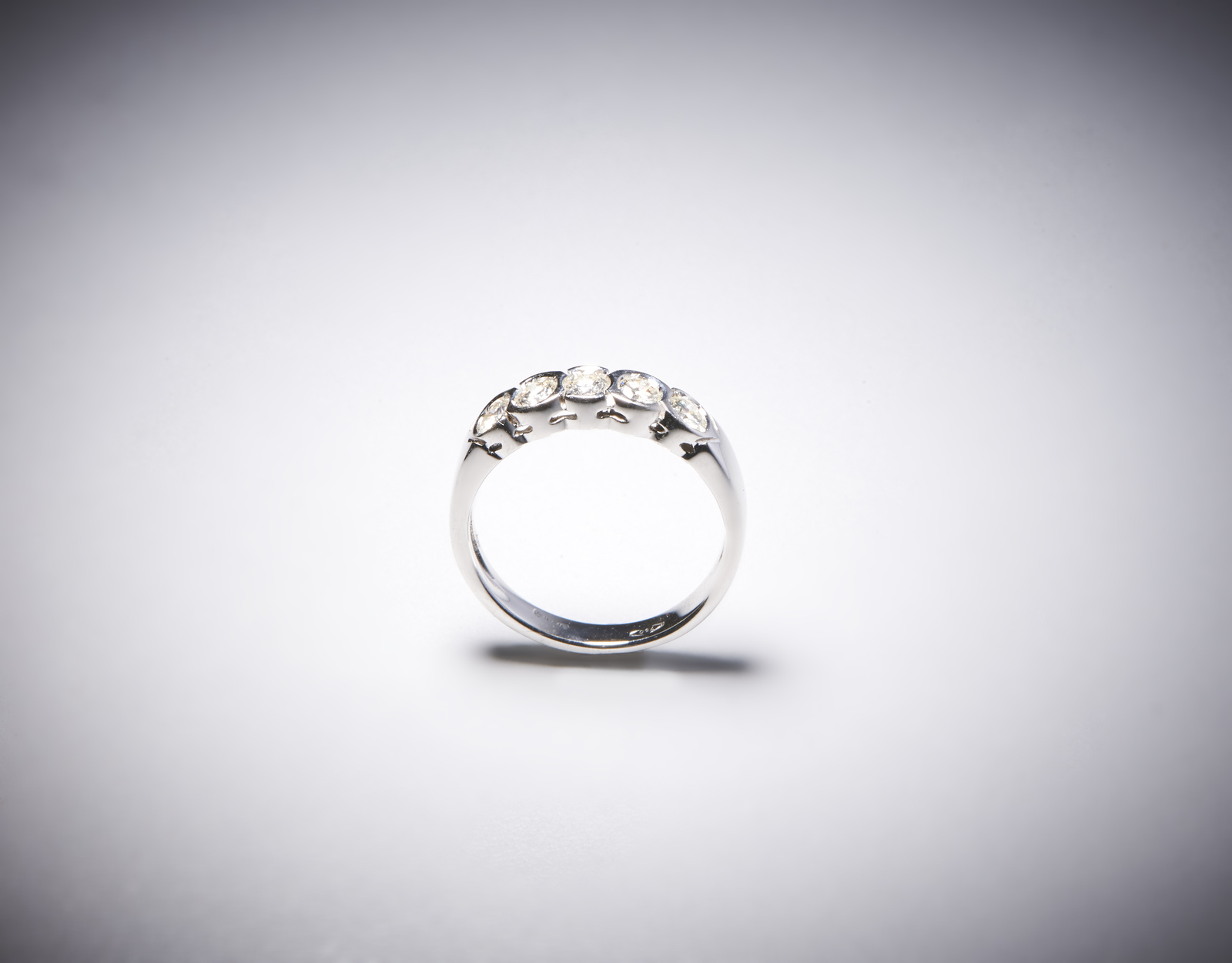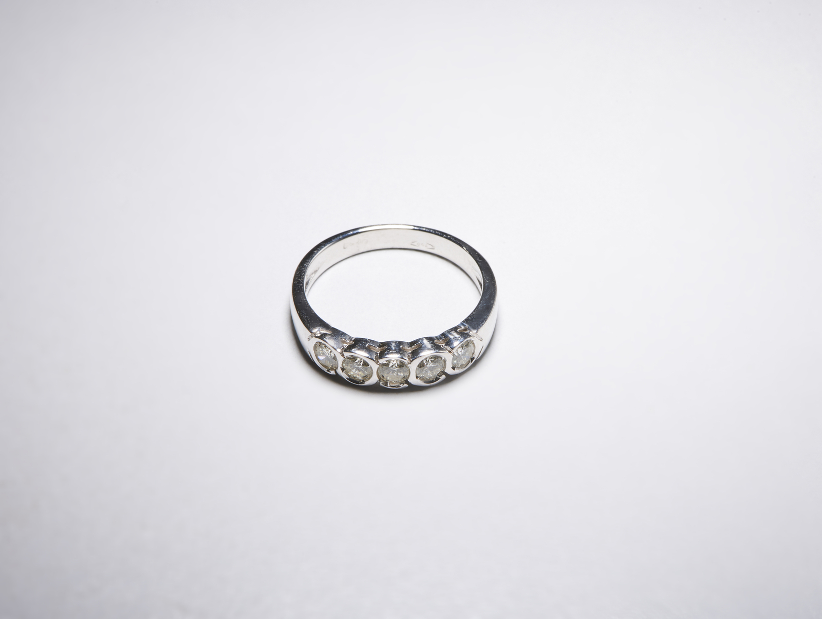 . Anello a cinque pietre in oro bianco 750/1000 tipo fedina per 1,00 ct tot circa. . . Peso lordo 3,66 gr.
