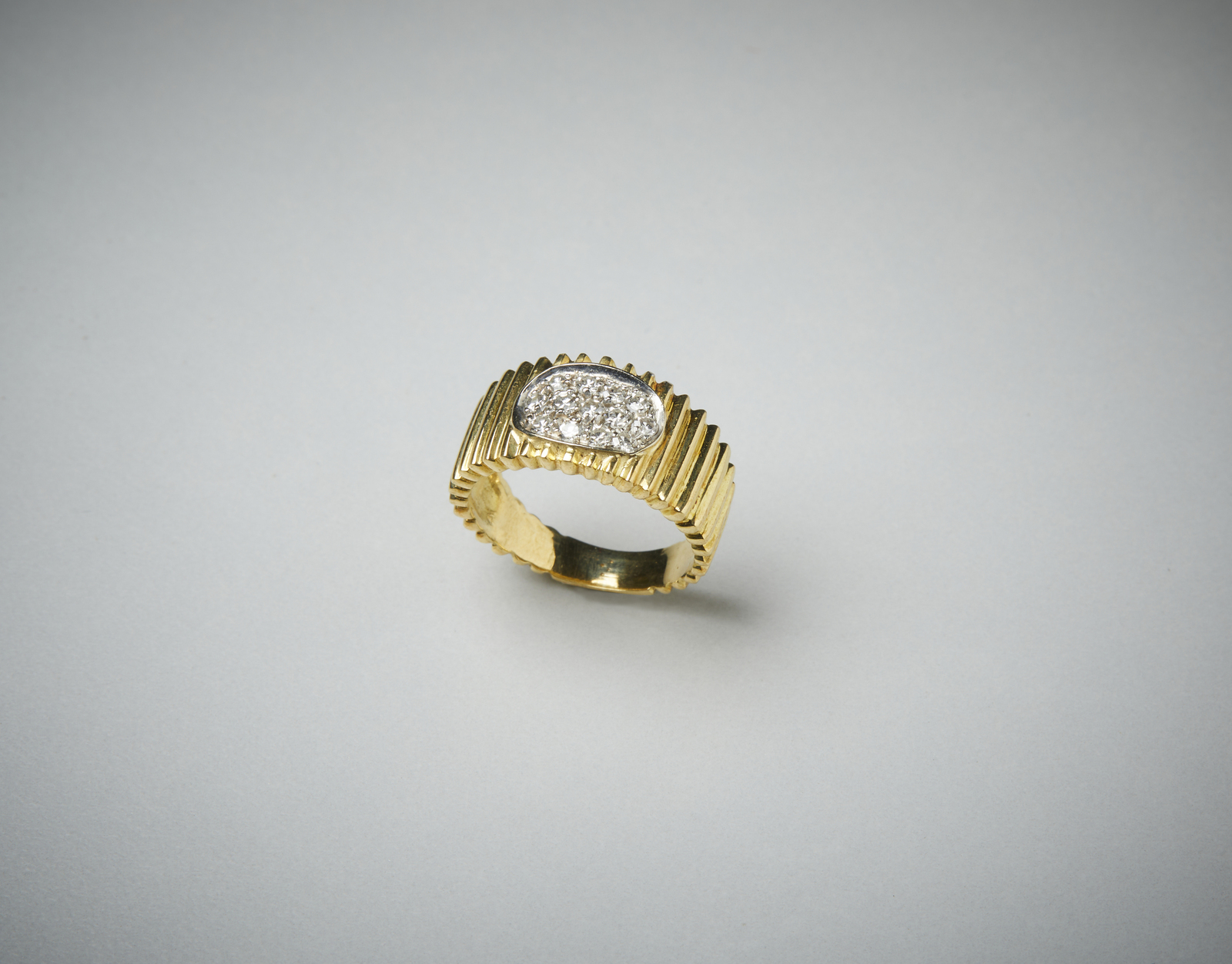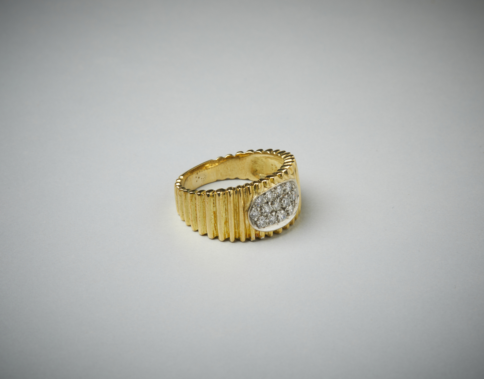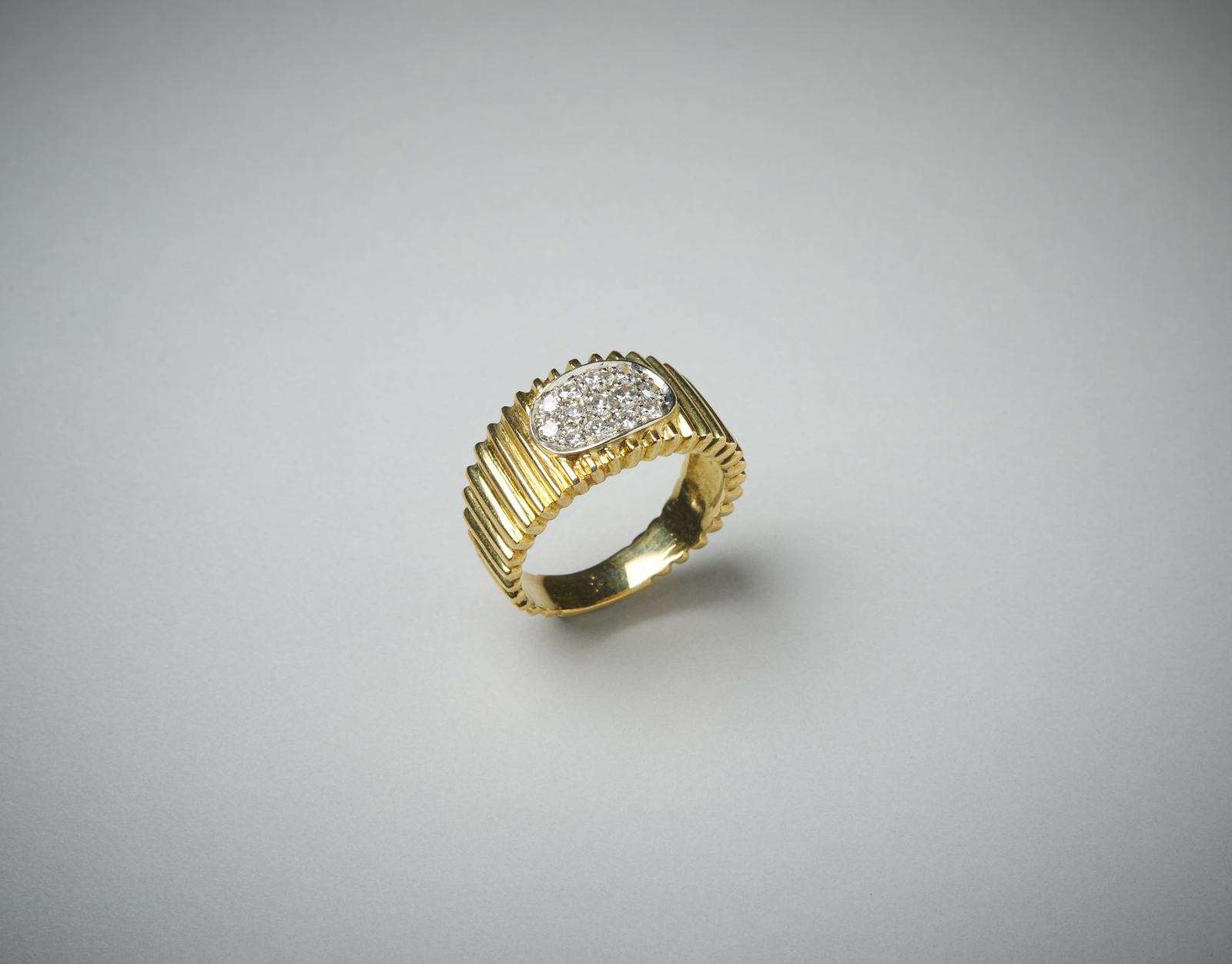 . - Anello a fascetta rigata in oro giallo 750 con pavè di diamanti bianchi taglio huit huit, totale carati: 0.40 circa.