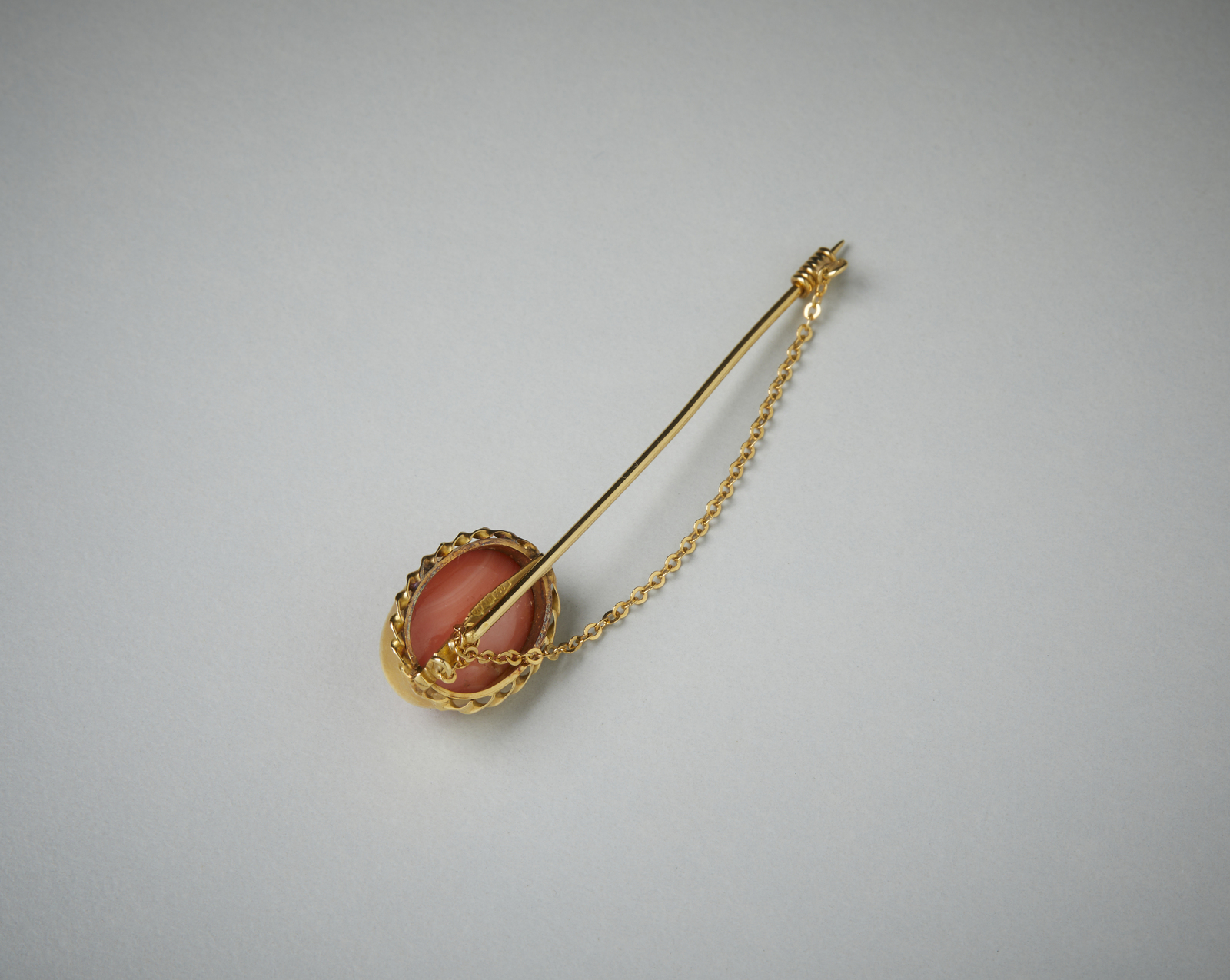 Lotto 62 | . - Spilla da giacca in oro giallo 750/1000 con corallo rosa cabochon.