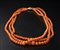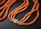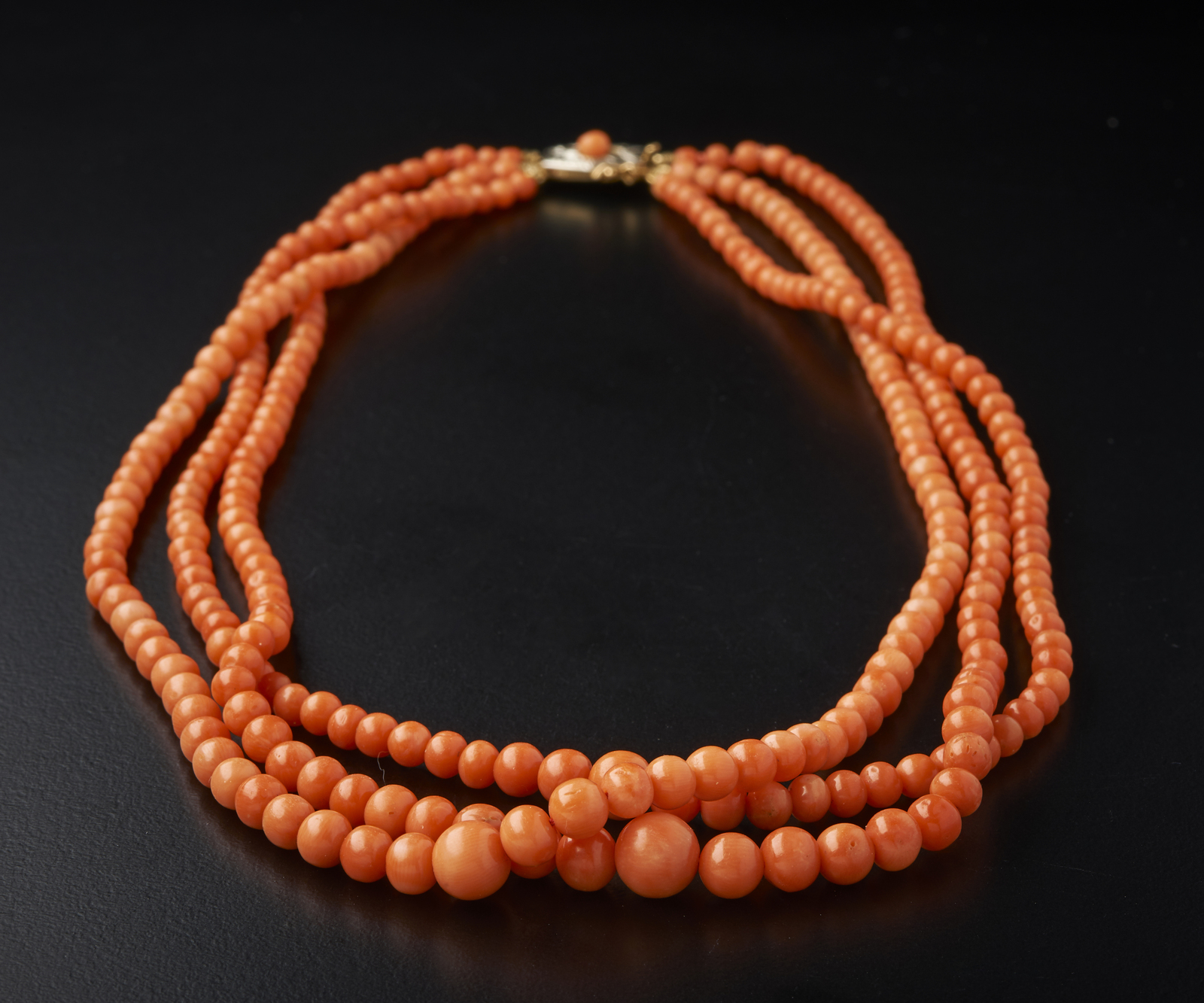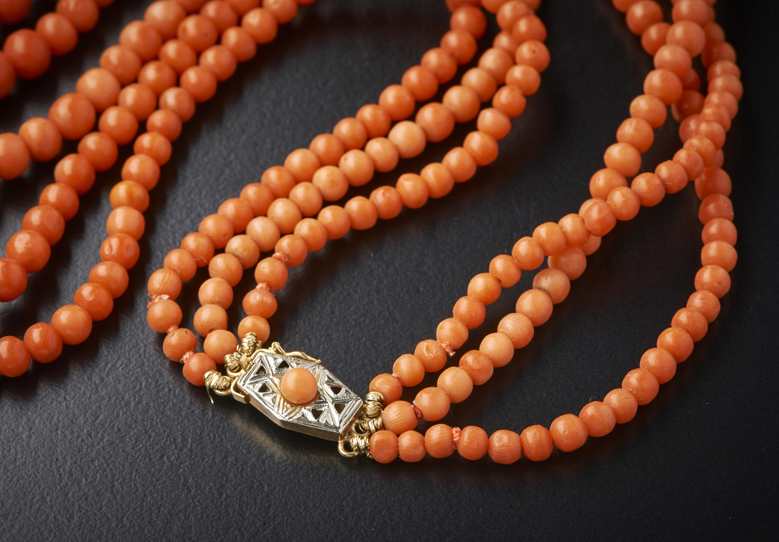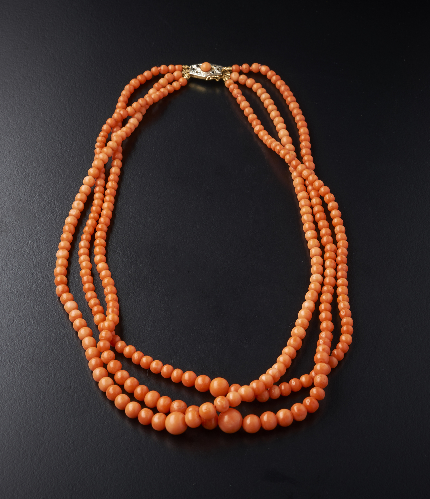 . - Collana di corallo a tre fili leggermente degradè con chiusura in oro bianco e giallo 750/1000.