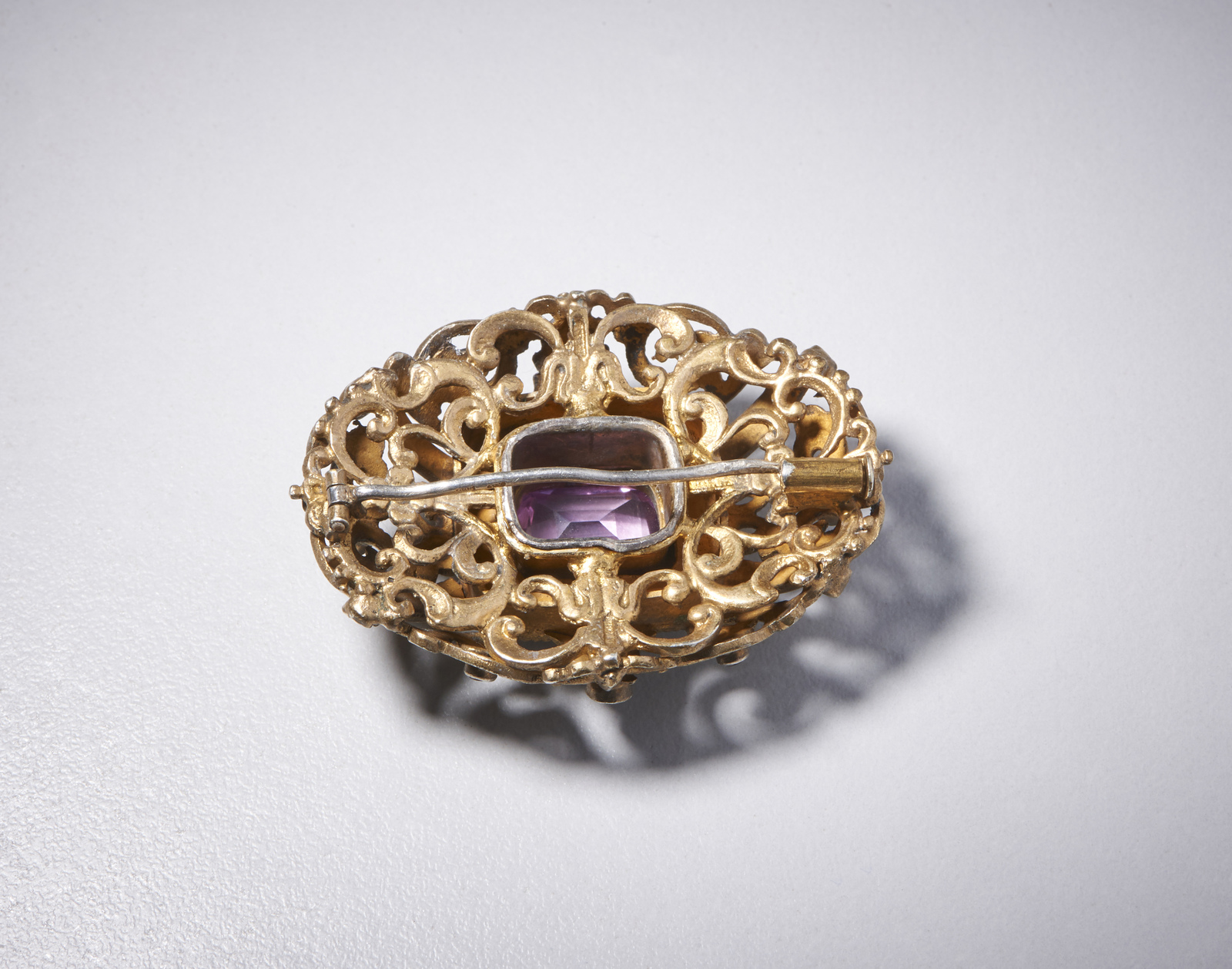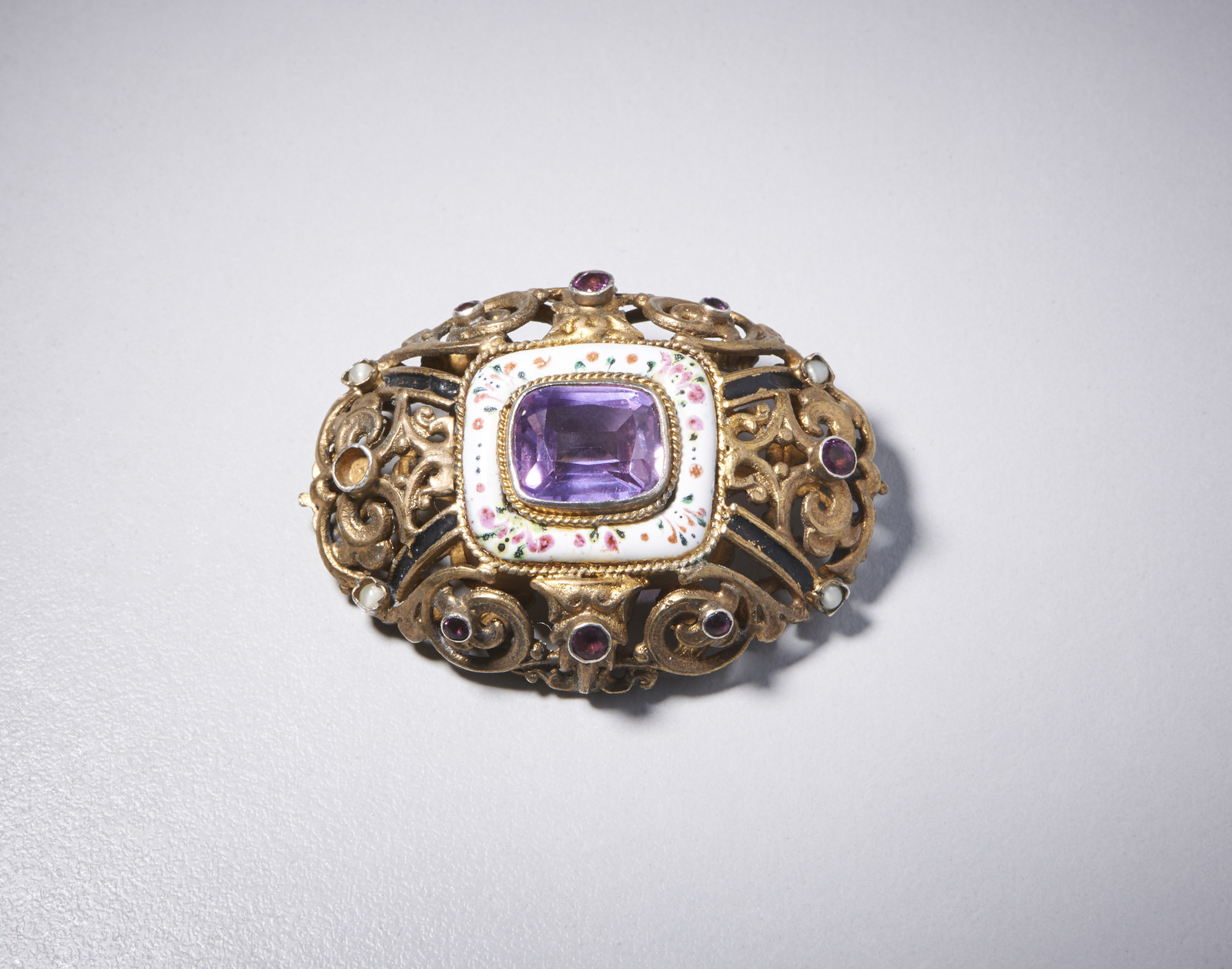 . - Spilla in argento con ametista centrale di circa 12 ct taglio a cuscino incastonata in porcellana decorata con smalti policromi e piccole ametiste. .