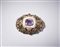 . Spilla in argento con ametista centrale di circa 12 ct taglio a cuscino incastonata in porcellana decorata con smalti policromi e piccole ametiste. . . . Anni '40. Peso lordo 21,71 gr. Hallmark PVA835