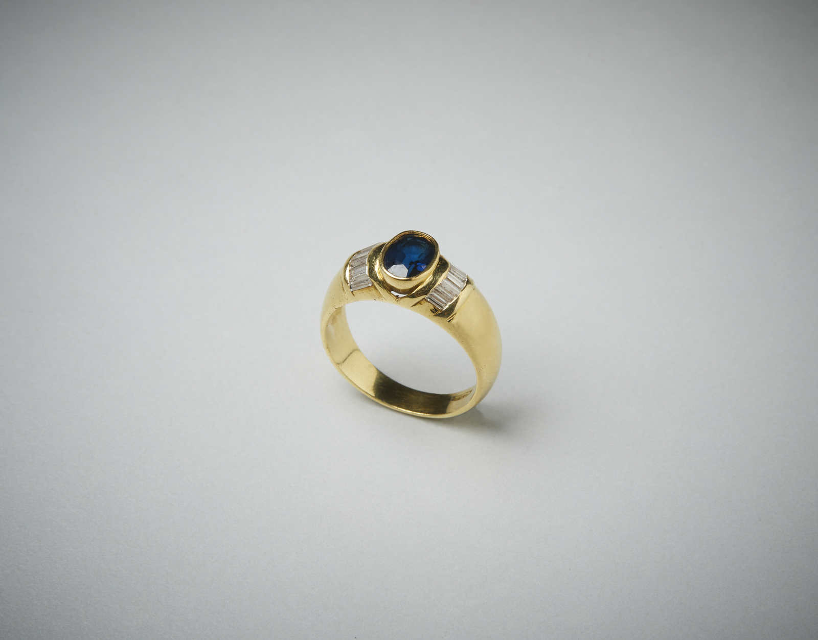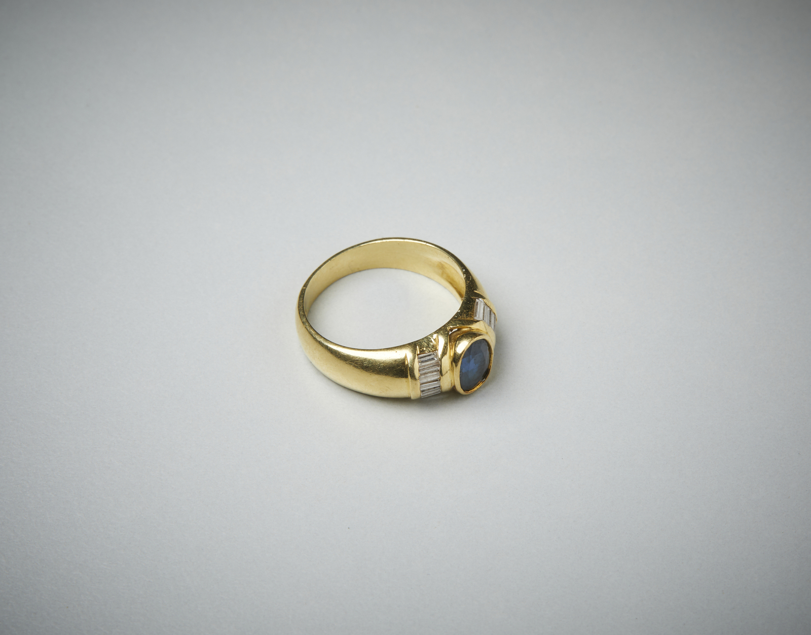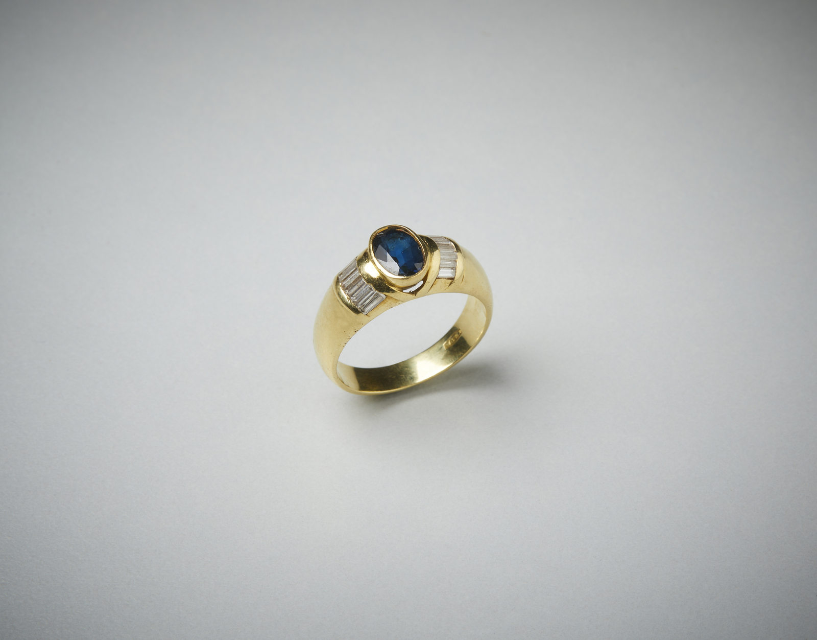 . Anello in oro giallo 750/1000 a fascetta con zaffiro blu ovale di 0.70 ct ca. e diamanti bianchi laterali taglio a baguette di 0.75 ct totali circa. . . . Peso lordo: 5,20 grammi