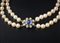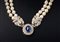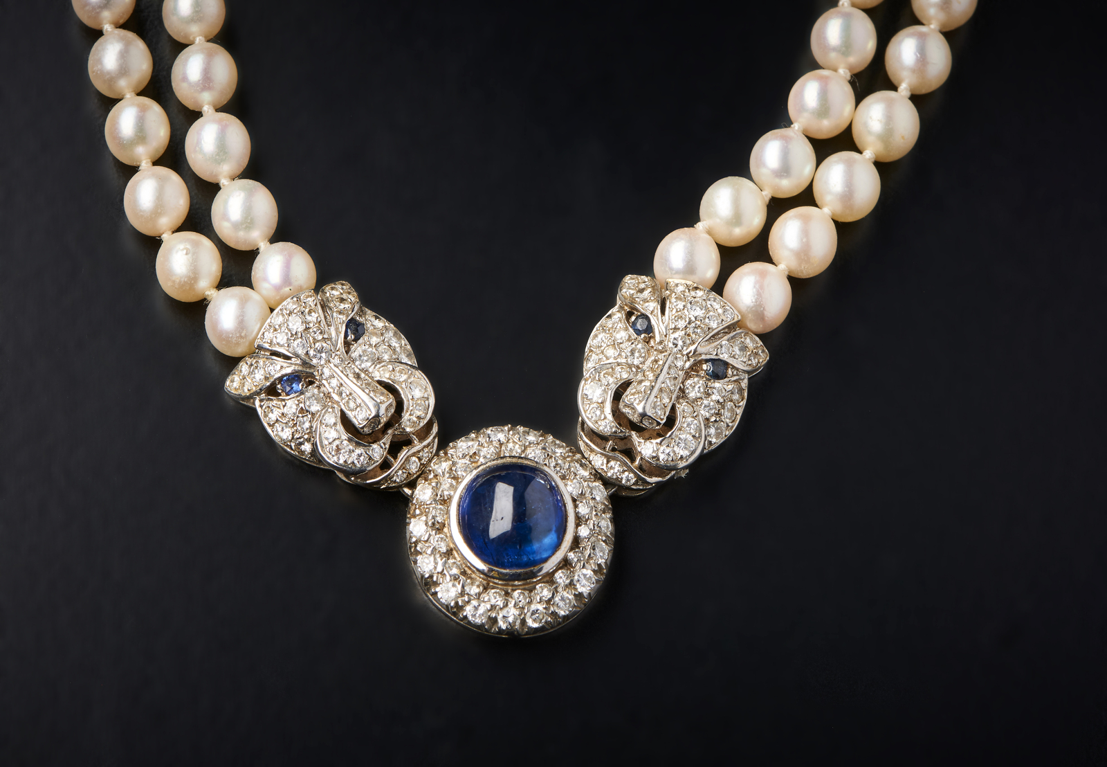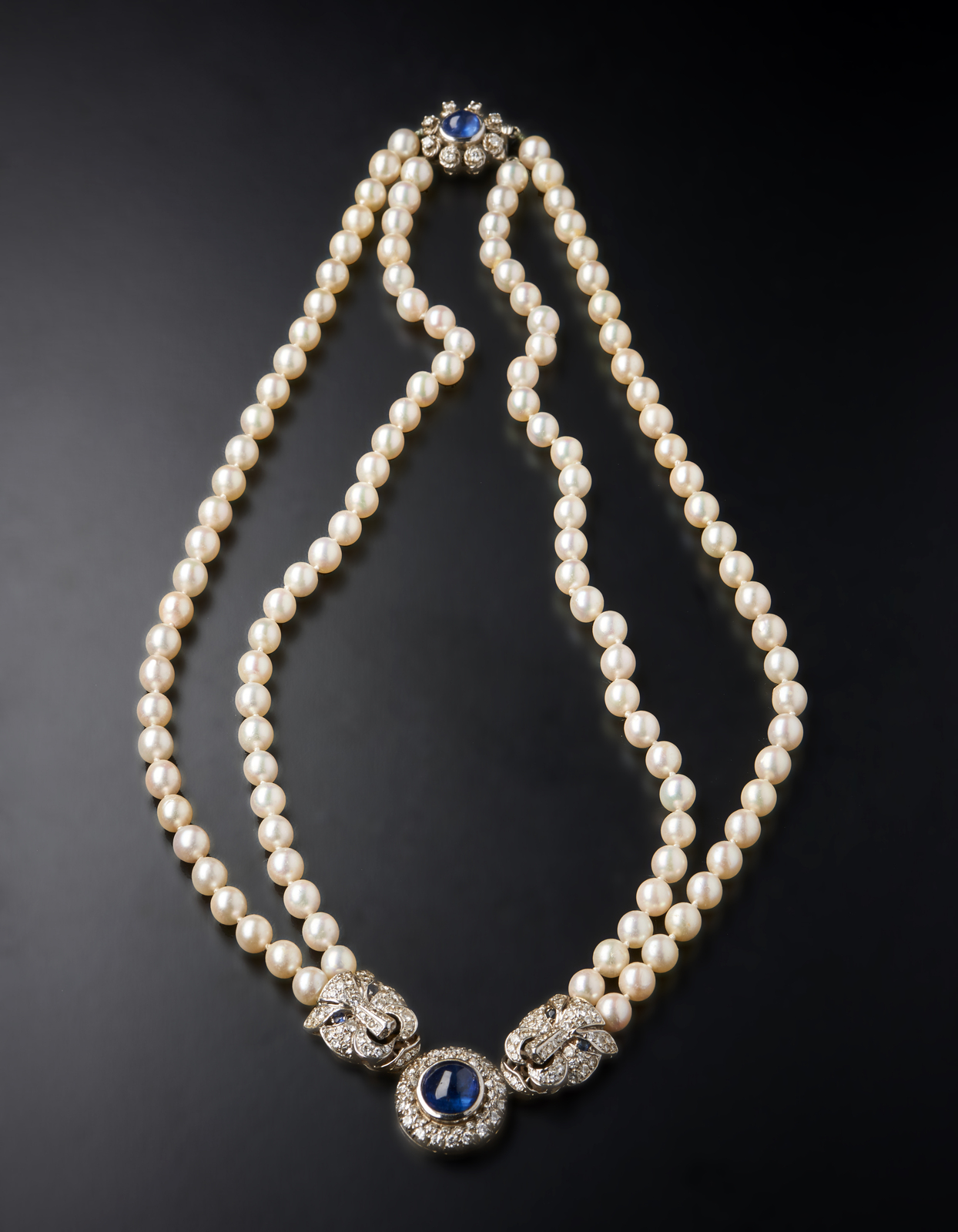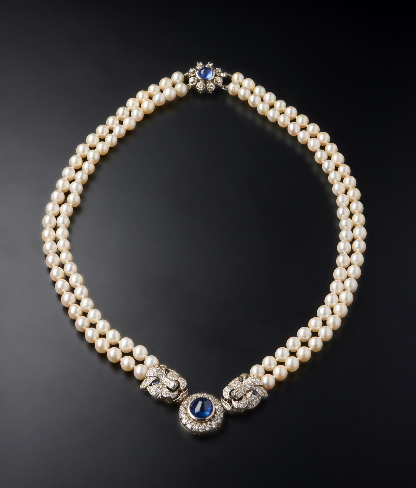 . Imponente collana a due fili di perle bianche sferiche di mm 7,00 con ciondolo centrale con zaffiro blu cabochon e diamanti taglio misto (huit huit e brillante) di circa 3,00 carati totali. . . . Il ciondolo centrale reca uno zaffiro blu cabochon di colore blu intenso di circa 5,00 ct.