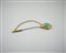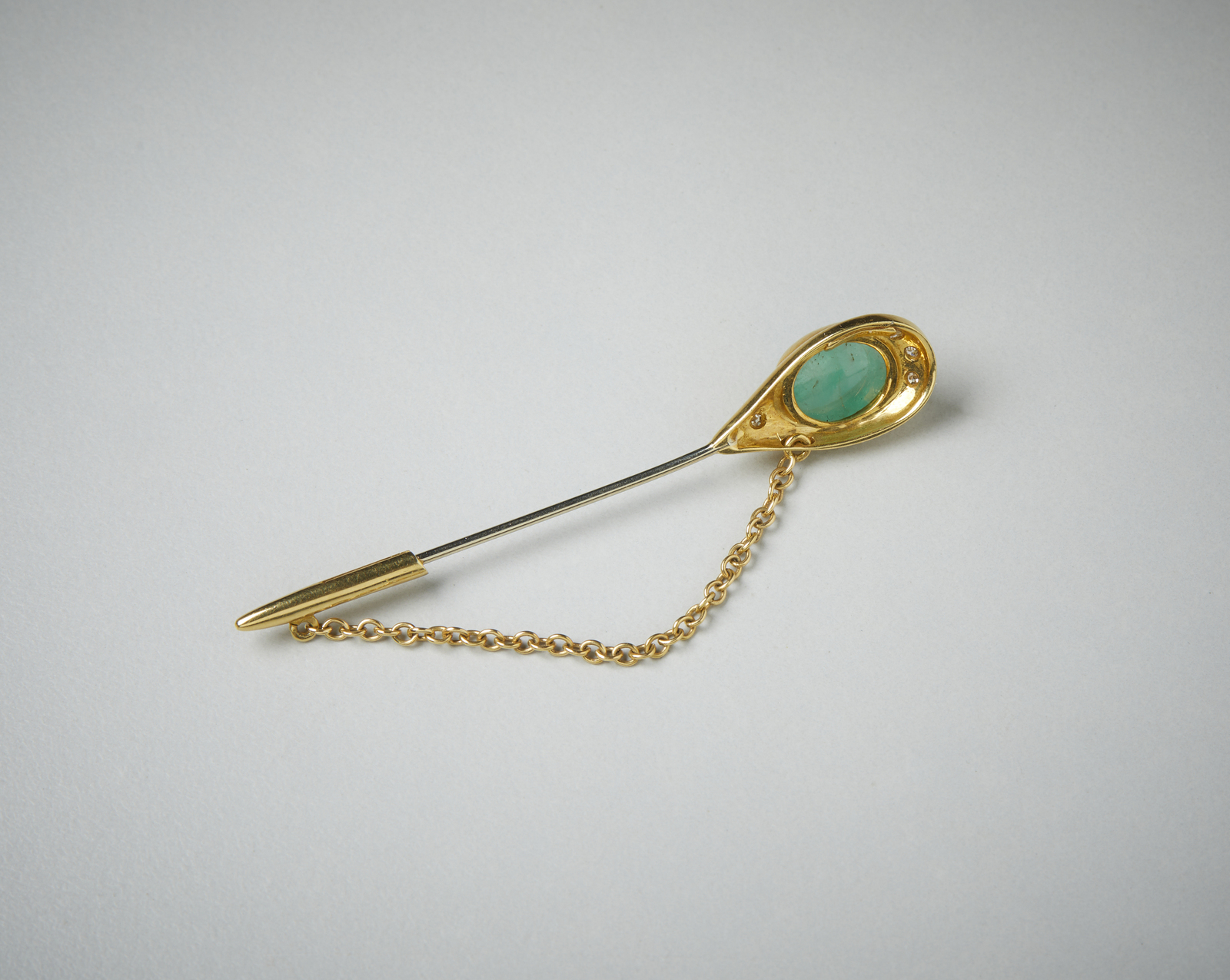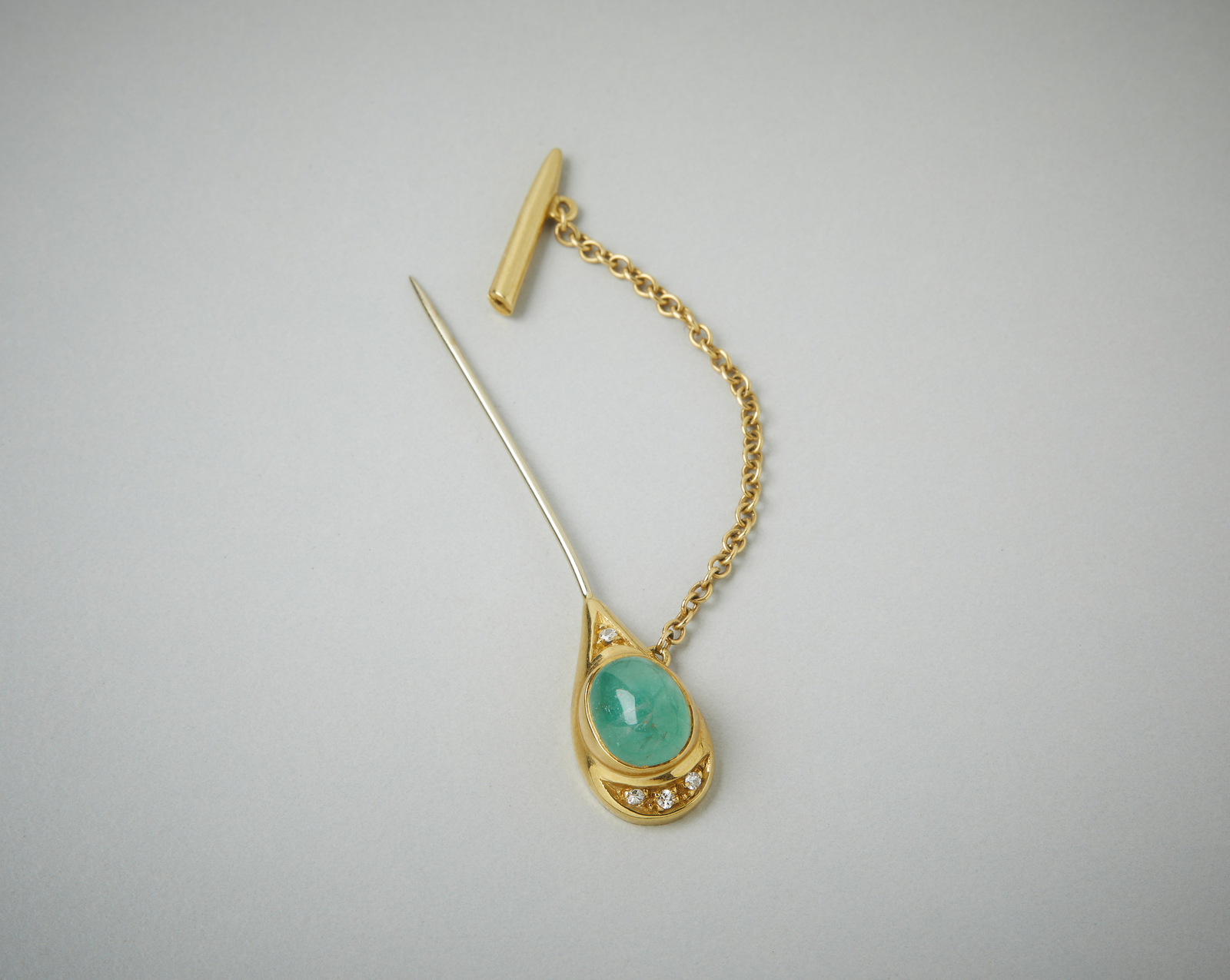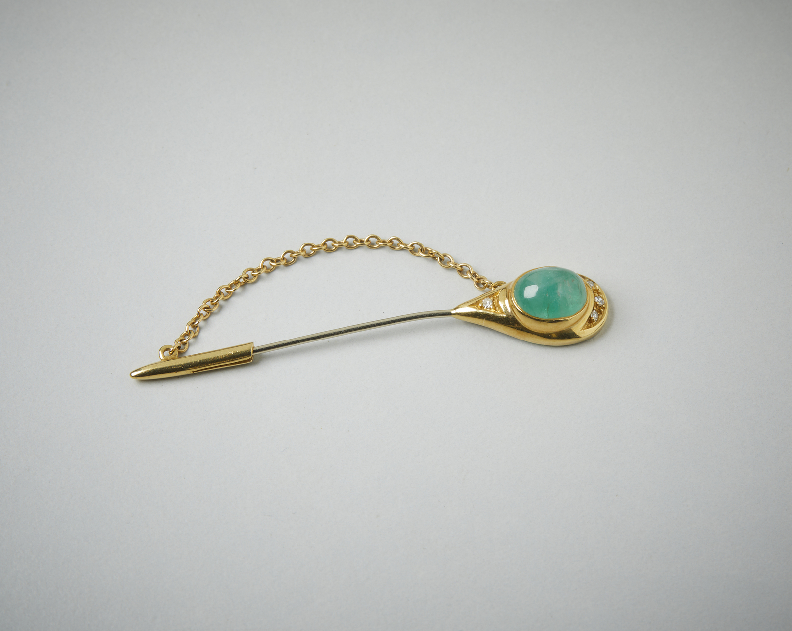 . Spilla da giacca in oro 750/1000 con pietra semipreziosa verde cabochon e diamanti bianchi taglio huit huit. 0.15 ct. totali ca. . Cm 7,00. peso lordo: 4,70 grammi