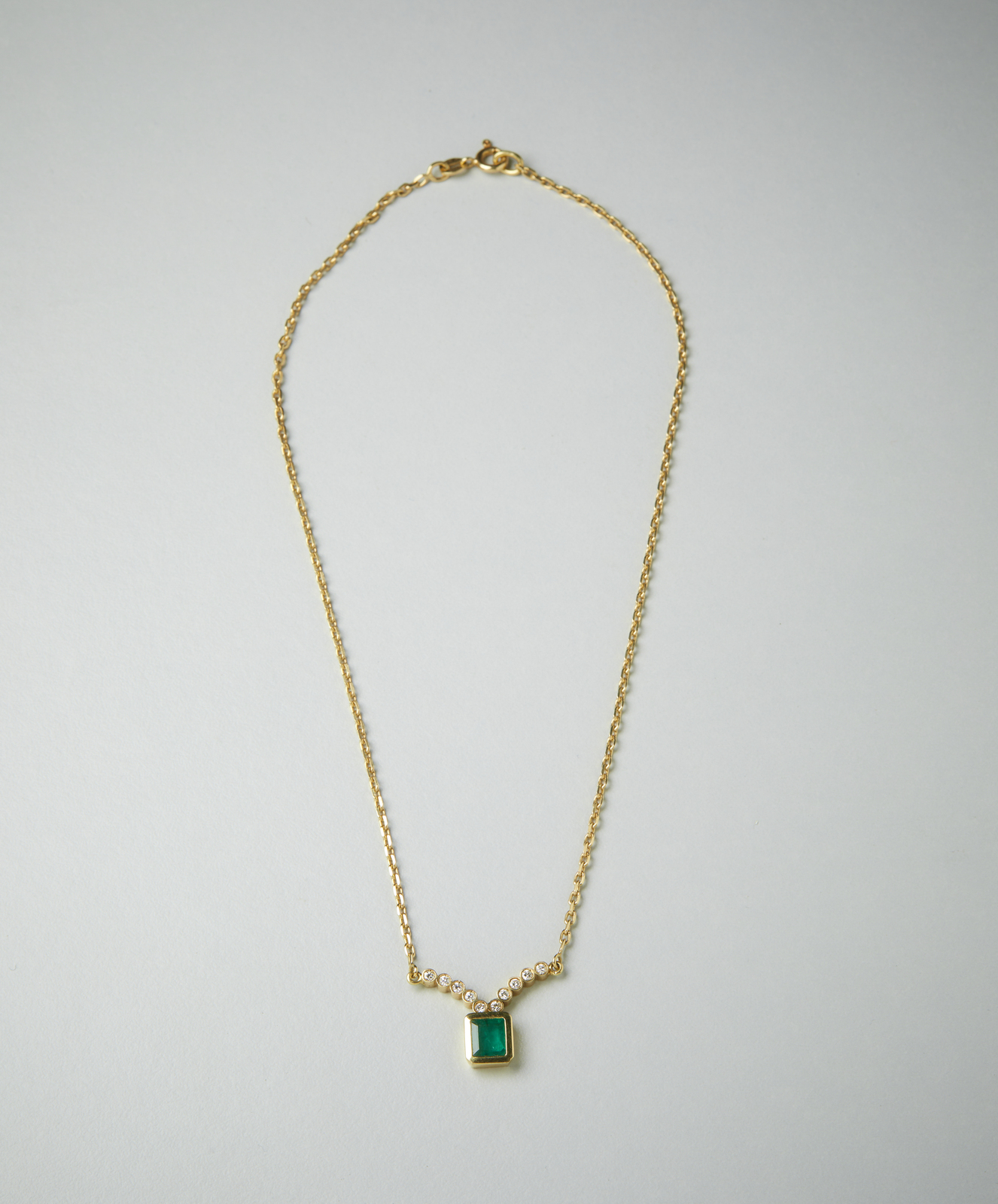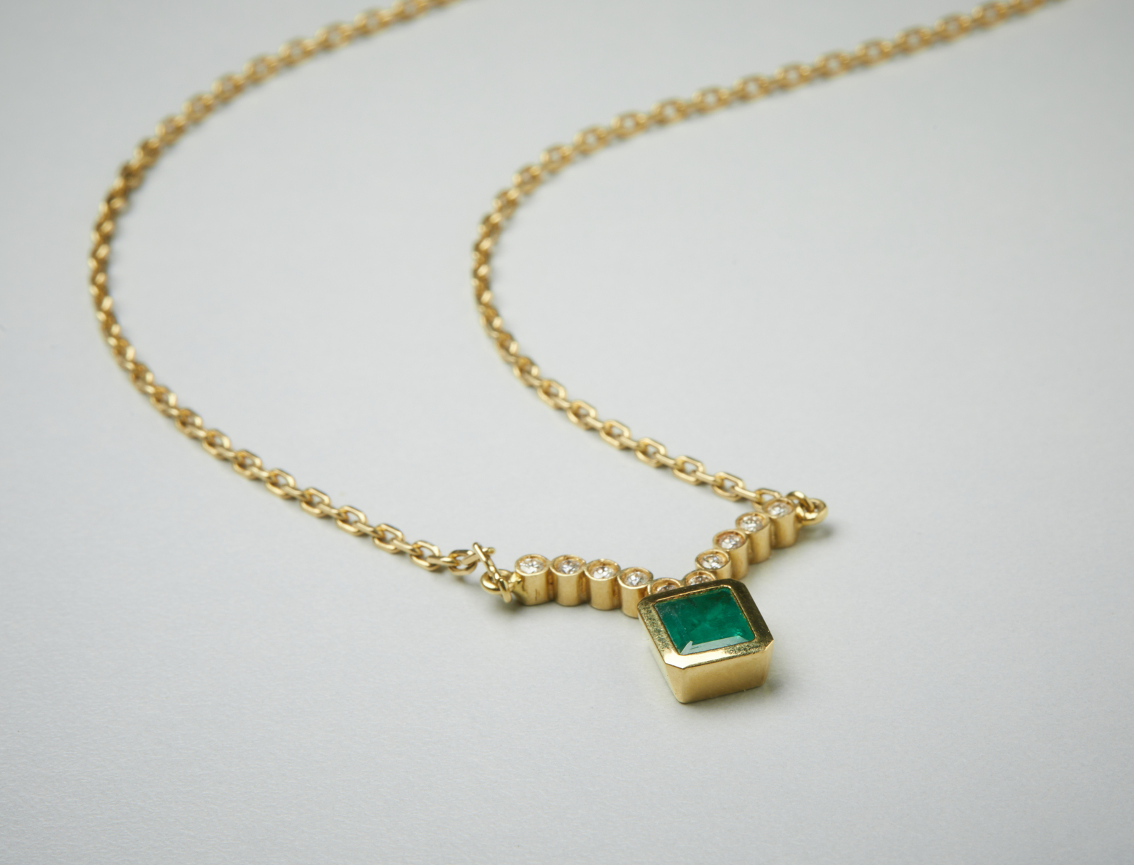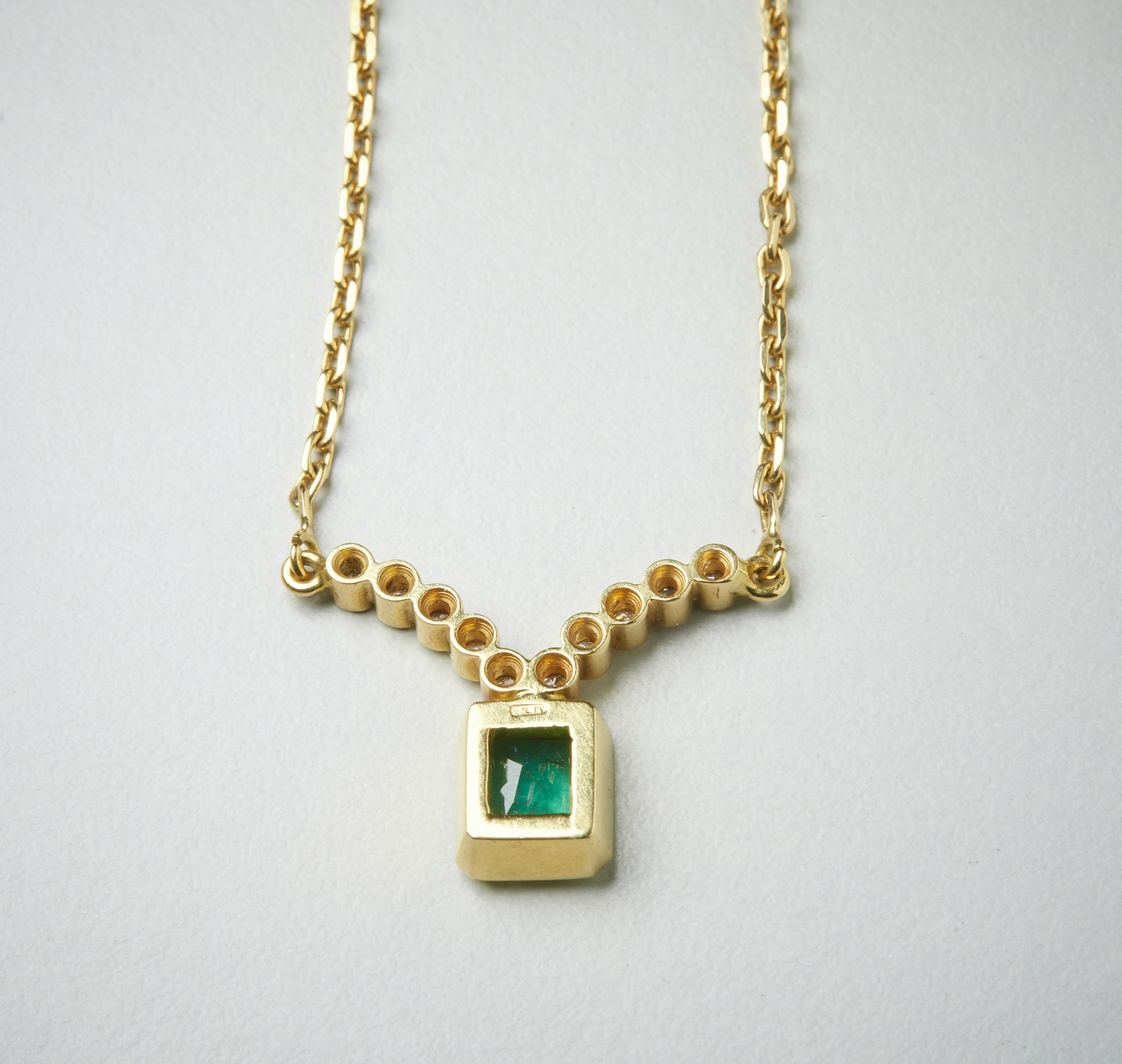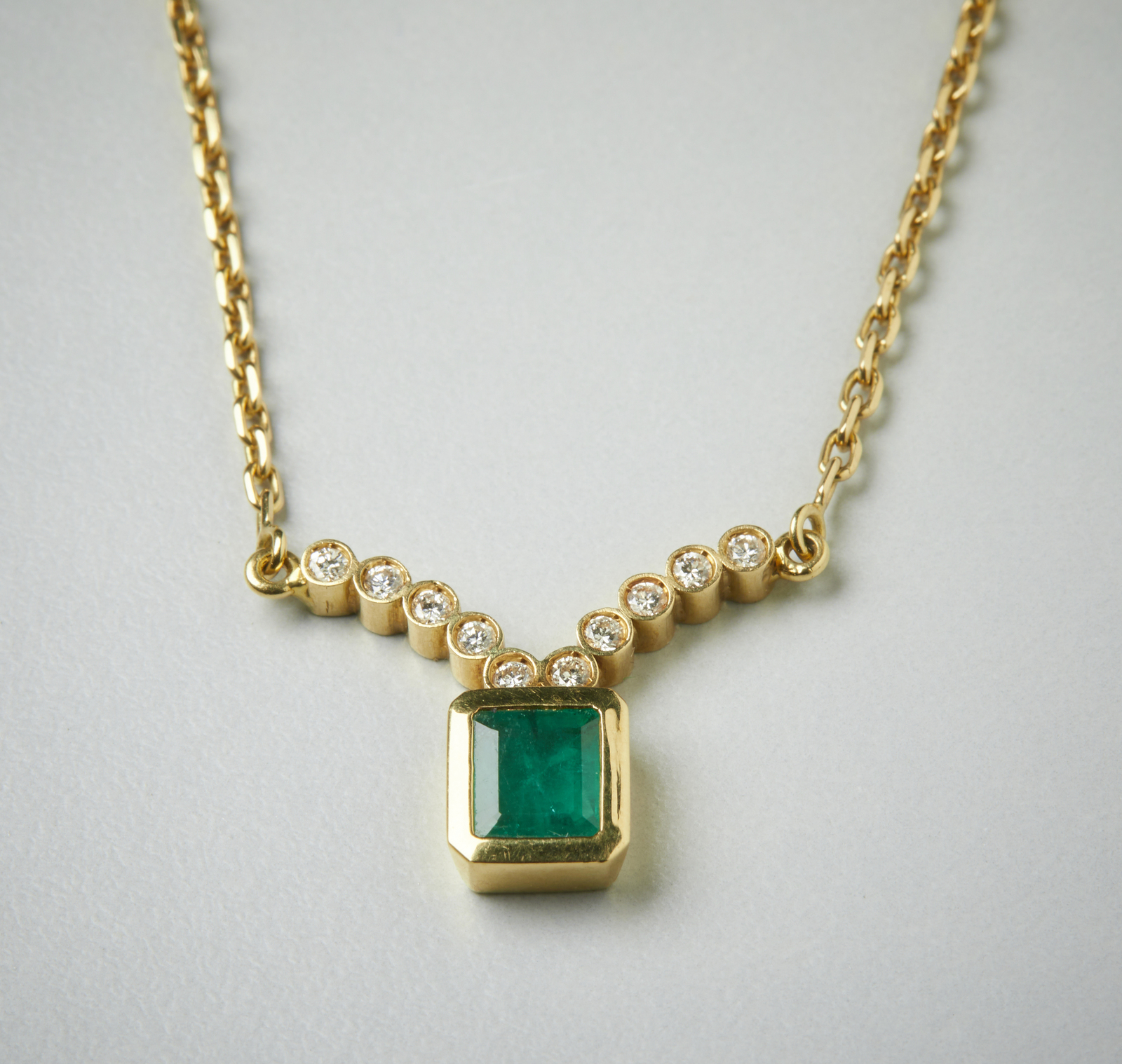 . - Catenina con ciondolo in oro giallo 750/1000 con smeraldo taglio a smeraldo di 1.00 ct. ca. e diamanti bianchi di 0.45 ct. ca. .