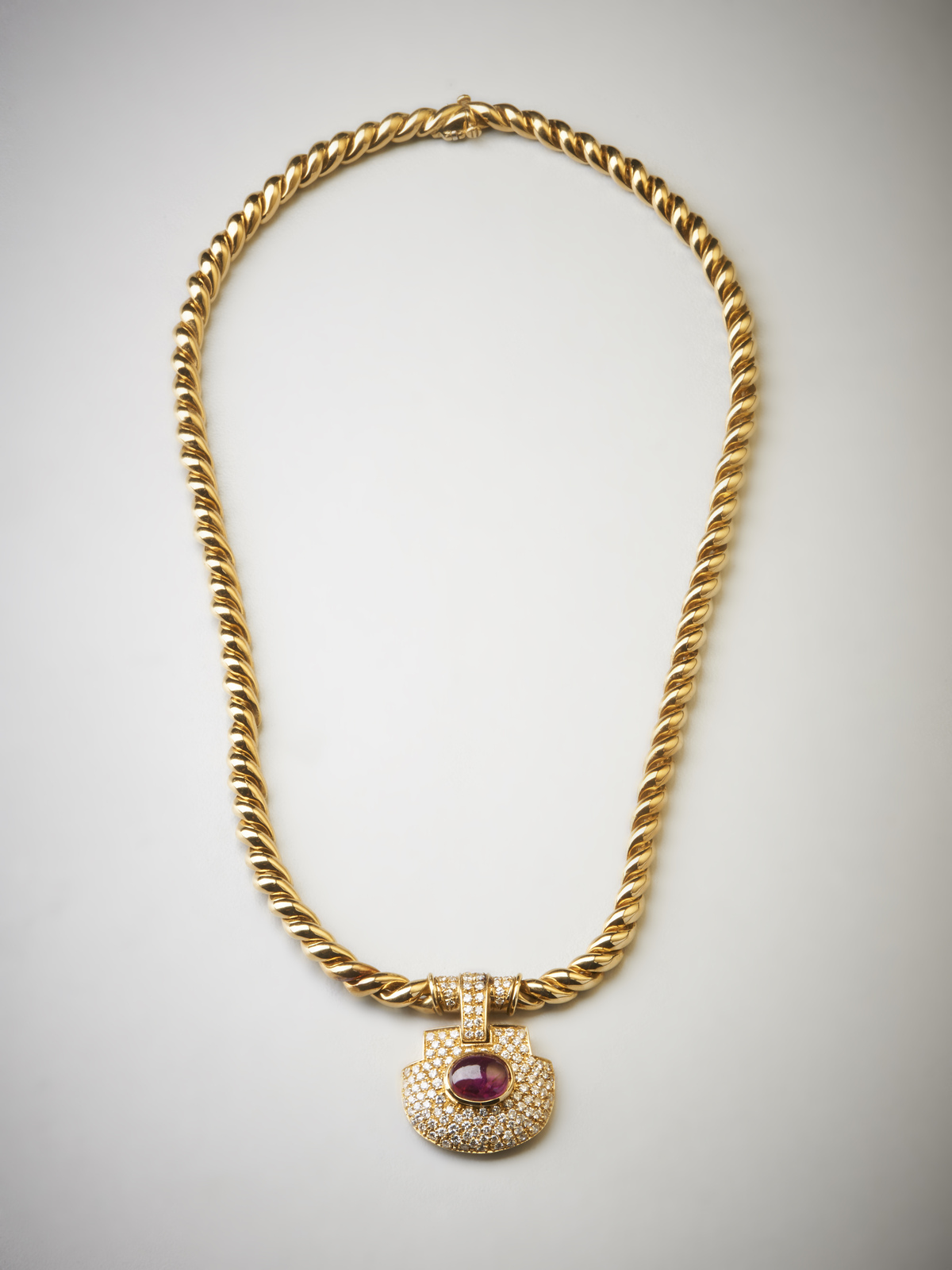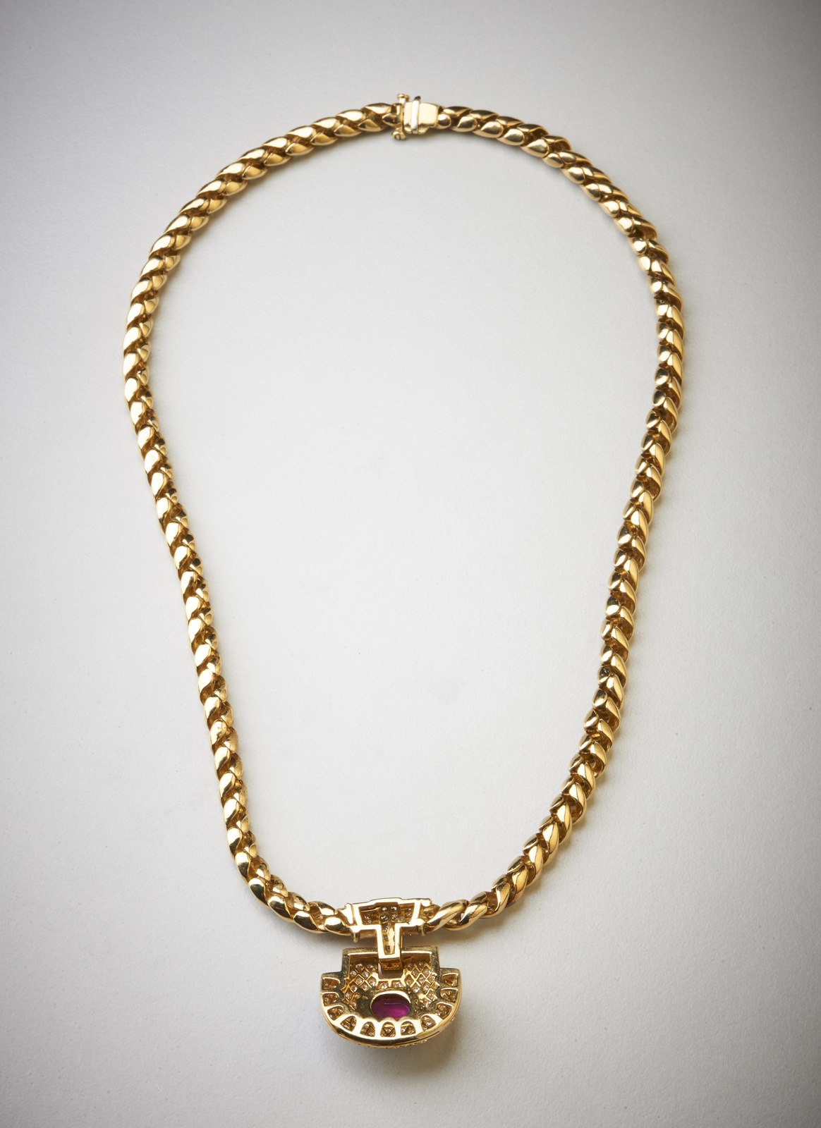 . - Collana in oro giallo 750/1000 maglia intrecciata con ciondolo con pavè di diamanti bianchi taglio brillante carati 2,80 ca. e rubino ovale cabochon di 4,50 carati circa.