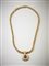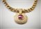 Lotto 98 | . - Collana in oro giallo 750/1000 maglia intrecciata con ciondolo con pavè di diamanti bianchi taglio brillante carati 2,80 ca. e rubino ovale cabochon di 4,50 carati circa.