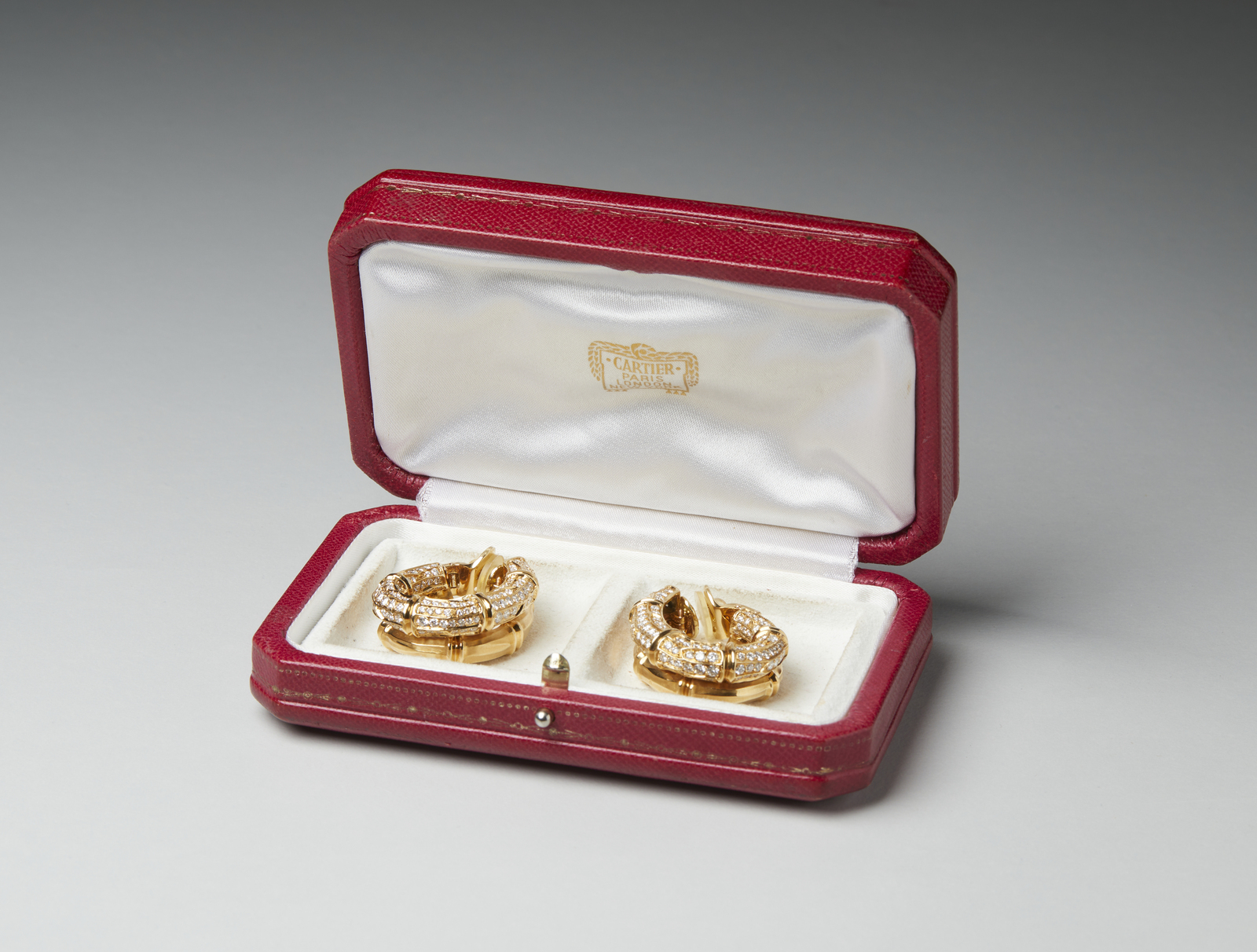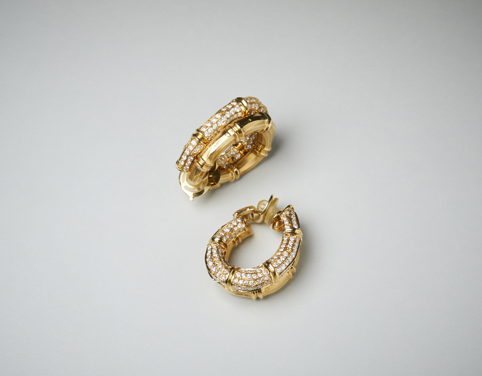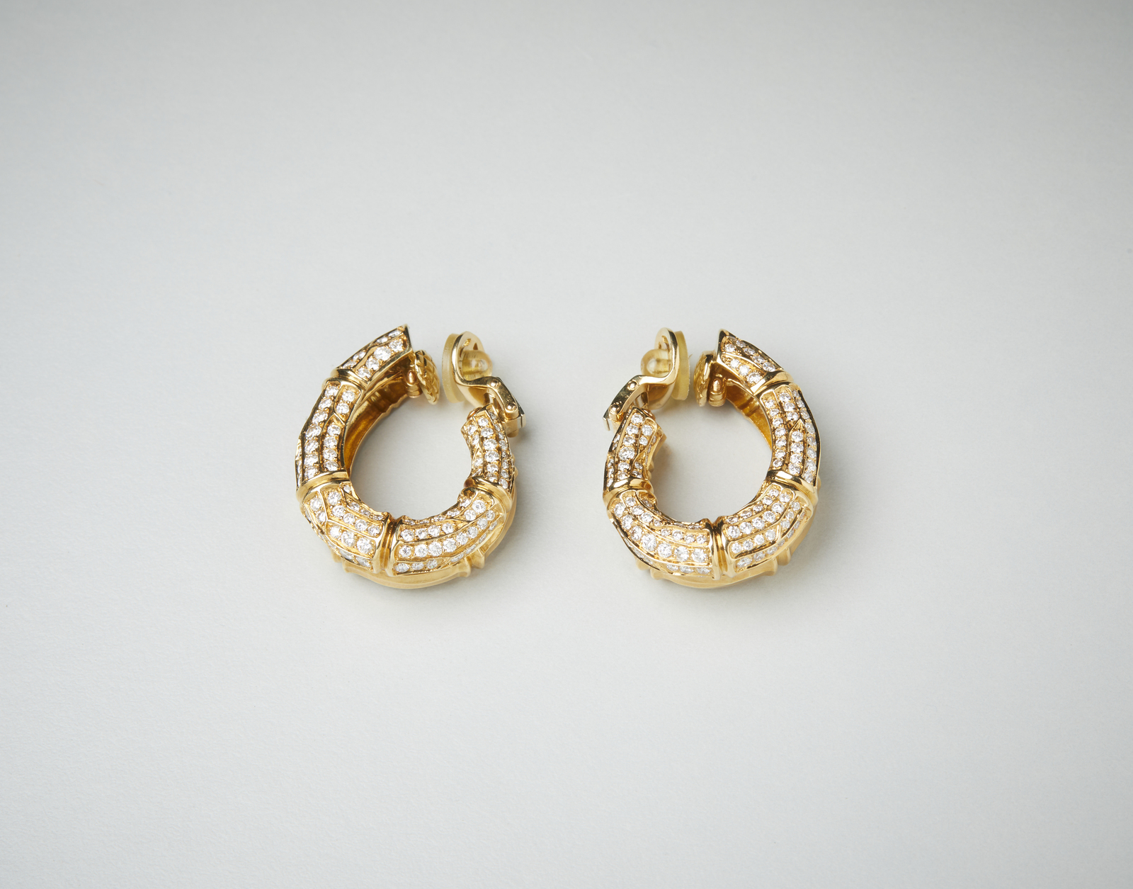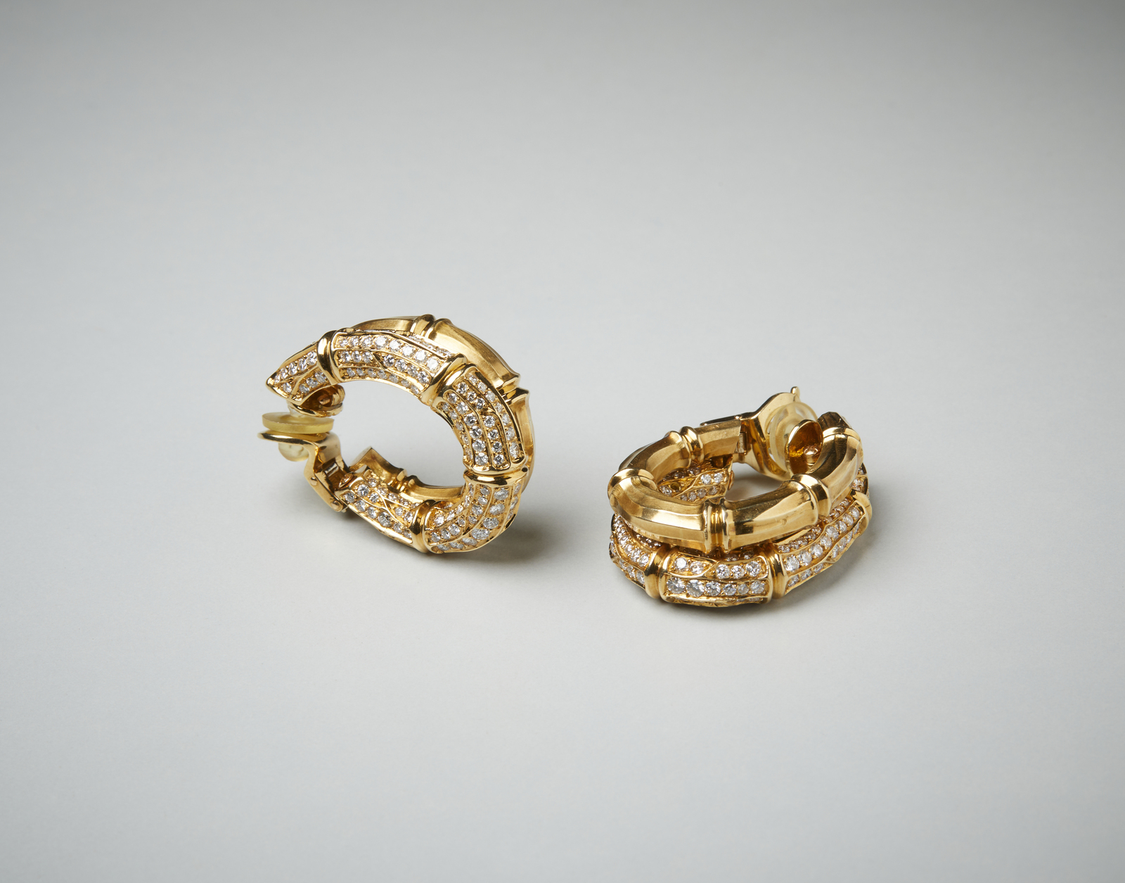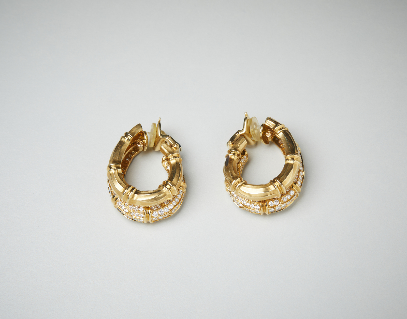 CARTIER Paio di orecchini Cartier a clips doppio cerchio in oro giallo 750/1000 con pavè di diamanti bianchi di 4 ct circa.