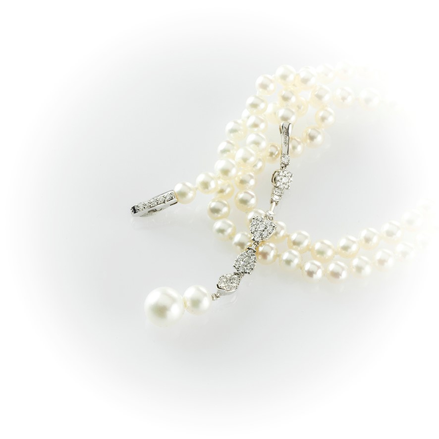 Collier in perle Recarlo con pendente in diamanti e perle a gradazione.