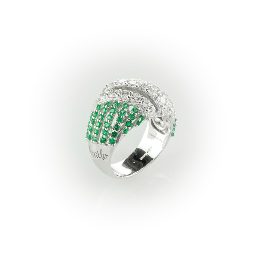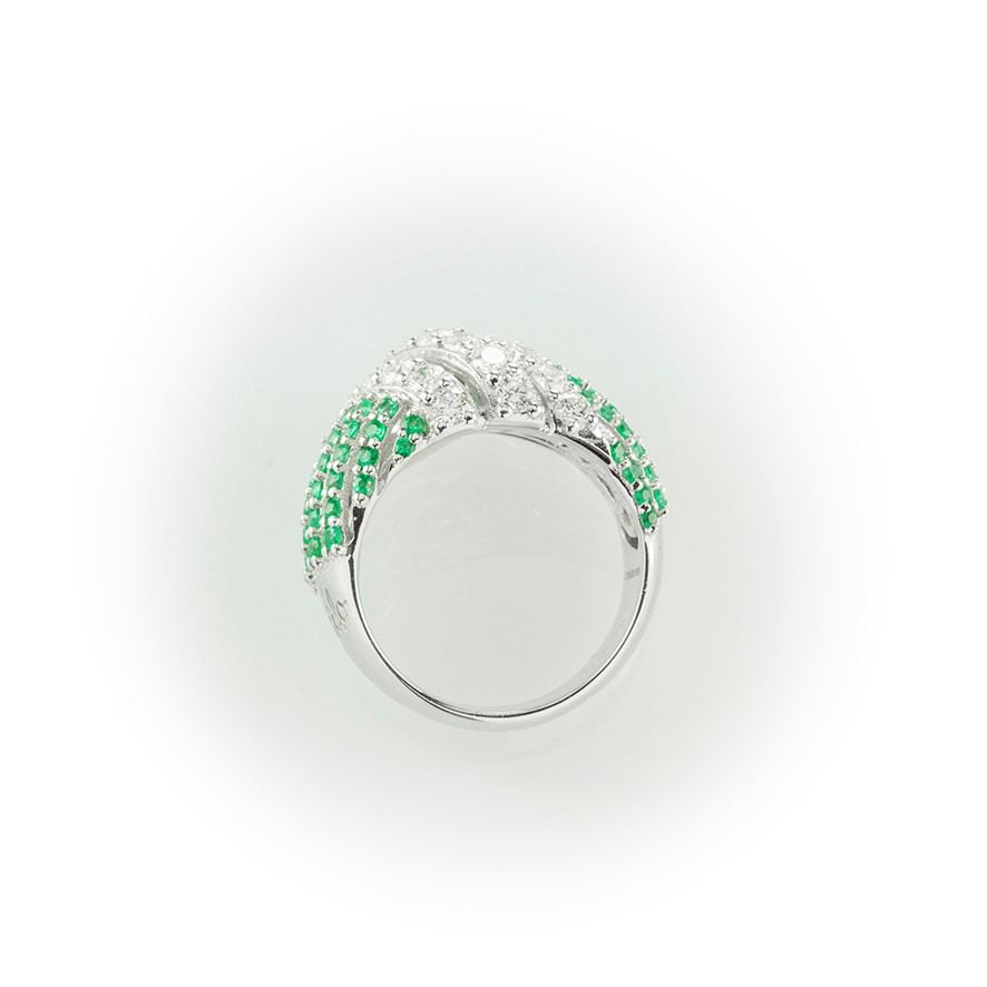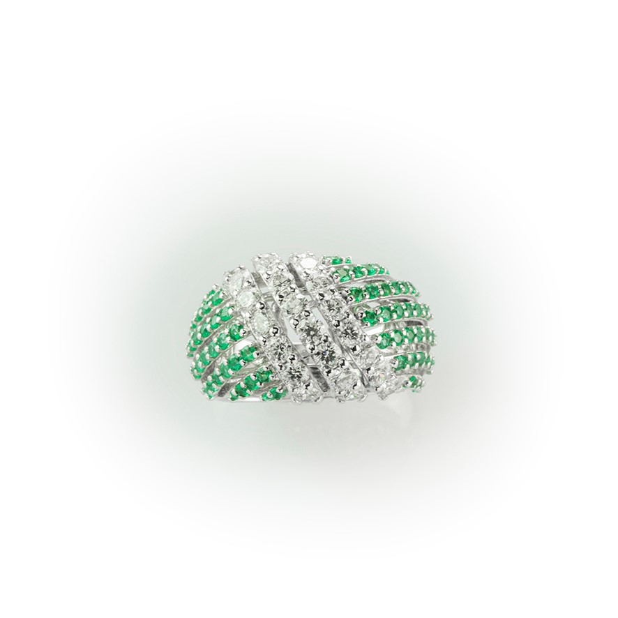Lotto 69 | Anello a fascia Recarlo in oro bianco con diamanti bianchi taglio brillante e smeraldi verdi taglio rotondo