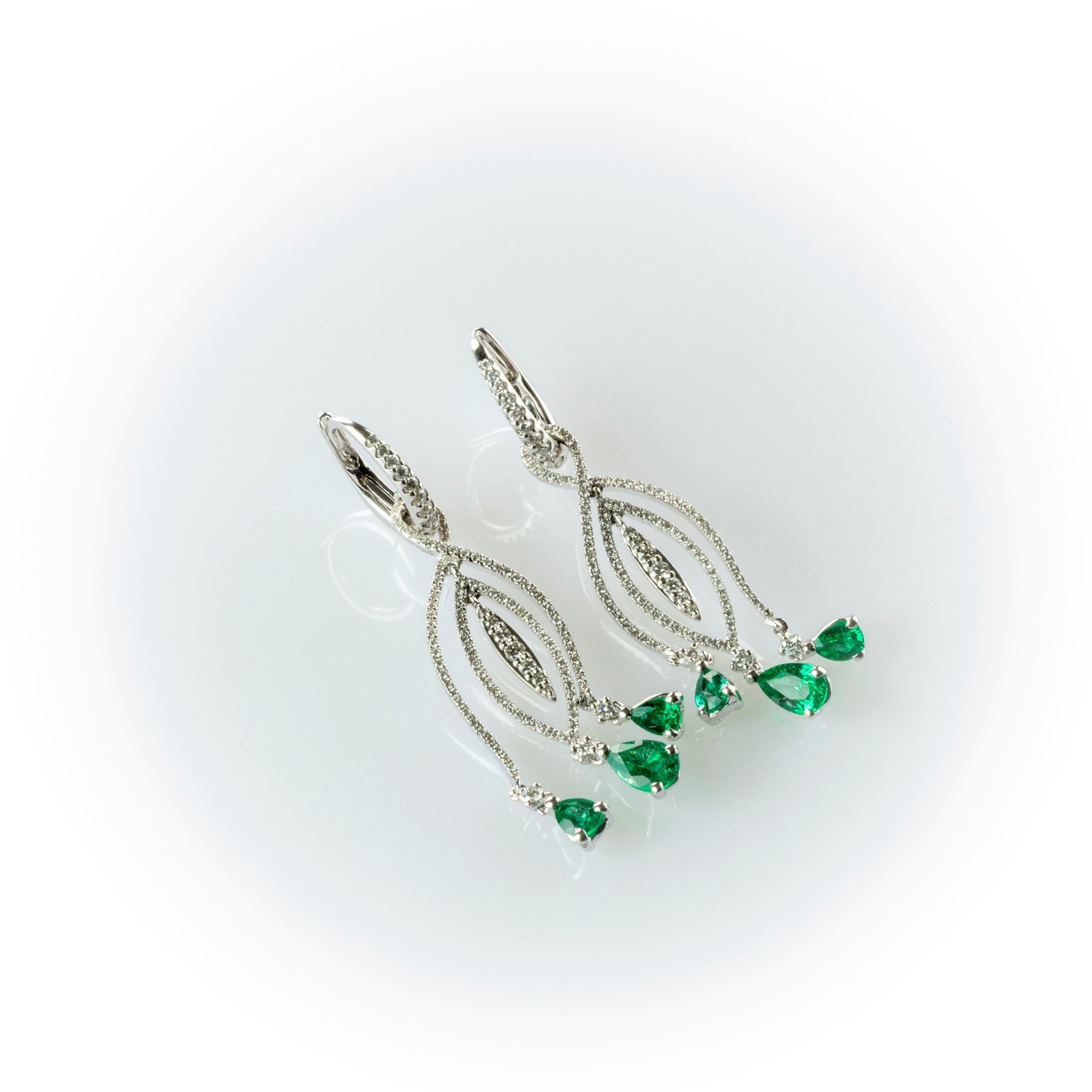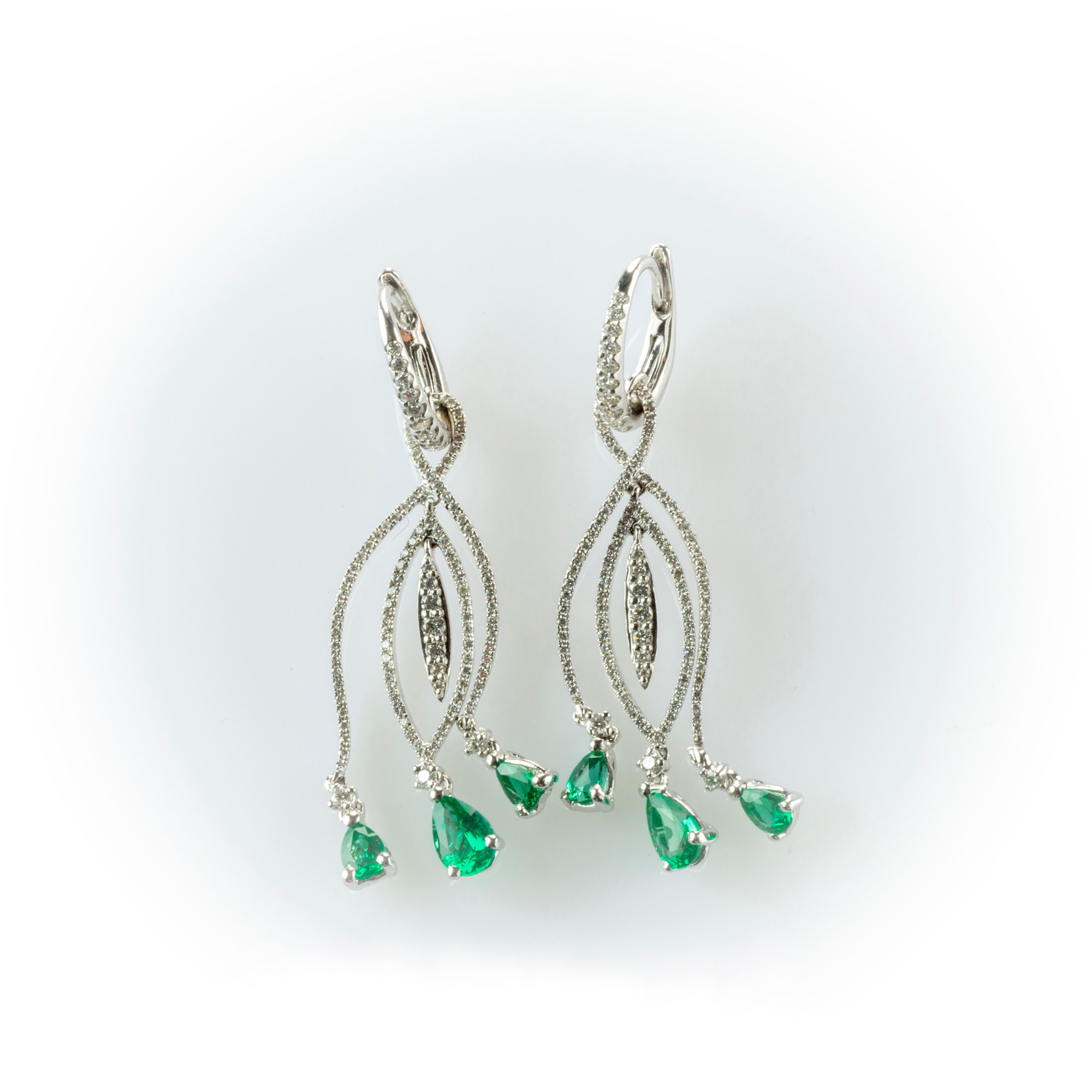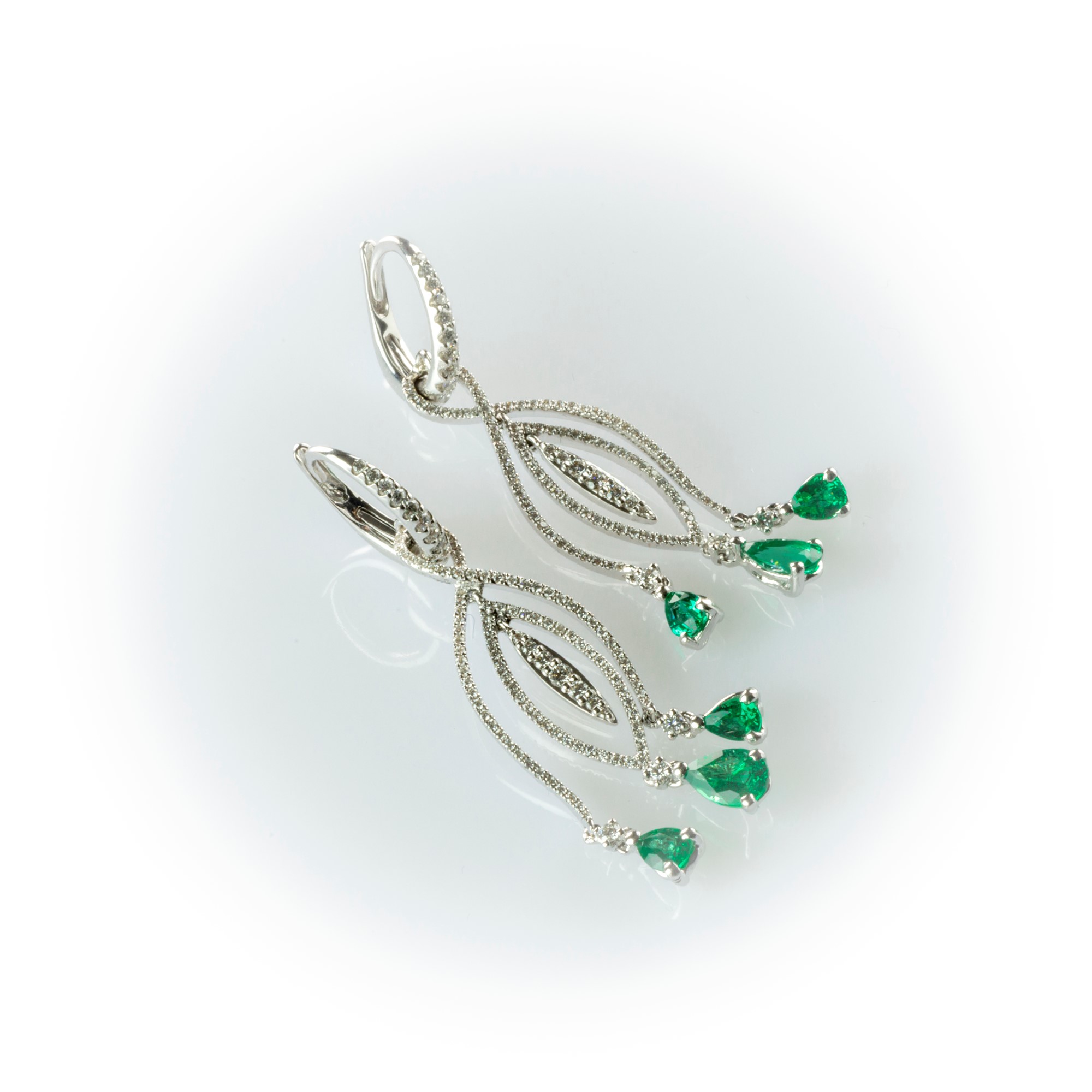 Orecchini girolobo pendenti in oro bianco con diamanti taglio brillante e 3 smeraldi cadauno taglio goccia