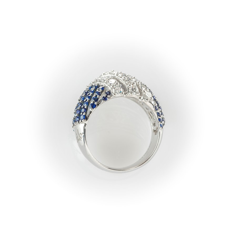 Anello a fascia in oro bianco con diamanti bianchi taglio brillante e zaffiri blu taglio rotondo