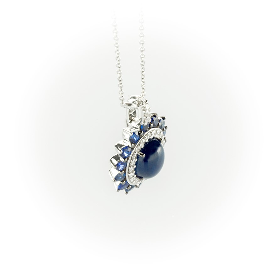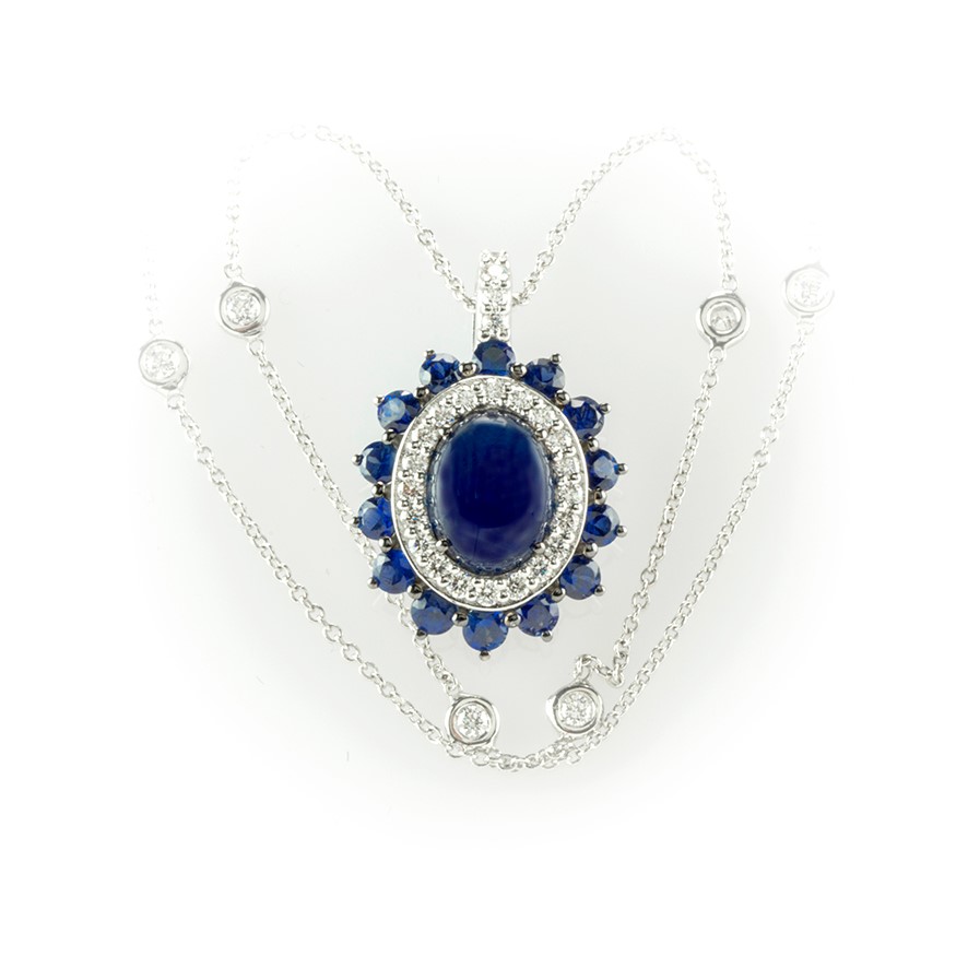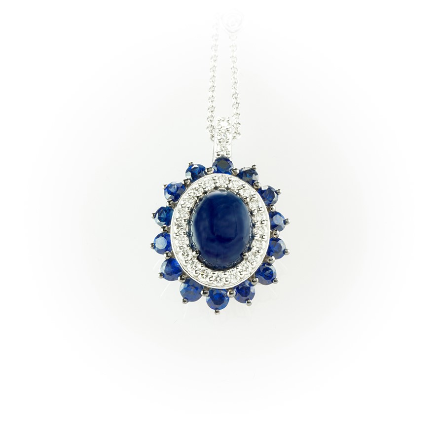 Girocollo Recarlo in oro bianco con cabochon di zaffiri, diamanti bianchi taglio brillante e contorno di zaffiri taglio rotondo. Sottile catenina in oro bianco regolabile su più misure impreziosita da diamanti taglio brillante.