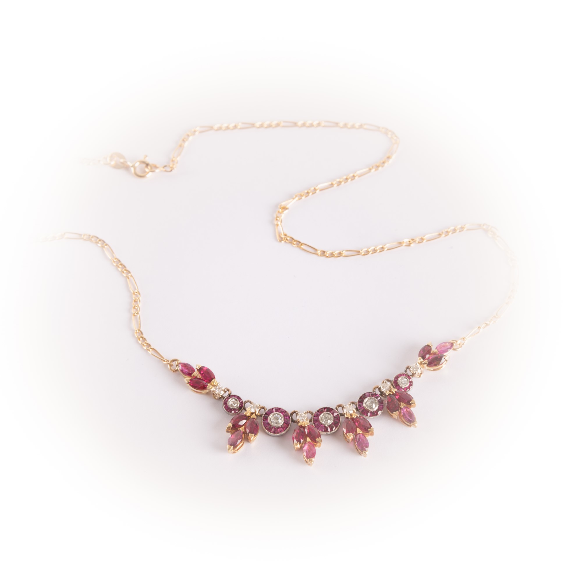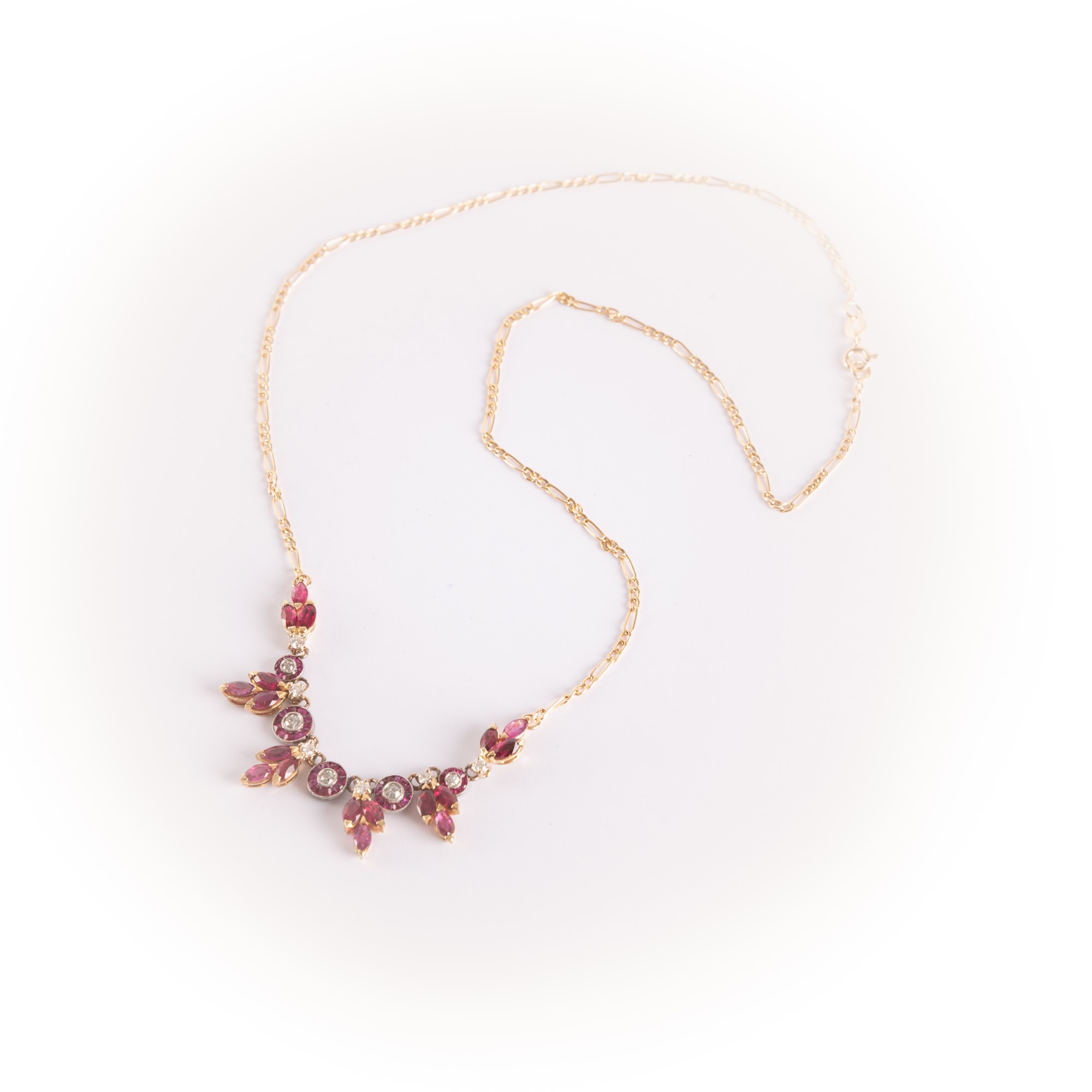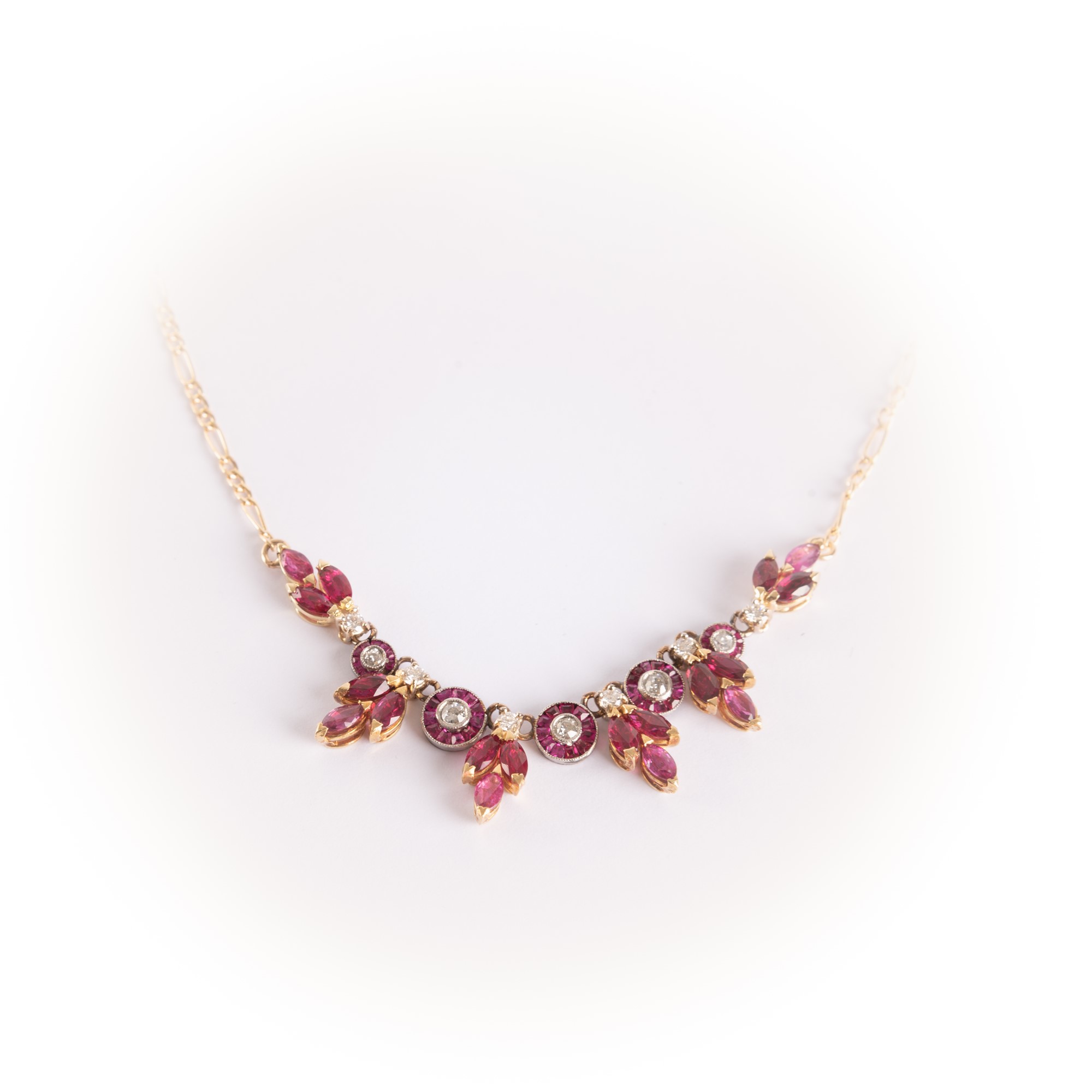Collier in oro giallo 18 kt costituito da 5 elementi rotondi di manifattura antica con diamanti centrali taglio antico e piccoli rubini di contorno inseriti in fantasia di rubini taglio navette e diamanti taglio brillante