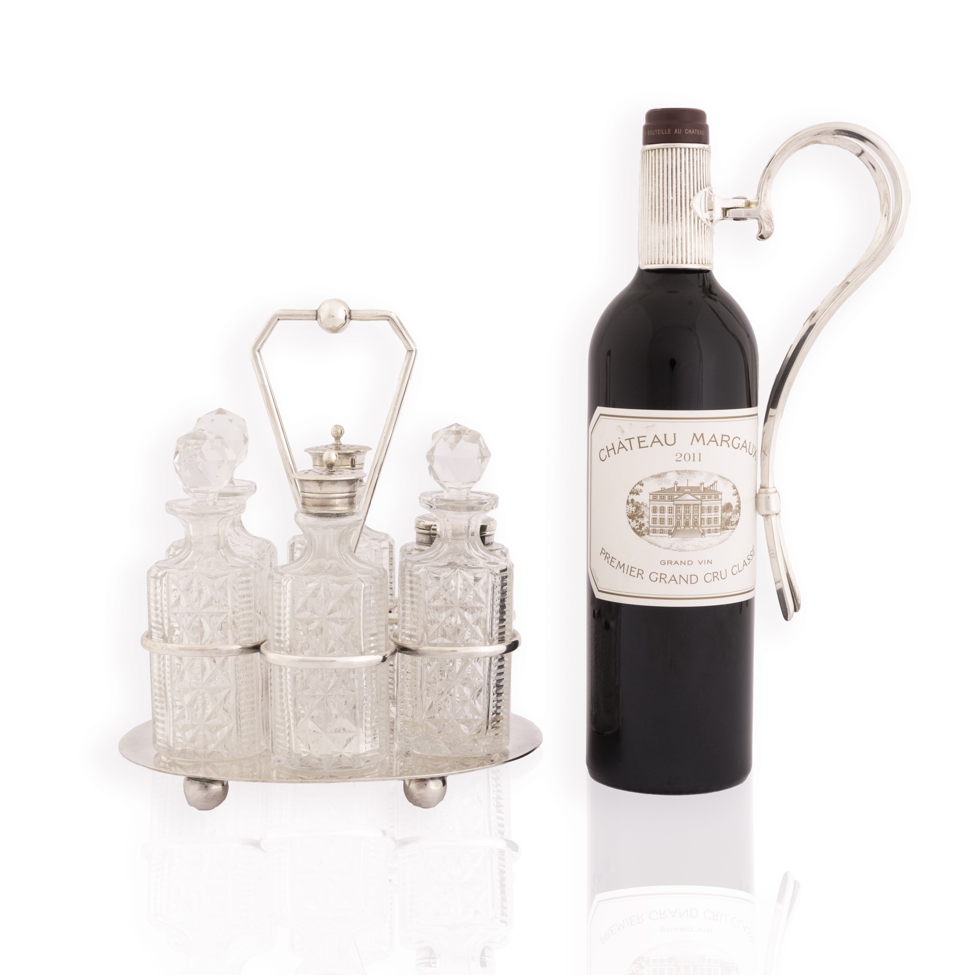 Lotto di oliera in Sheffield con sei flaconi in cristallo e un versavino in Sheffield