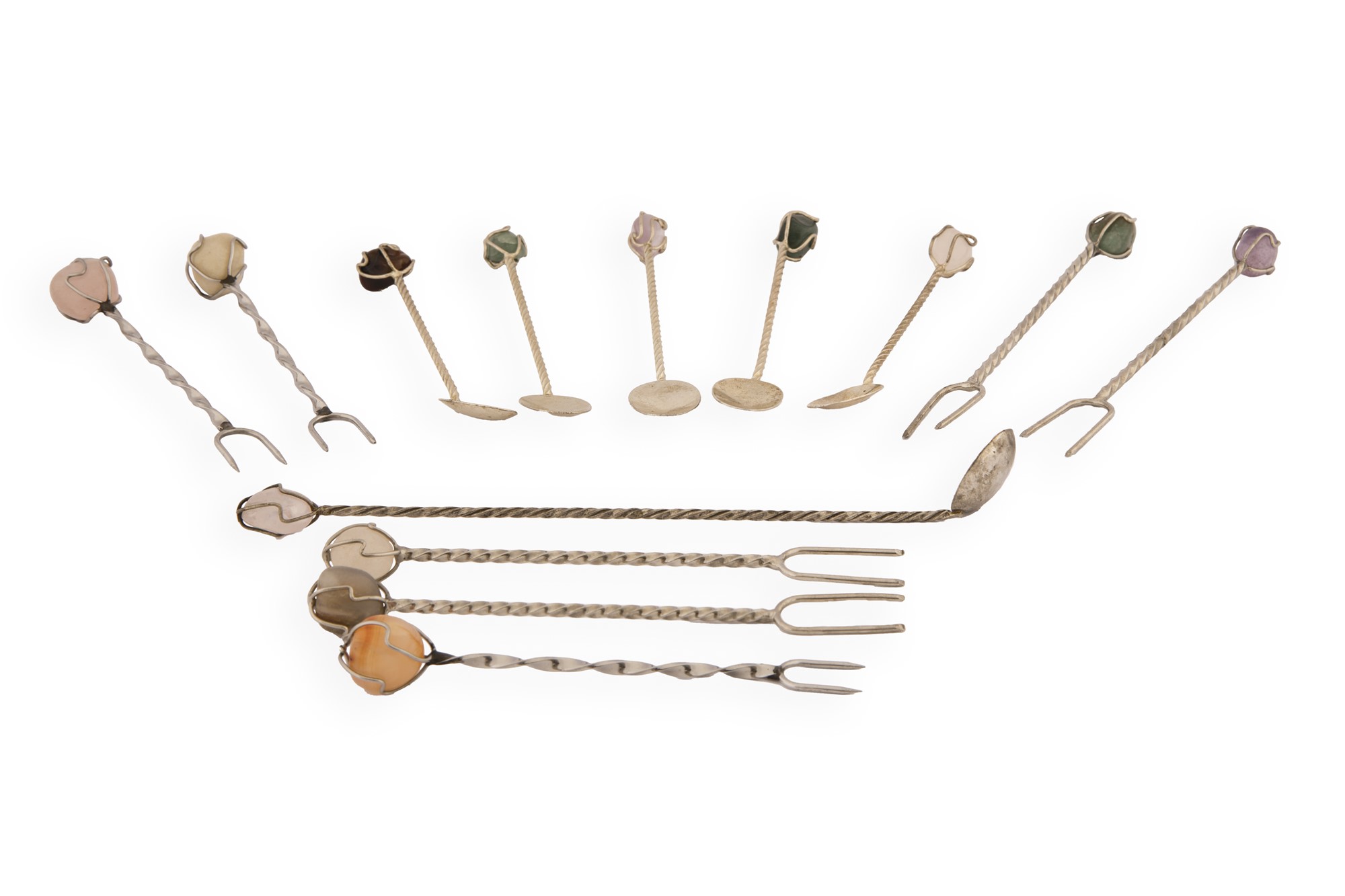 Lotto composto da 13 piccole posate da cocktail con manico realizzato con inserto in pietre dure