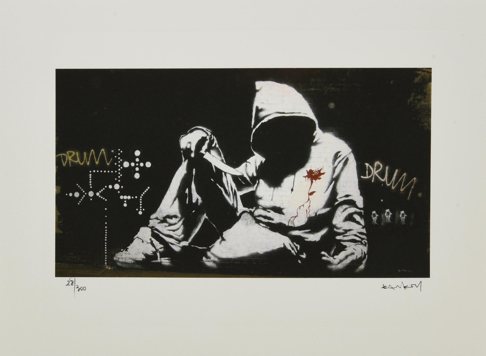 Da Banksy HOODIE WITH KNIFE eliografia su carta, cm 28,5x38; es. 28/300 firma...