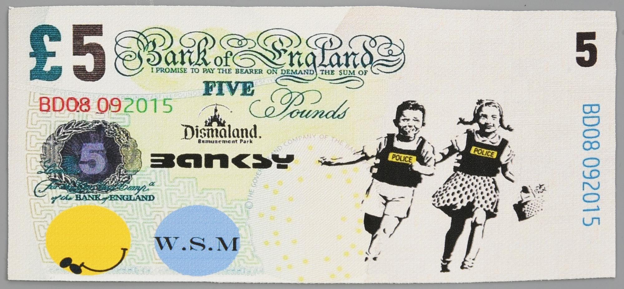 Lotto 404 | Banksy DISMAL 5 POUND serigrafia e stencil su tela, cm 9x18 timbro "Dismaland...