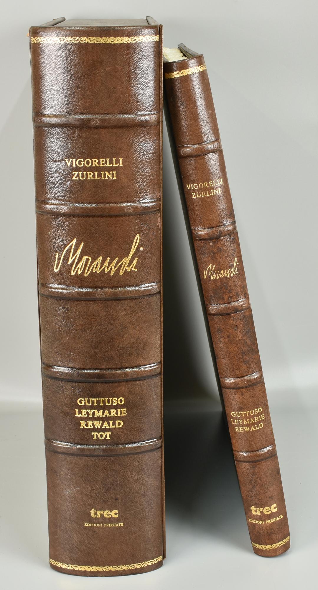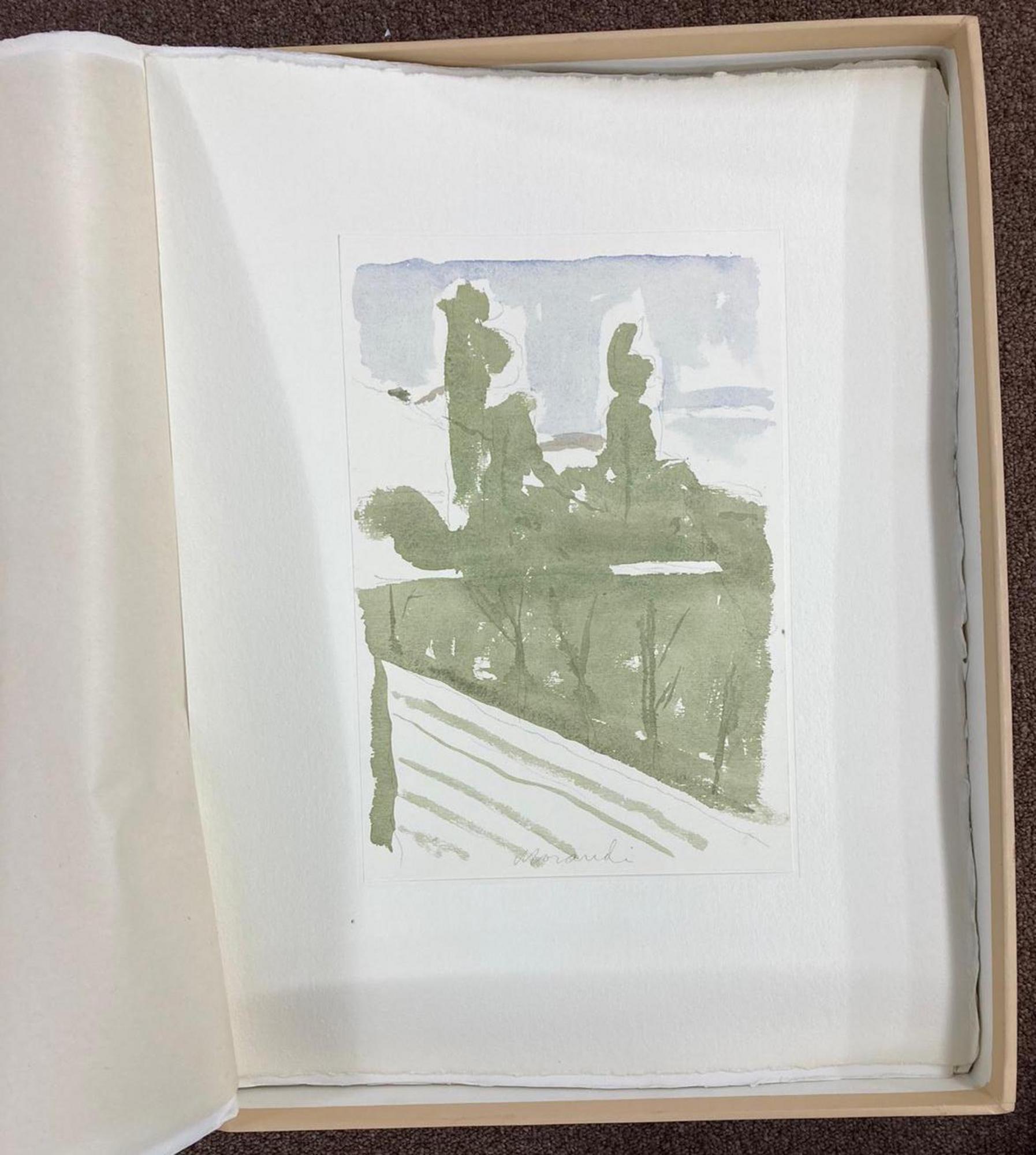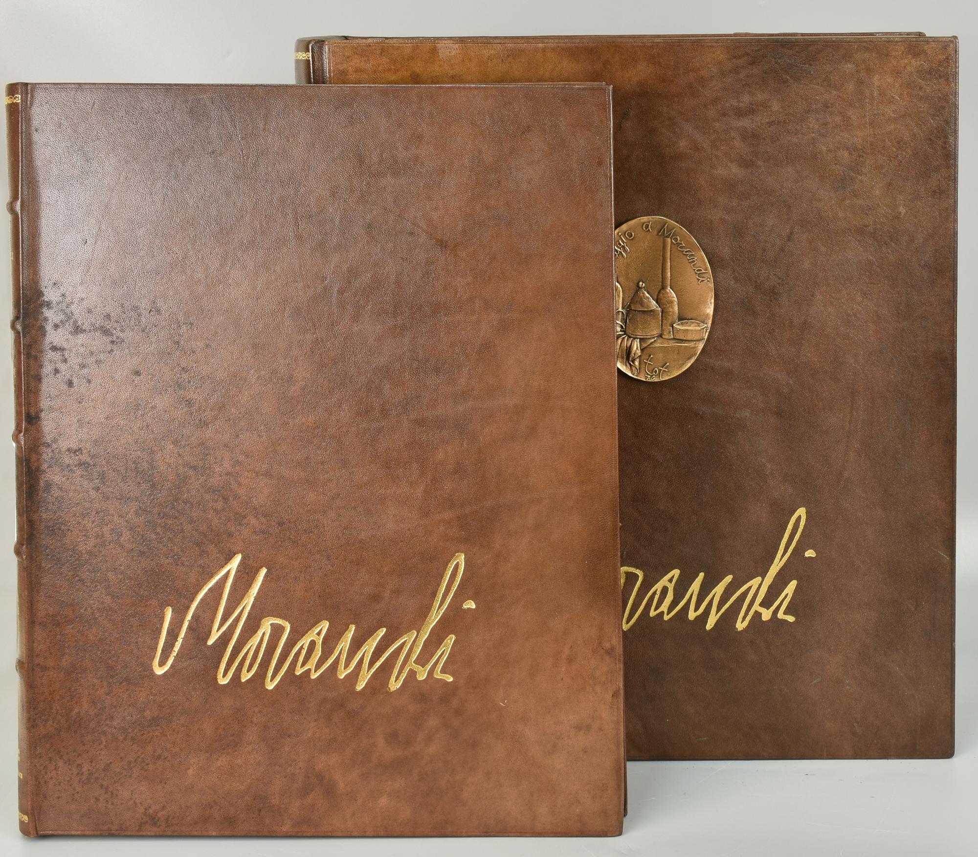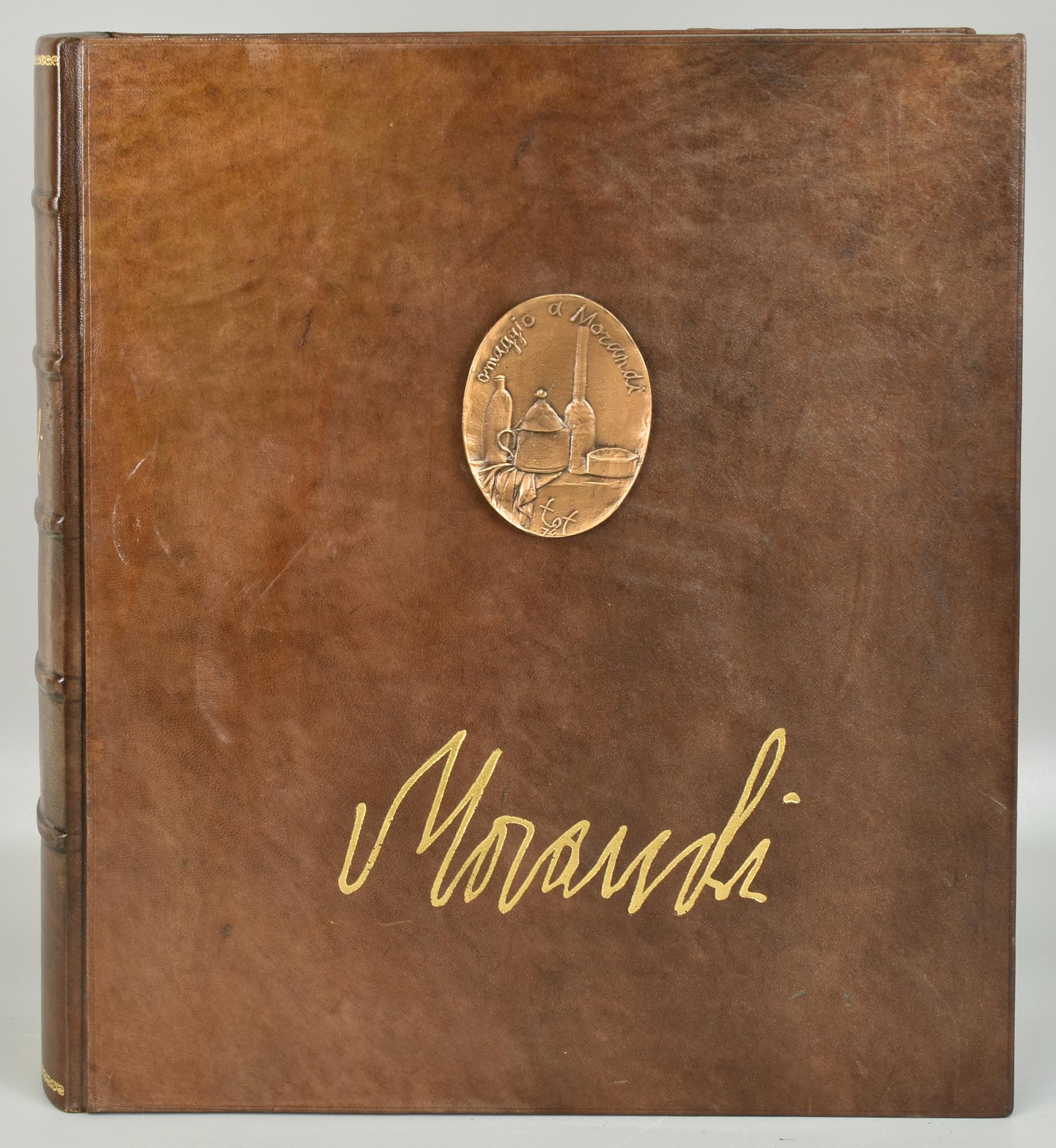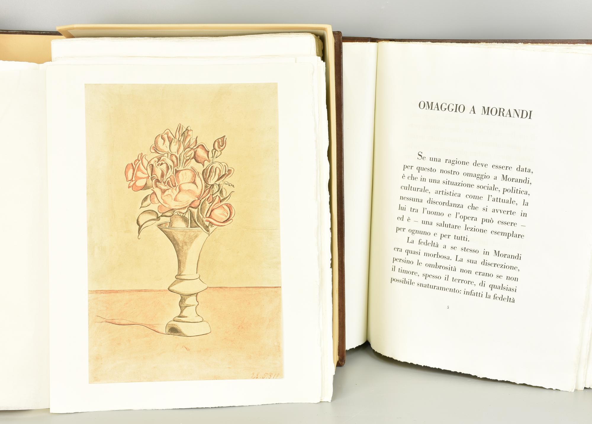50 tavole, riproduzioni degli acquerelli direttamente sugli originali in offset, a fogli sciolti racchiusi in quartini con titoli e date, custodia editoriale in pelle marrone con placca bronzea sul piatto, eseguita da Amerigo Tot nel 1974. Secondo volume interamente testuale e filigranato "Morandi", saggio di Valerio Zurlini "Il tempo di Morandi"; tre saggi di Renato Guttuso "Giorgio Morandi", Jean Leymarie "Morandi, les acquarelles" e John Rewald "Morandi remembered"