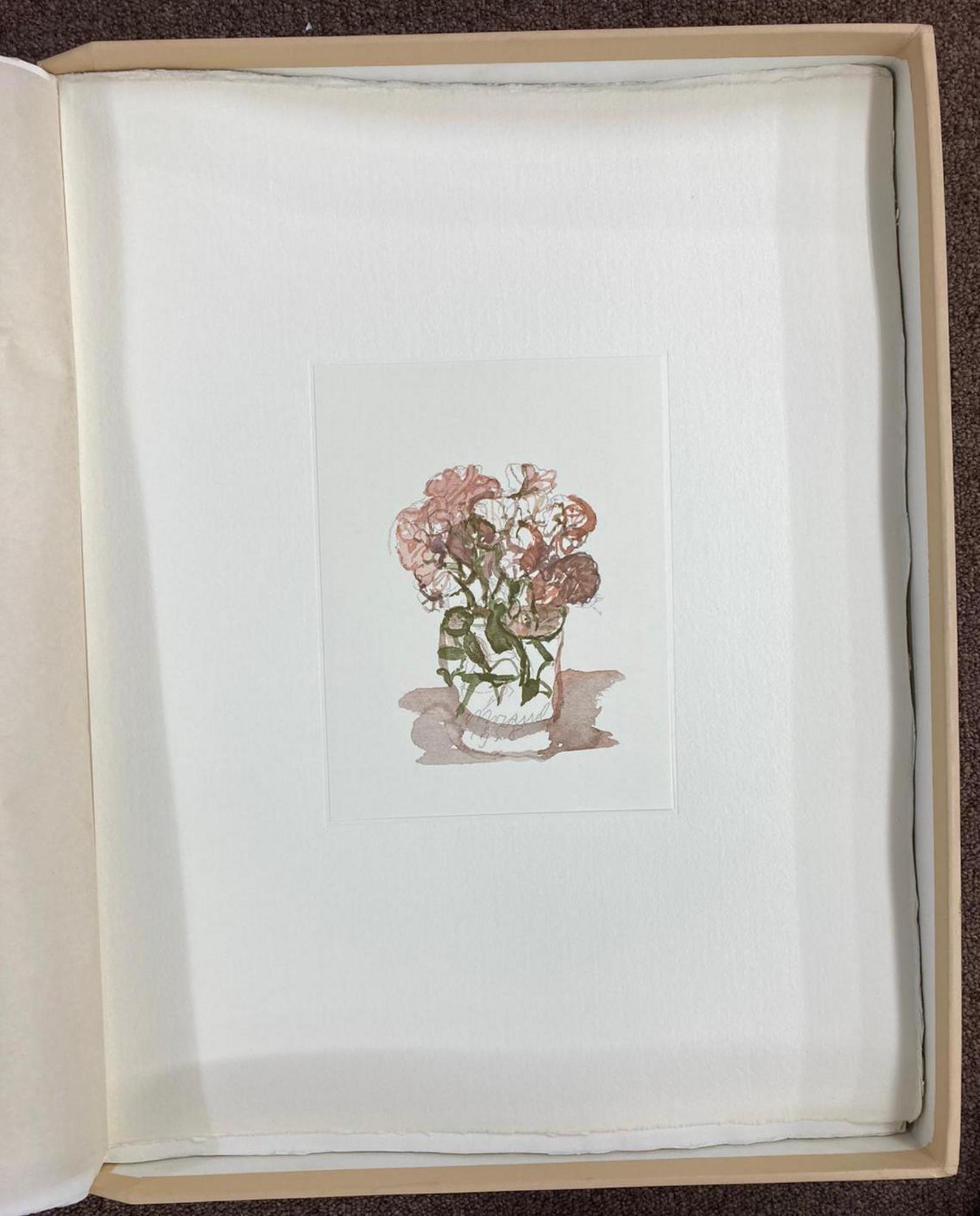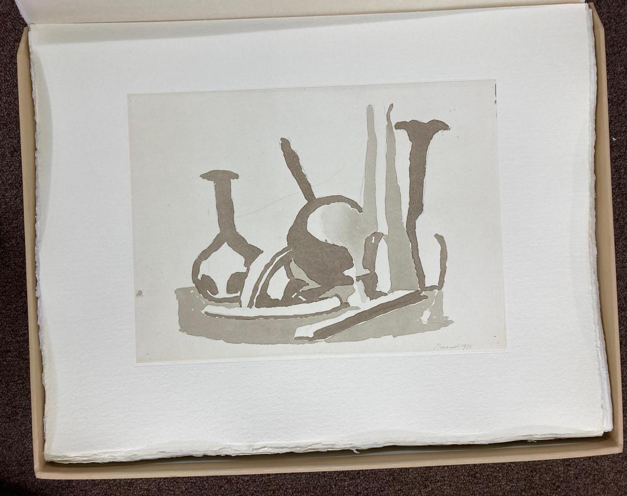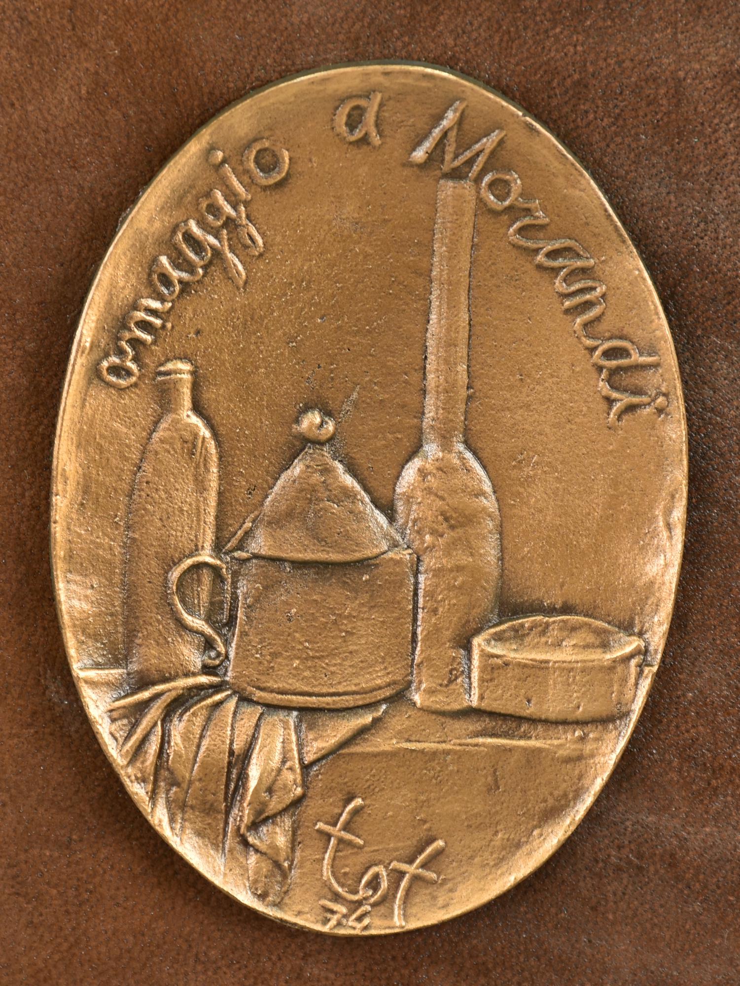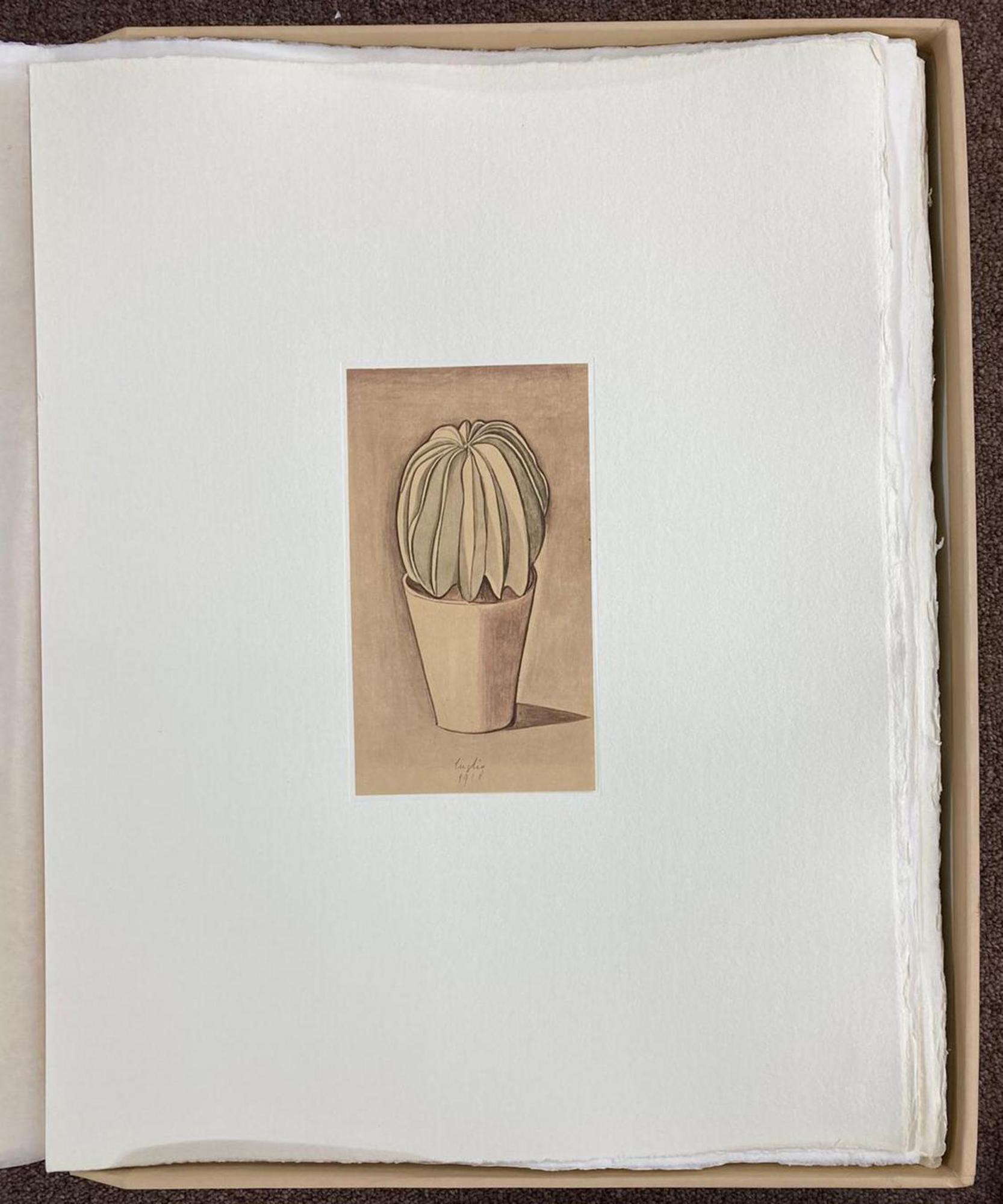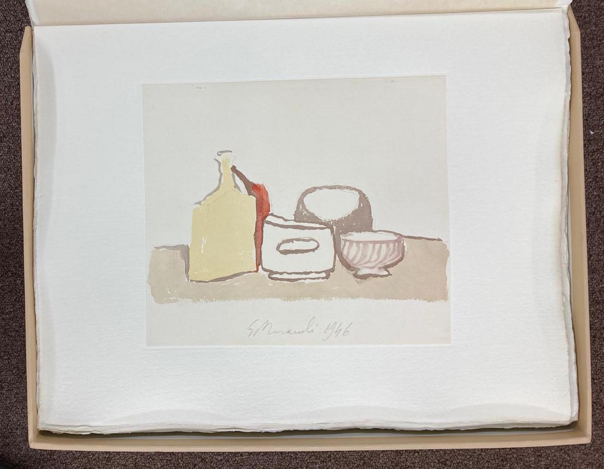 50 tavole, riproduzioni degli acquerelli direttamente sugli originali in offset, a fogli sciolti racchiusi in quartini con titoli e date, custodia editoriale in pelle marrone con placca bronzea sul piatto, eseguita da Amerigo Tot nel 1974. Secondo volume interamente testuale e filigranato "Morandi", saggio di Valerio Zurlini "Il tempo di Morandi"; tre saggi di Renato Guttuso "Giorgio Morandi", Jean Leymarie "Morandi, les acquarelles" e John Rewald "Morandi remembered"