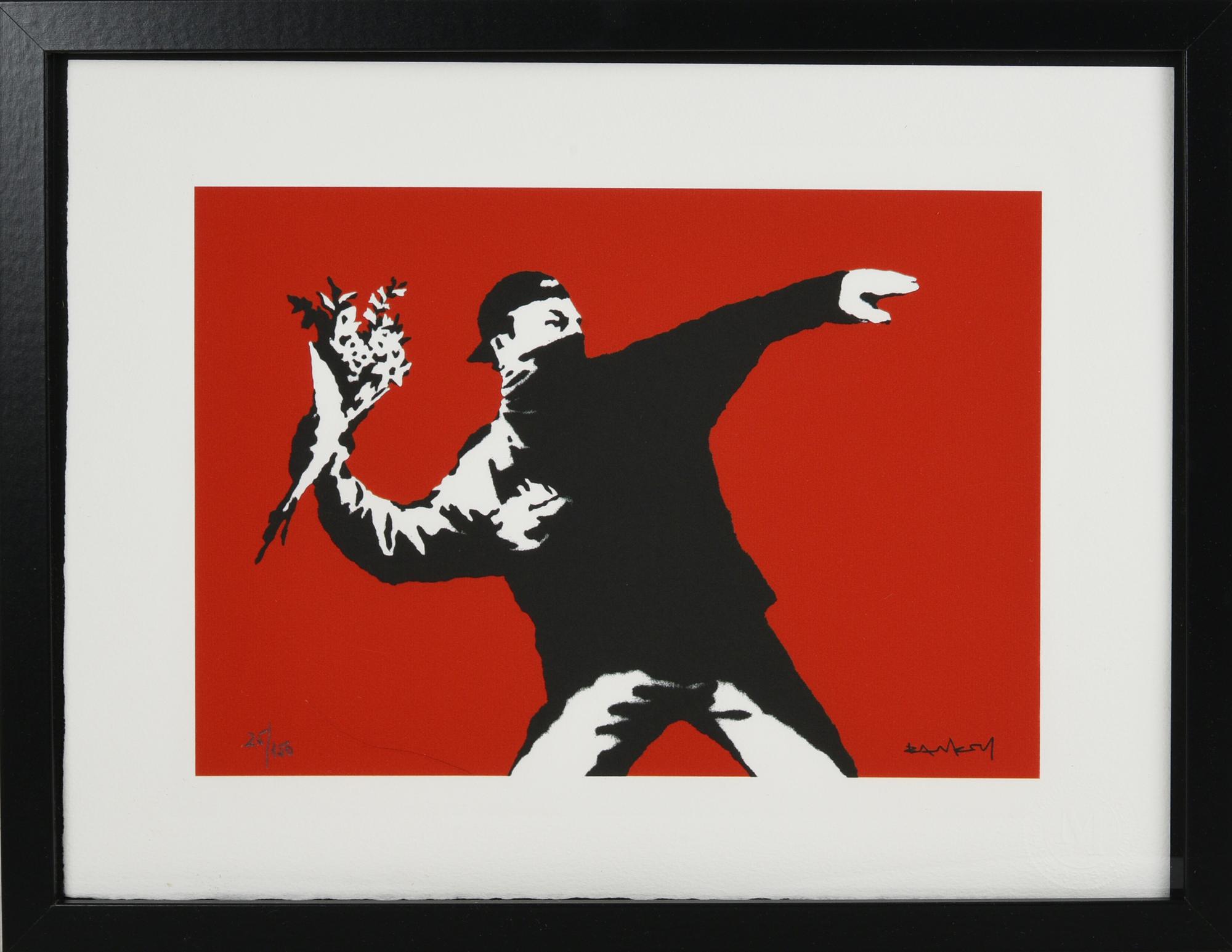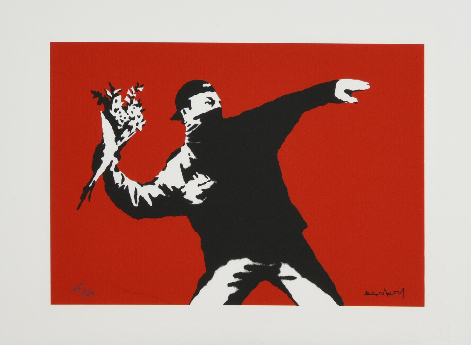 Da Banksy LOVE IS IN THE AIR (RED EDITION) eliografia su carta, cm 28,5x38;...