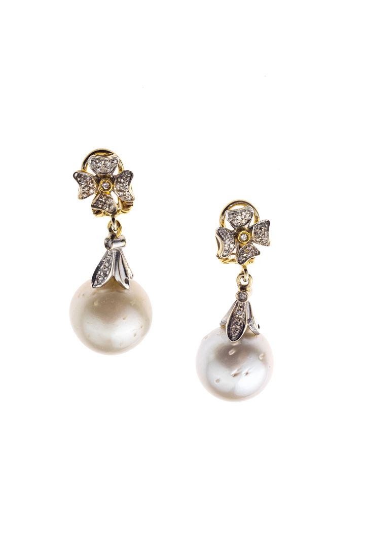 in oro giallo e bianco con fiori ai lobi e corpo in diamanti taglio brillante per totali ct 0,20 ca, terminanti con due perle australiane del diam di mm 16,2 ca