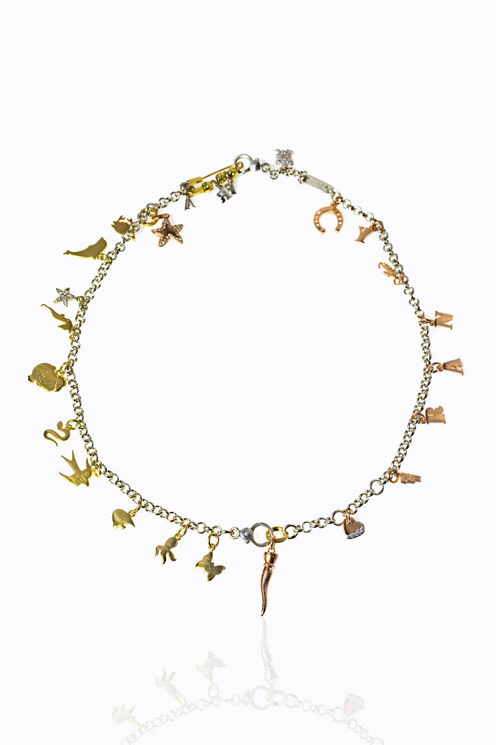 Girocollo in argento composto da due bracciali modificati della linea Dodo, con 9 charms linea Dodo in oro 9 Kt raffiguranti un corno portafortuna, un cuoricino con diamanti taglio brillante, una stella con diamanti, un ferro di cavallo, sei lettere dell'alfabeto (F-R-A-N-C-Y); una rana con diamanti taglio brillante; una stellina con diamanti taglio brillante; nove Dodo in oro giallo 18 Kt raffiguranti un granchio, un cavalluccio marino, un dodo, un delfino, un serpente, una rondine, un pesce, un polipo e una farfalla.