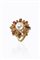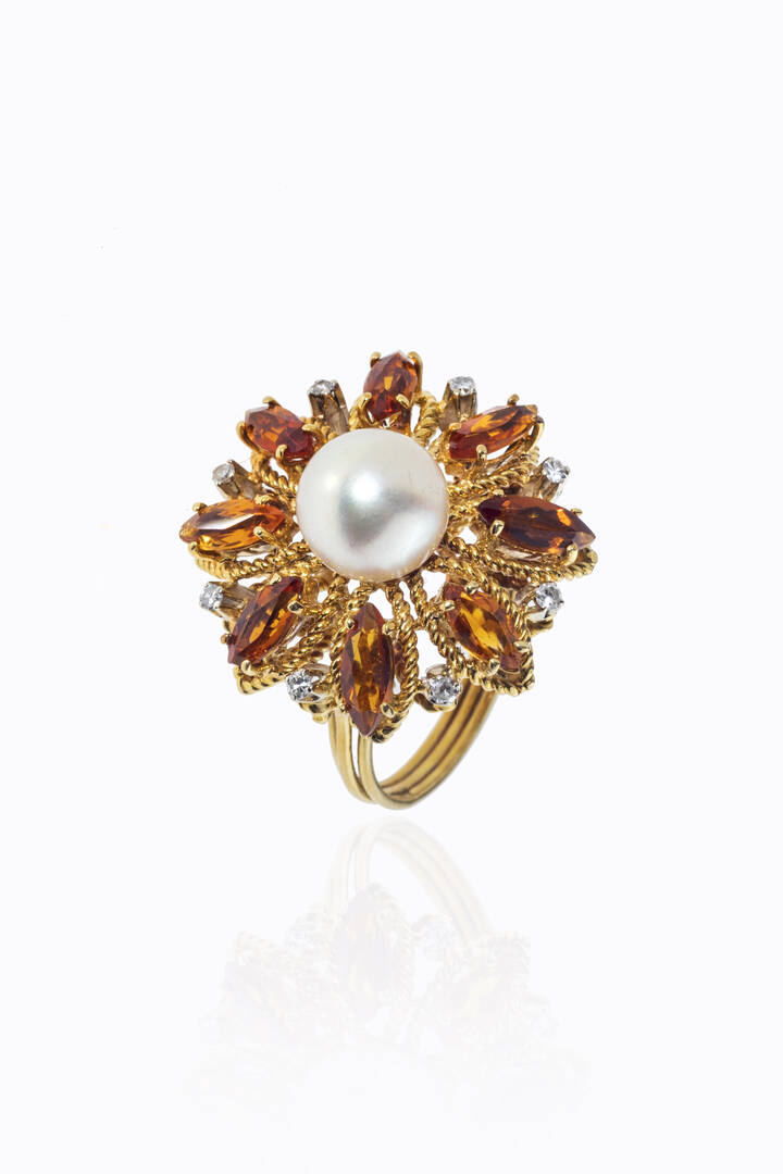 in oro giallo, sommità rotonda con perla giapponese centrale del diam. di mm 8,5; quarzi citrini taglio navette sintetici e diamanti taglio 8/8 per totali ct 0,10 ca