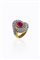 in oro giallo, sommità ovale in oro bianco, con al centro rubino taglio cabochon di ct 3,0 ca e pavé di diamanti taglio brillante per totali ct 1,60 ca