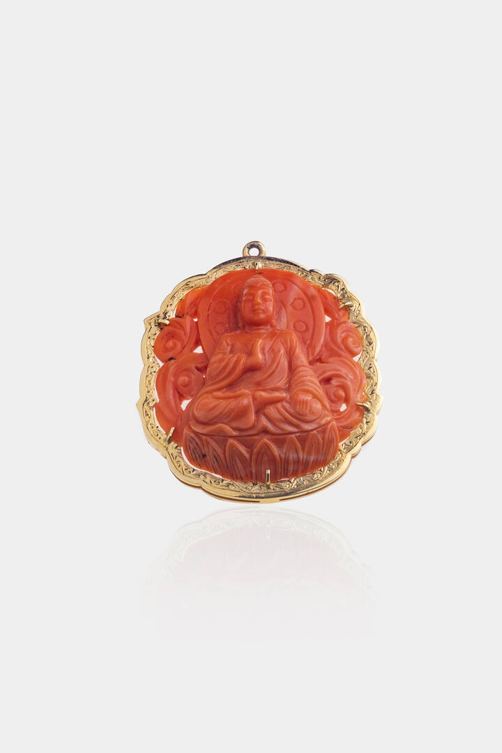 in corallo inciso raffigurante Budda, montato in oro giallo.