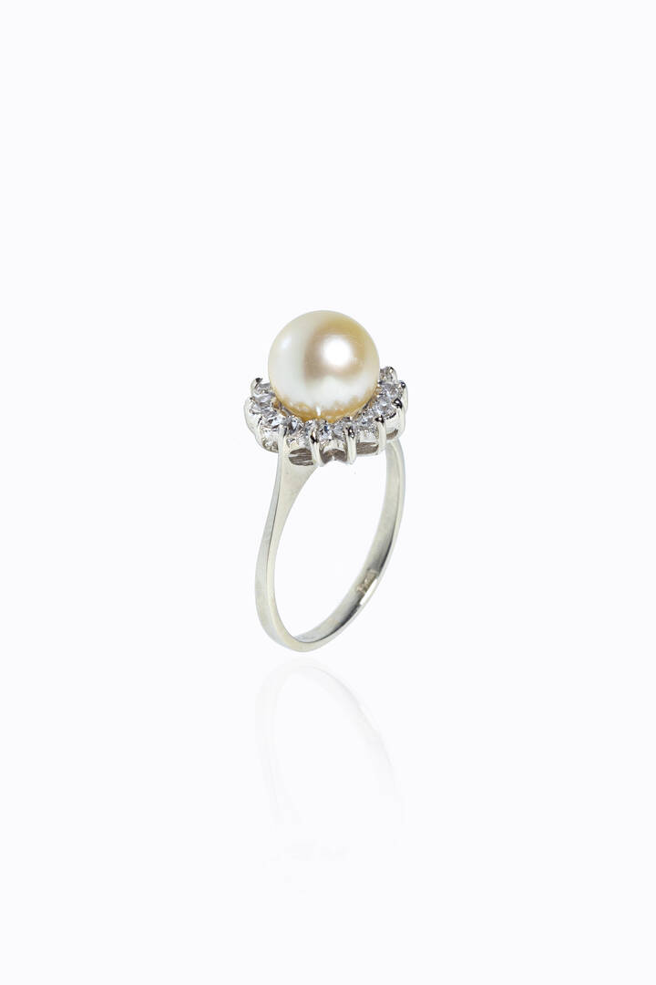 in oro bianco con perla giapponese centrale del diam. di mm 8 e contorno pietre sintetiche