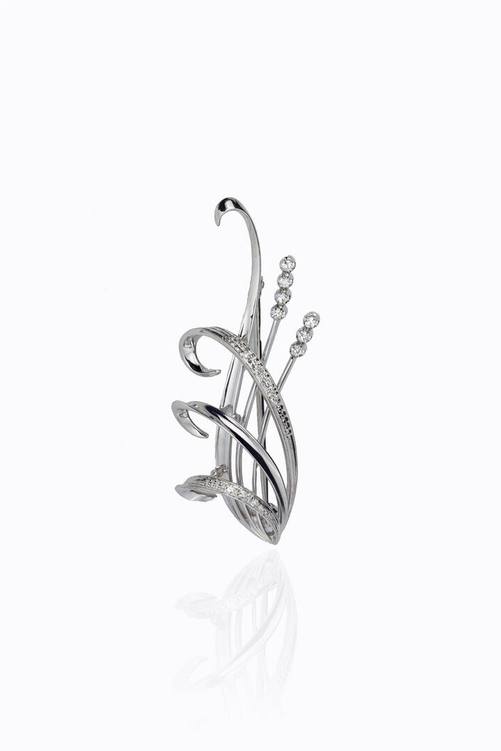 in oro bianco, anni '50, a volute, con diamanti taglio 8/8 per totali ct 0,15 ca