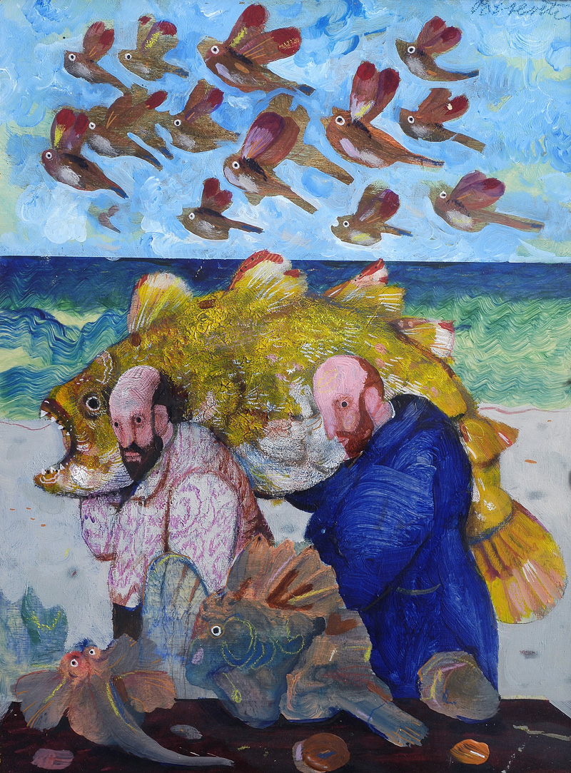 Antonio Possenti (Lucca, 1933) UOMO CON PESCI Olio su tavola, cm. 30x40 Firma...