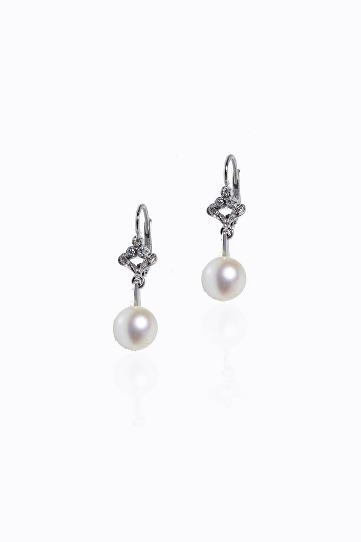 in oro bianco, a monachella, con due perle giapponesi del diam. di mm 8,2 ca pendenti e diamanti taglio 8/8 per totali ct 0,05 ca