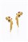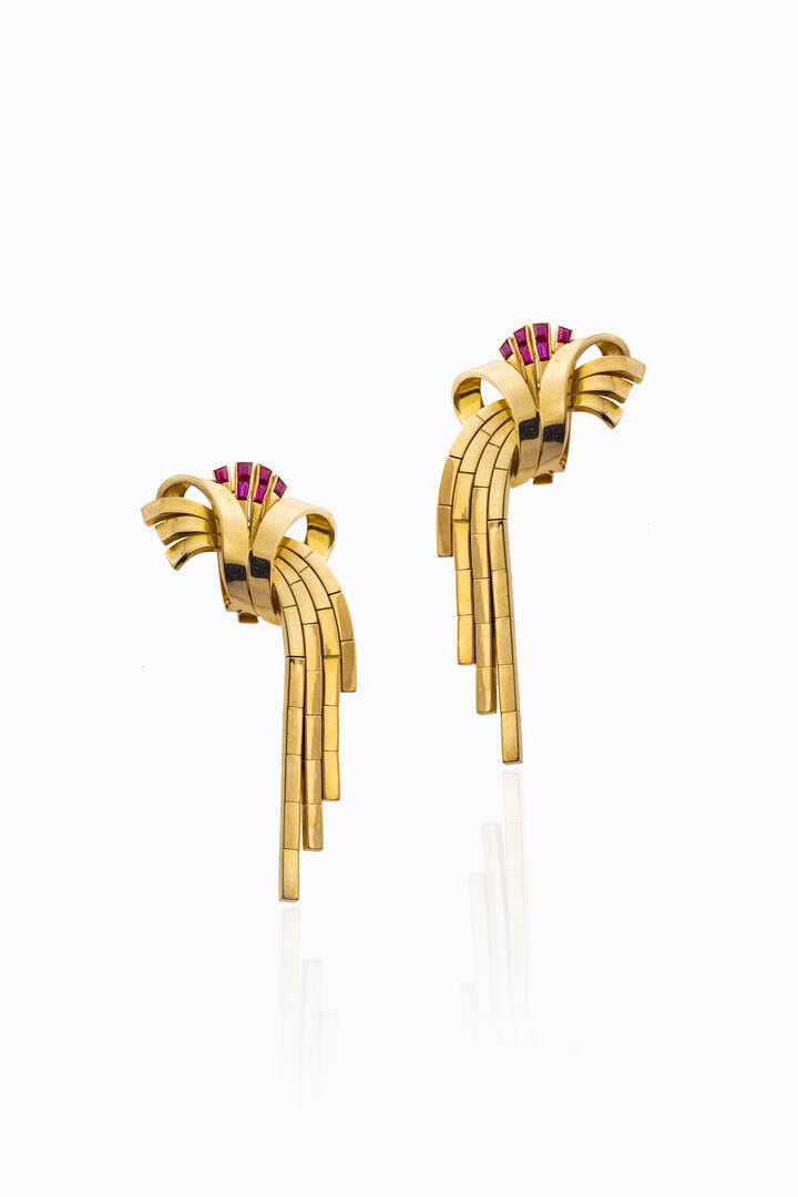 in oro rosa, anni '40, a clip, con volute terminanti con frange. Rubini sintetici a decoro