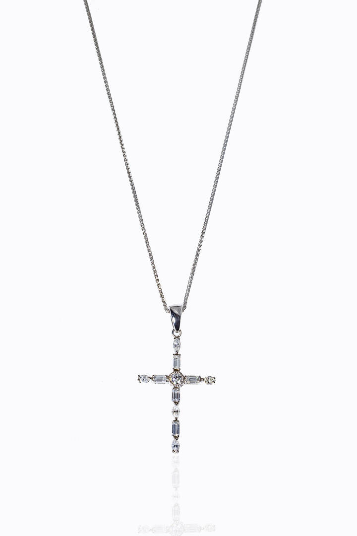 in oro bianco a forma di croce con diamanti taglio brillante, baguette e navette per totali ct 0,91ca, probabile colore G-H, purezza IF-VVS