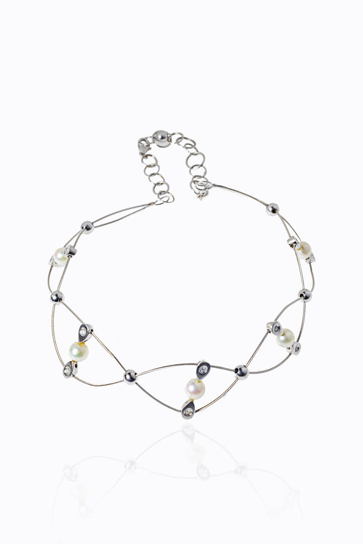 in oro bianco composto da due fili intrecciati, trattenenti al centro gocce con diamanti taglio brillante per totali ct 0,10 ca e perline del diam. di mm