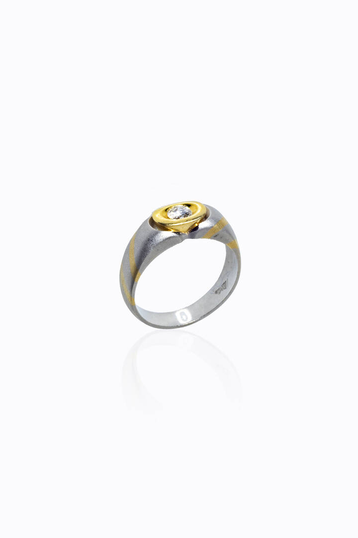 in oro platino e giallo satinati, al centro diamante solitario taglio brillante di ct 0,25 ca
