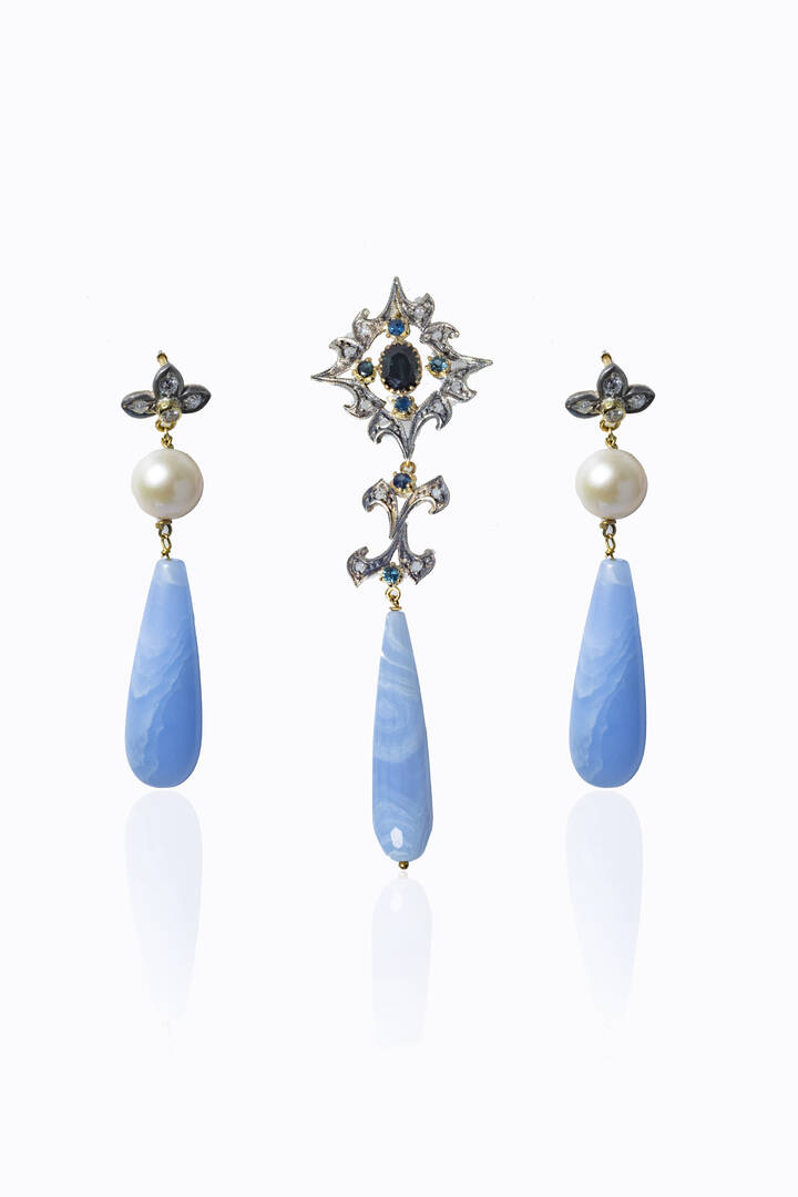 -Ciondolo in oro giallo ed argento con rosette di diamanti per totali ct 0,20 ca, sette zaffiri per totali ct 1,80 ca, terminante con una goccia di calcedonio azzurro. Peso gr 10