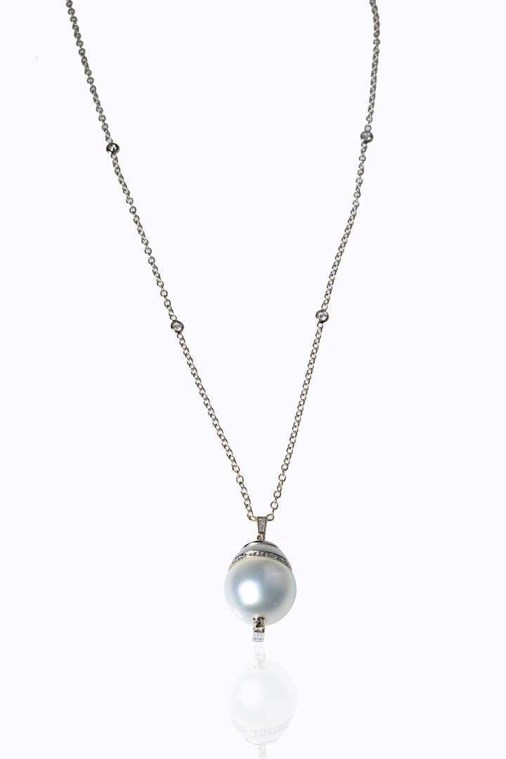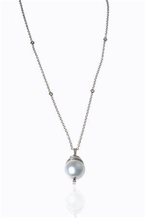 in oro bianco con perla australiana a pera; al centro fila di diamanti taglio 8/8 per totali ct ca
