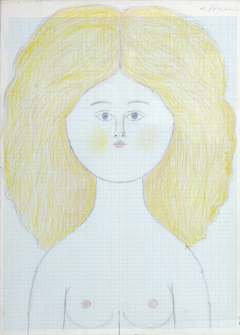 Antonio Bueno (Berlino, 1918 - Firenze, 1984) RAGAZZA, 1975 Pastello e matite colorate su carta millimetrata riportata su tela, cm. 40,5x29,5 Firma in alto a destra. Autentica su foto Archivio Antonio Bueno n. 278 F/D